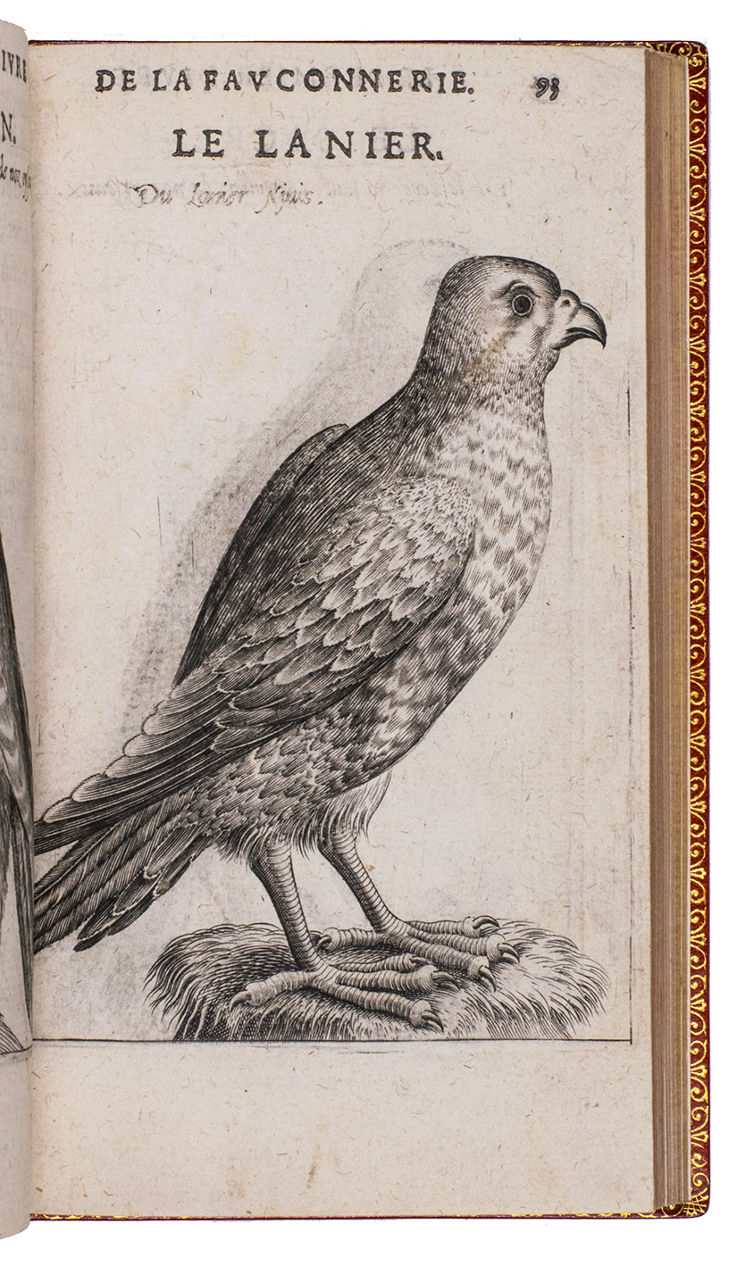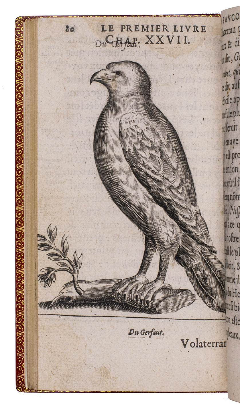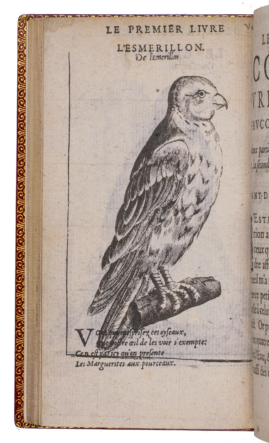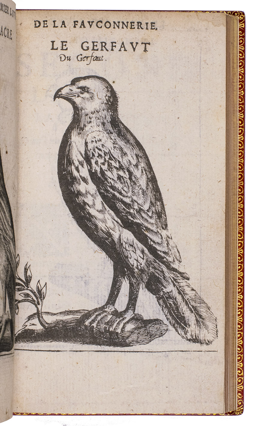 Paris, Jean Houzé, 1599. 8vo. With Houzé's woodcut device, 6 full-page engravings of birds of prey (12.5 x 8.5 cm) plus 3 (of 5) repeats and all on integral leaves. Red goatskin morocco, signed in the foot of the front turn-in by M[arcel] GODILLOT (active as bookbinder 1938-1975), with wide gold-tooled turn-ins and gold fillets on board edge. 272, [8] pp.