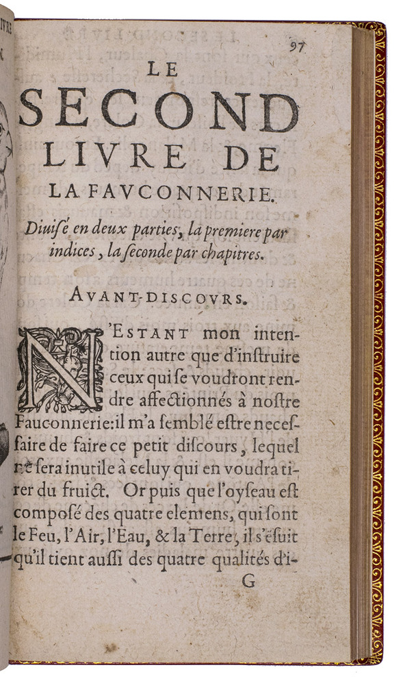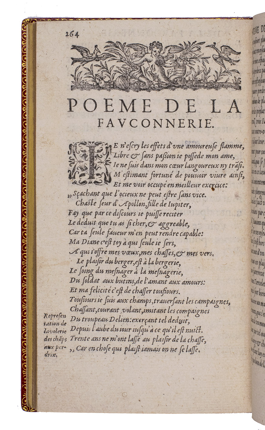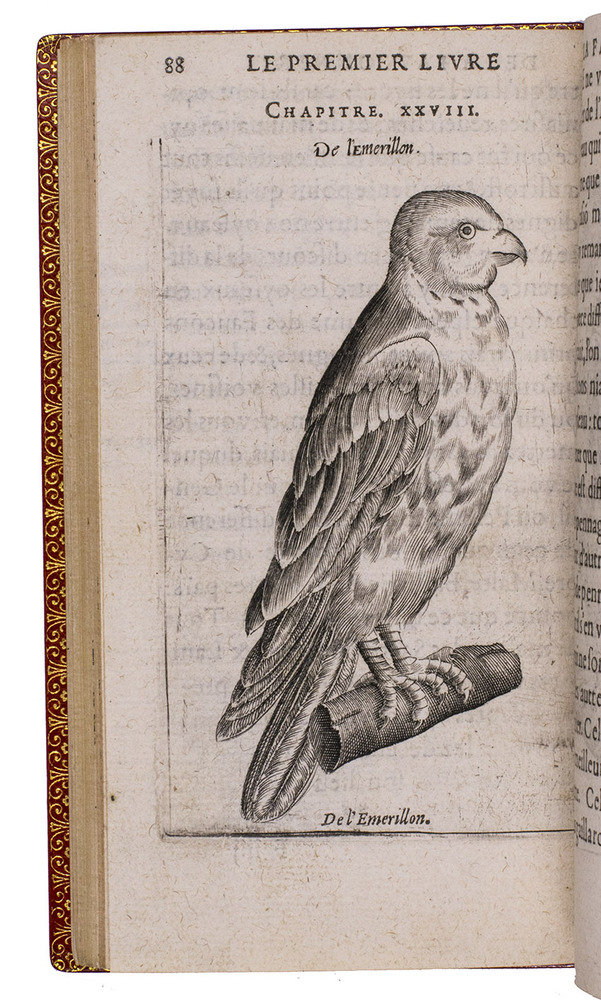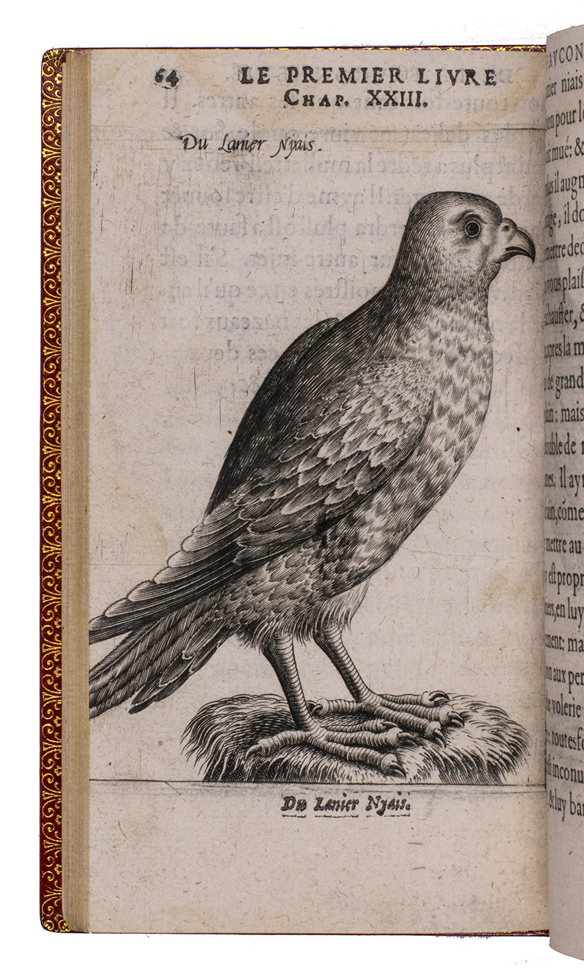 Paris, Jean Houzé, 1599. 8vo. With Houzé's woodcut device, 6 full-page engravings of birds of prey (12.5 x 8.5 cm) plus 3 (of 5) repeats and all on integral leaves. Red goatskin morocco, signed in the foot of the front turn-in by M[arcel] GODILLOT (active as bookbinder 1938-1975), with wide gold-tooled turn-ins and gold fillets on board edge. 272, [8] pp.