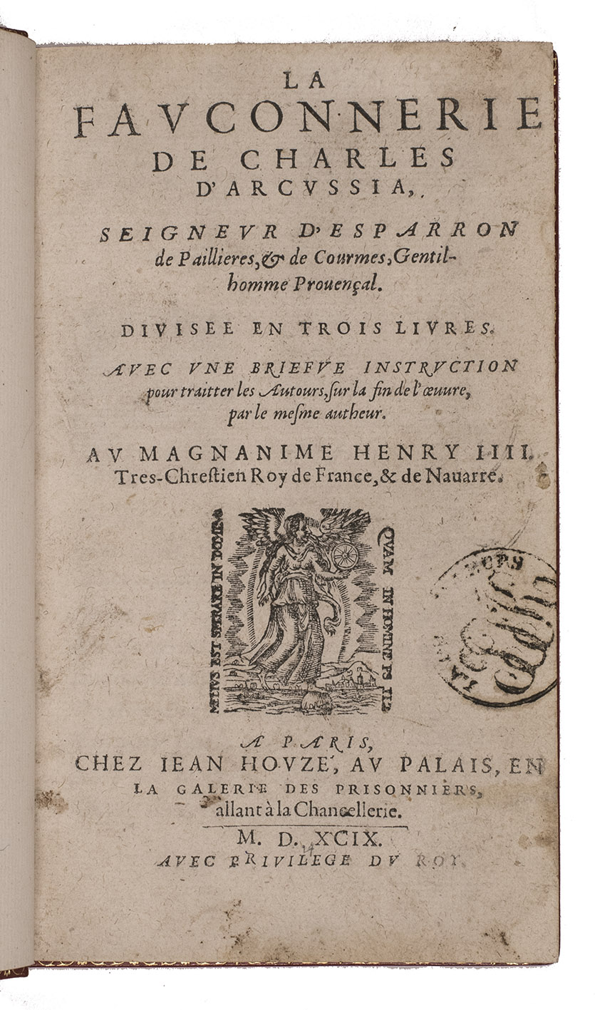 Very rare second edition, one year after the equally rare first edition, of one of the earliest French treatises on falconry and hawking, by Charles d'Arcussia (1554-1628), falconer to King Henri IV (and later to Louis XIII), who dedicates it to the king. "The work is much esteemed on account of its originality and the amount of information it contains" (Harting), "the outcome of long practice and an astonishing amount of research work in every subject connected with [Arcussia's] favourite sport [hawking]" (Schwerdt). Jean Tholosan published the first edition at Aix-en-Provence in 1598, but the USTC records only 3 copies of each, all in French libraries except for a copy of the present edition at the Wellcome Library in London. The six birds of prey illustrated are described as: De l'espece du faucon premier de noz oyseaux, Du Lanier Nyais, Du sacre, Du Gerfaut, De l'Emerillon and De l'Autour Nyais.