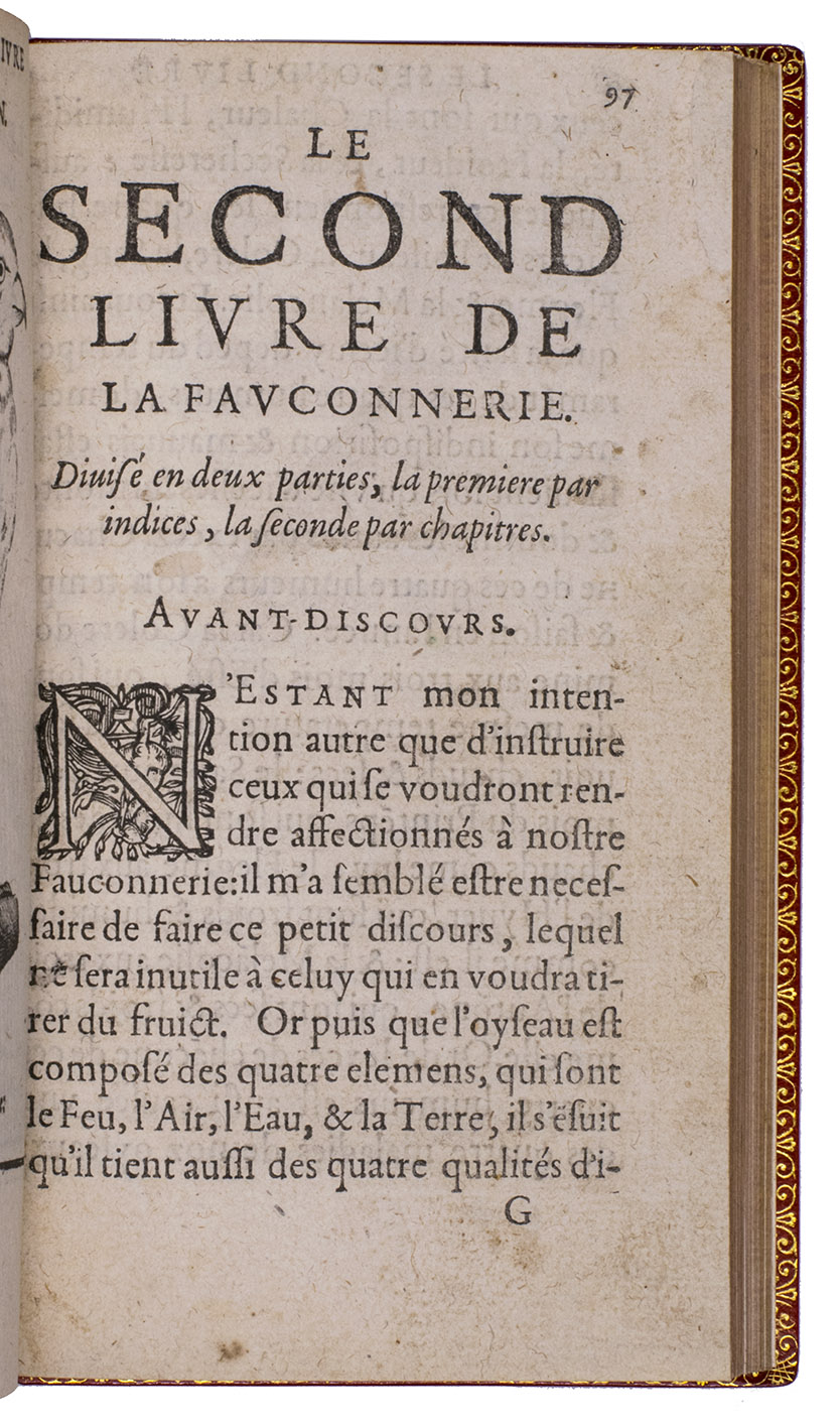 With an 18th-century endleaf, a ca. 1800(?) monogram stamp on the title-page and a modern armorial bookplate. Washed and lacking F8 (supplied in facsimile), but that leaf contains only repeats of 2 engravings plus their captions and a 4-line verse, with no other text. Three other plates are slightly shaved, affecting the tip of one bird's tail (present in the repeat plate), the beak of another and a small bit of foliage in a third plate, a corner torn off 1 leaf (affecting one shoulder note), a small hole in another, a worm hole in the foot margin of the last few leaves and a faint water stain in the fore-edge margin of a few leaves. Still generally in good condition, the binding fine. Very rare classic of falconry and hawking. Harting, Bibl. accipitraria 153 note; Nissen, IVB 35; Ronsil 3120; Schwerdt, p. 41; Souhart, col. 16; Thiébaud, col. 28 & supp. col. 1050; USTC 20901 (3 copies); Wellcome I, 388; cf. Lindner, Bibl. Jagdliteratur 11.0077.01; for the binder Godillot: Fléty, p. 82.