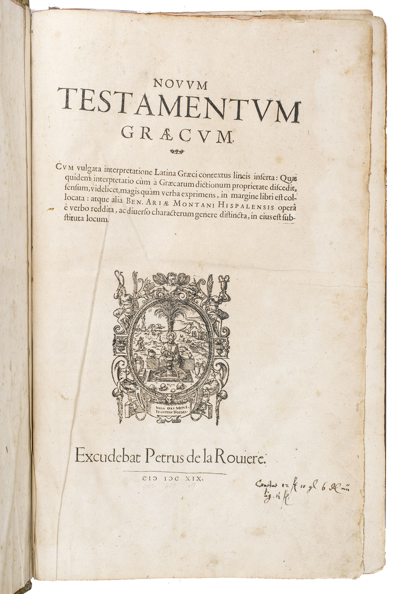 Scarce later edition of the famous Antwerp Polyglot, in a beautiful contemporary binding. The present work contains the New Testament with the Apocrypha in Greek, and the Old Testament in Hebrew, both with an interlinear Latin translation. The Greek work starts at the beginning of the volume and the Hebrew at the end. The Greek work is also supplemented with a correction of the Vulgate. The present edition is quite scarce, as we have only been able to find one other copy in sales records of the past hundred years which contains both the Greek and Hebrew parts.