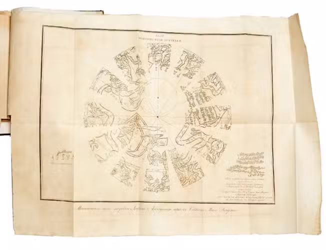 First and only edition of a rare study describing and illustrating (with all elements needed to construction a 3D facsimile) one of the most splendid Islamic globes ever made, a celestial globe with Cufic lettering in the Borgia Museum at Velletri (now at the Museo Nazionale di Capodimonte in Naples). The Syrian mathematician Qaysar ibn Abu al-Qasim (1178/79-1251) made the bronze globe with inlaid silver and copper (22 cm diameter) in 622 AH (1225/26 CE) for the fourth Ayyubid Sultan of Egypt, al-Malik al-Kamil Muhammad (ca. 1177-1238).