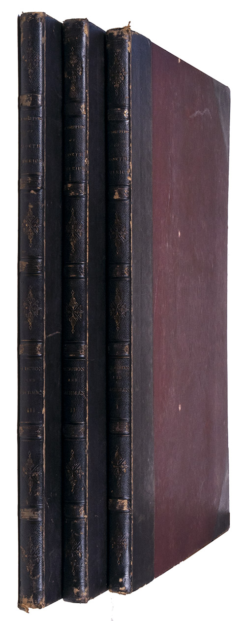 New York, John James Audubon, 1845-1848. 3 volumes. Large 1mo (70 x 55 cm). With 150 striking coloured plates, all lithographed on stone, printed and coloured by J.T. Bowen of Philadelphia, after drawings by after John James and John Woodhouse Audubon, and the backgrounds after Victor Audubon. Each volume also with a title page and a list of contents. Late 19th-century black morocco, with gold-tooled spine, red cloth sides and marbled endpapers.