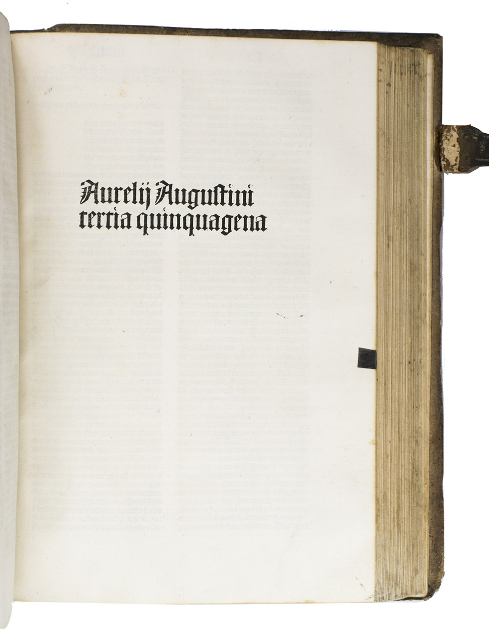 With an owner's inscription on the front pastedown, an annotation in the upper outer corner of the recto of the first blank flyleaf, a (partially) scraped out annotation in the bottom margin of the first text page, and an annotation on the verso of the last text leaf. The boards are rubbed and scraped, strongly affecting the clarity of the blind-tooling, the bottom edges and corners of the boards are scuffed and a tear in the leather at the bottom corner of the back board has been repaired, the edges of the book block are somewhat dust soiled. The gutter between the first two blank flyleaves is cracked, exposing the sewing supports and leather of the binding, a water stain in the bottom corner of the first 4 leaves (including the 2 blank flyleaves), a torn corner on leaf R7 of the 2nd part and leaf (5)6 of the 3rd part, margins foxed throughout. Otherwise in good condition. BM, Catalogue of German books, p. 54; BM, General catalogue, p. 530; Goff A-1243; GW 2909; Hain-Copinger 1971; IDL 519; ISTC ia01272000; Proctor; 7582; USTC 743124; cf. McCarthy, An ecclesiology of groaning: Augustine, the psalms, and the making of Church. In: Theological studies, vol.66 (1), p.23-48, 2005.