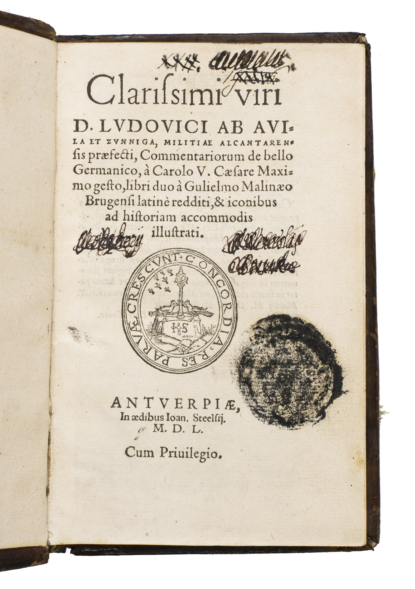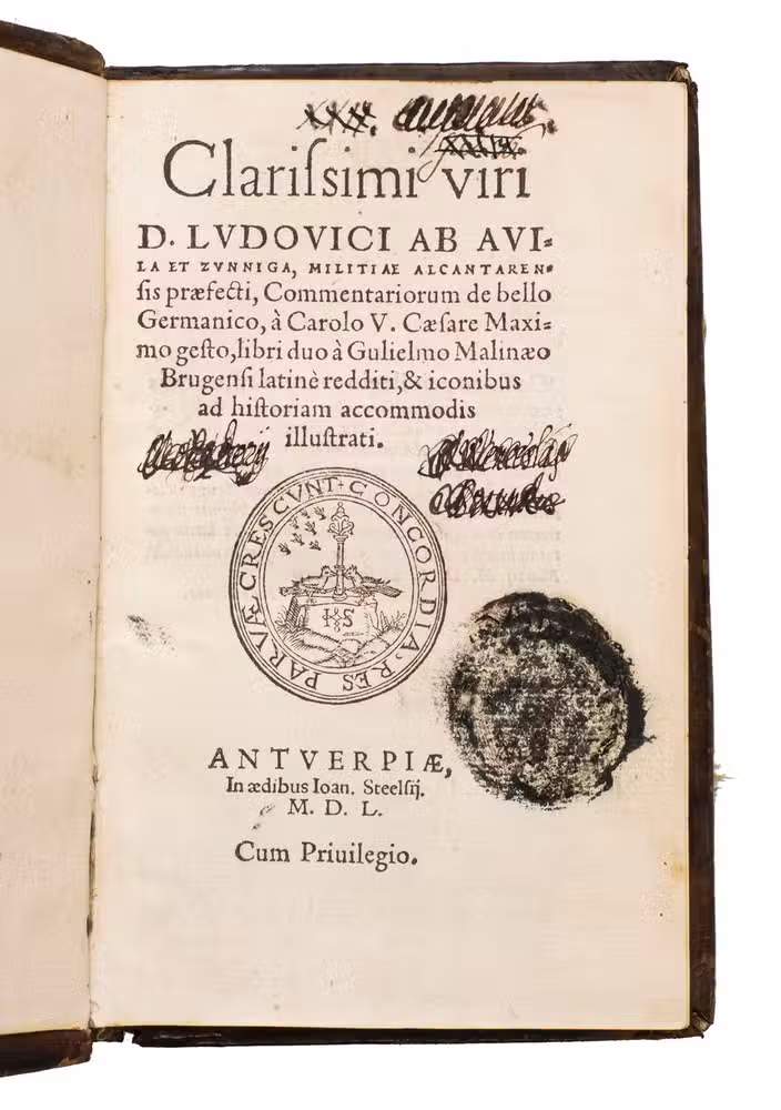 The Spanish historian Luis de Avila y Zúñinga (1490-ca. 1560) was an ambassador at Rome and later secretary and confidant of Charles V. He accompanied the emperor to Africa in 1541 and Germany in 1546-1547. His work was originally published in Spanish in 1548 in Madrid and Venice with the title Comentario de la Guerra de Alemanis hecha por Carlos V en 1546 y 1547. It gained immediate success and many editions followed, as well as translations in Latin in 1550 (our copy), French (also Antwerp 1550; followed in 1551 and 1552 by two other French translations), German (Wolfenbüttel 1552) and English (London 1555). The Latin translation was made by Willem van Male (Gulielmus Malinaeus) from Bruges (ca. 1500-1560), a Flemish nobleman, humanist and secretary of Charles V, who dedicated his translation to Cosimo de Medici. Three different issues of the 1550 Latin edition were published by Steelsius in the same year, but the present is considered the most complete.