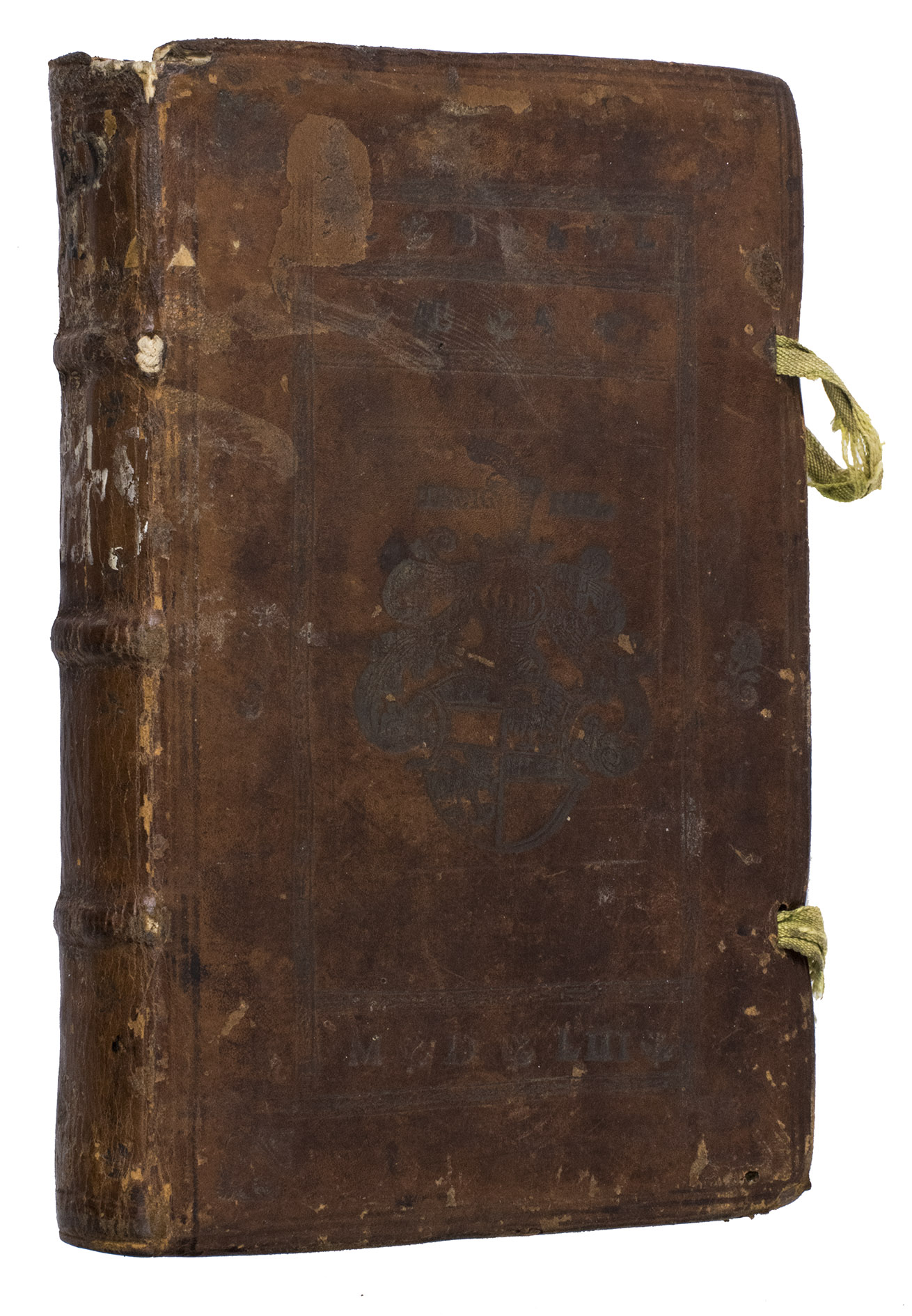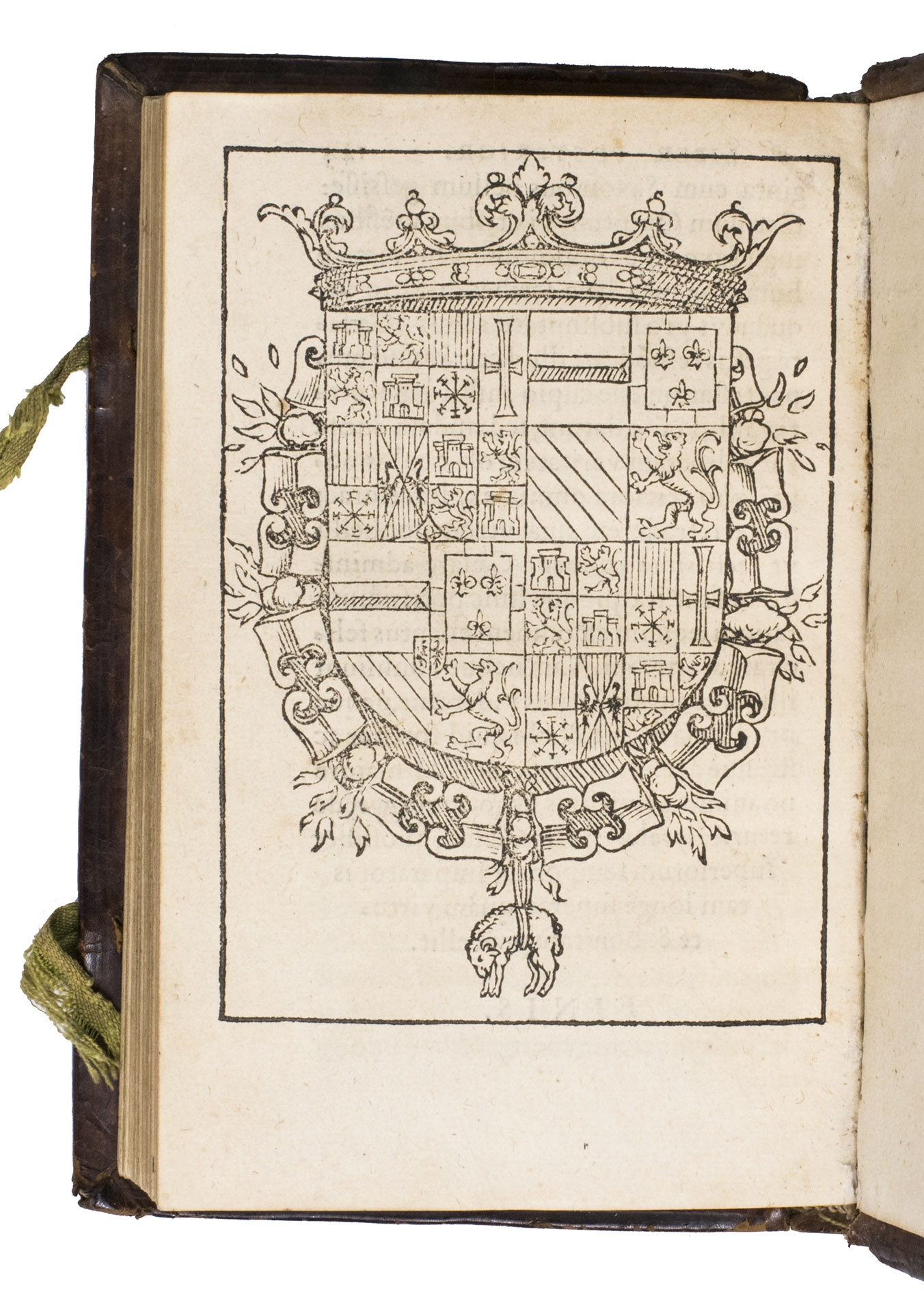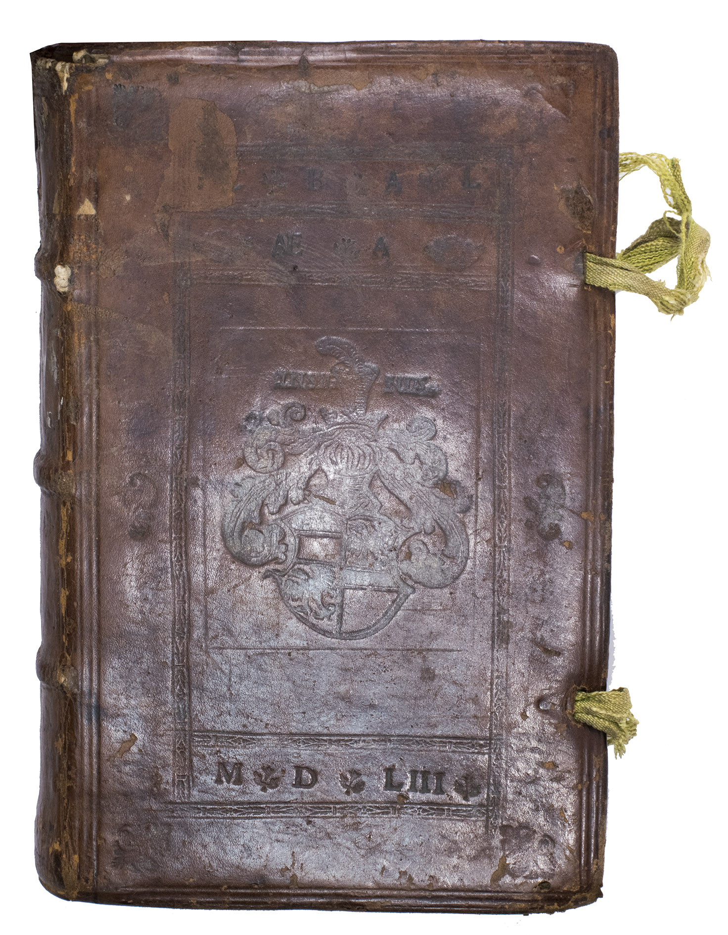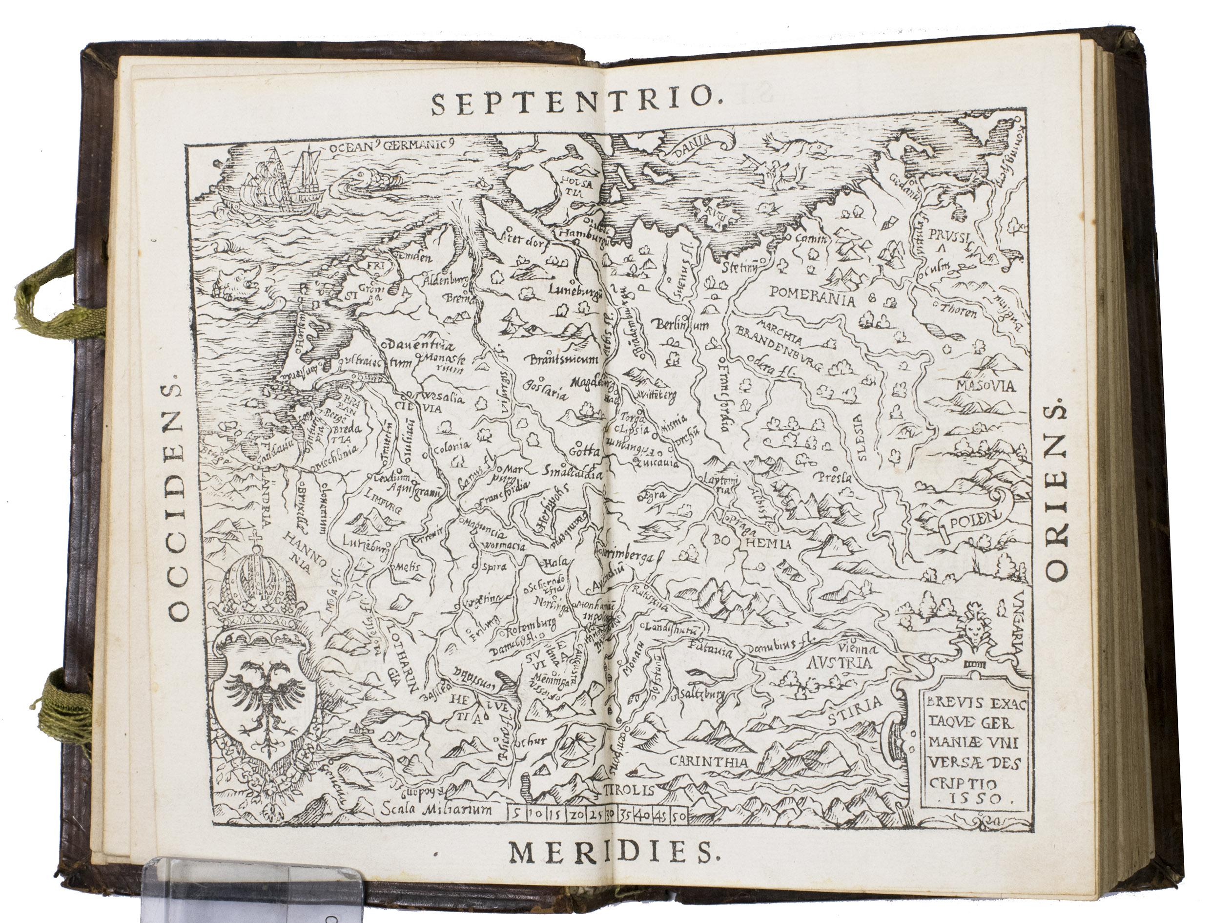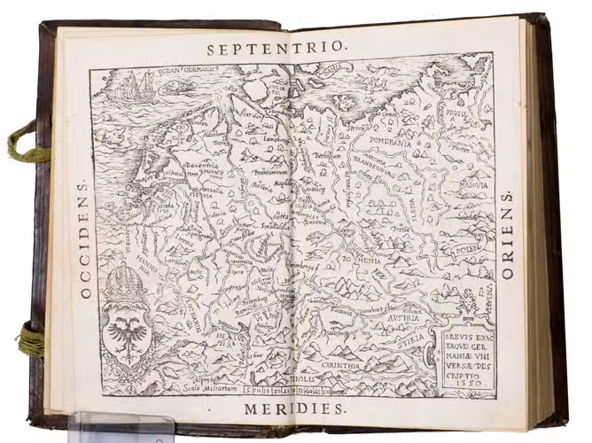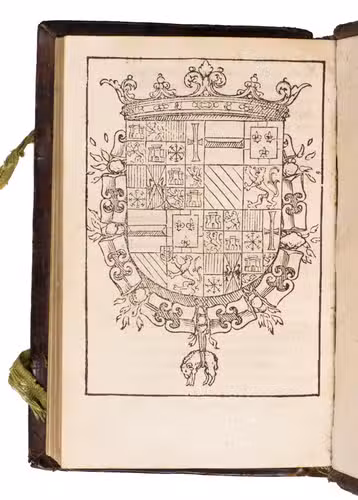 Antwerp, In aedibus Joannes Steelsius, 1550. 8vo. With the printers device of Joannes Steelsius on the title page, 4 woodcut illustrations (a folding view, a double-page map, a double-page view, and a full-page view), and a full-page woodcut coat of arms of Emperor Charles V on the final page. Contemporary blind-tooled brown calf, sewn on 3 supports with the corresponding raised bands on the spine, a paper shelfmark label ("P) in the top compartment and the manuscript number "4" in white ink in the compartment below, the coat of arms of Christopher Popel the elder of Lobcowicz (1513-1590) in the centre of the front board with the initials "C. B. A. L. Ae. A" and the motto "Insigniae" above, and the date "MDLIII" below, surrounded by an ornamental and triple fillet border, on the back a cross built up from four fleur-de-lis ornaments framed by the same border, 4 green closing ties. [8], 144 ll.