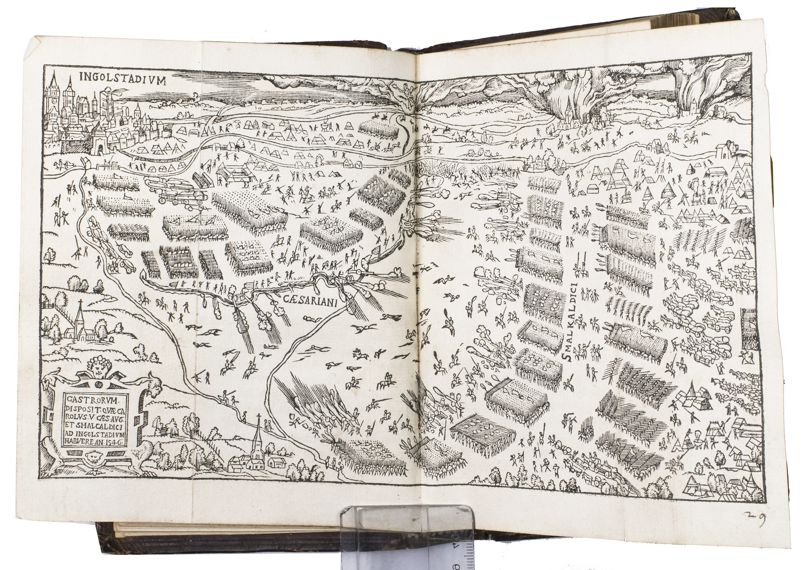 First Latin edition of an eyewitness account of the Schmalkaldic war (1546-1547), complete with all of the woodcuts, and bound in a beautiful armorial binding. It provides detailed accounts of the battles fought by Emperor Charles V against the Lutheran Schmalkaldic League, which was founded by the anti-Habsburg German Protestant Princes, including Elector John Fredrick I of Saxony (1503-1554), at the city of Schmalkalden in 1531. The work is written in a very clear and vivid style. The beautiful woodcuts show the battle near Ingolstad in 1546, a map of Germania (north-western Europe), dated 1550, a view of the battle between the victorious Charles V and John Frederick in April 1547, resulting in the collapse of the Protestant Schmalkaldic League, and a view of Wittenberg on the river Elbe.