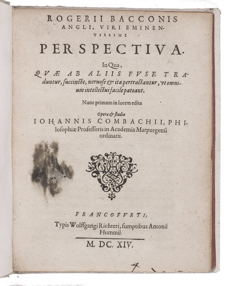 First edition of a famous work on optics by the English natural philosopher and mathematician Roger Bacon (ca. 1220-ca. 1292). Bacon was well read in Arabic and ancient Greek sources on optics and perspective, a subject hardly studied in Europe during the earlier Middle Ages. The main sources for his theories were the writings of Euclid, Ptolemy and Alhazen (Ibn al-Haytham), and he followed Robert Grosseteste concerning the importance of light and in his emphasis on the use of lenses, not only for burning, but also for magnification to aid natural vision. Bacon advised magnifying glasses for old people as well as for people with weak eyes. The Perspectiva belonged to Bacon's Opus maius, compiled in manuscript in 1266-1267. The present edition was based on a medieval manuscript and was edited by Johann Combach (1585-1651), professor of philosophy at Marburg in Germany