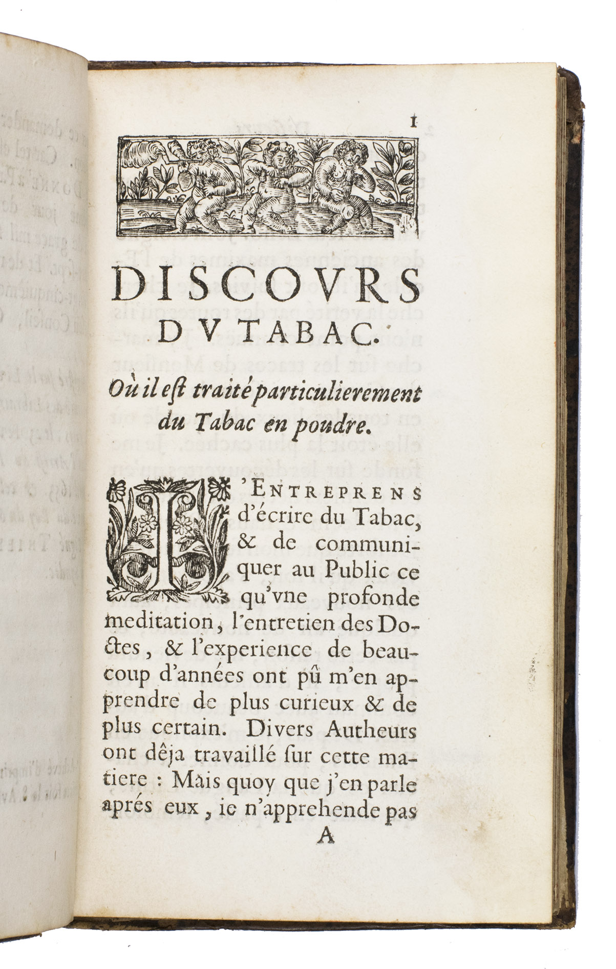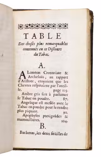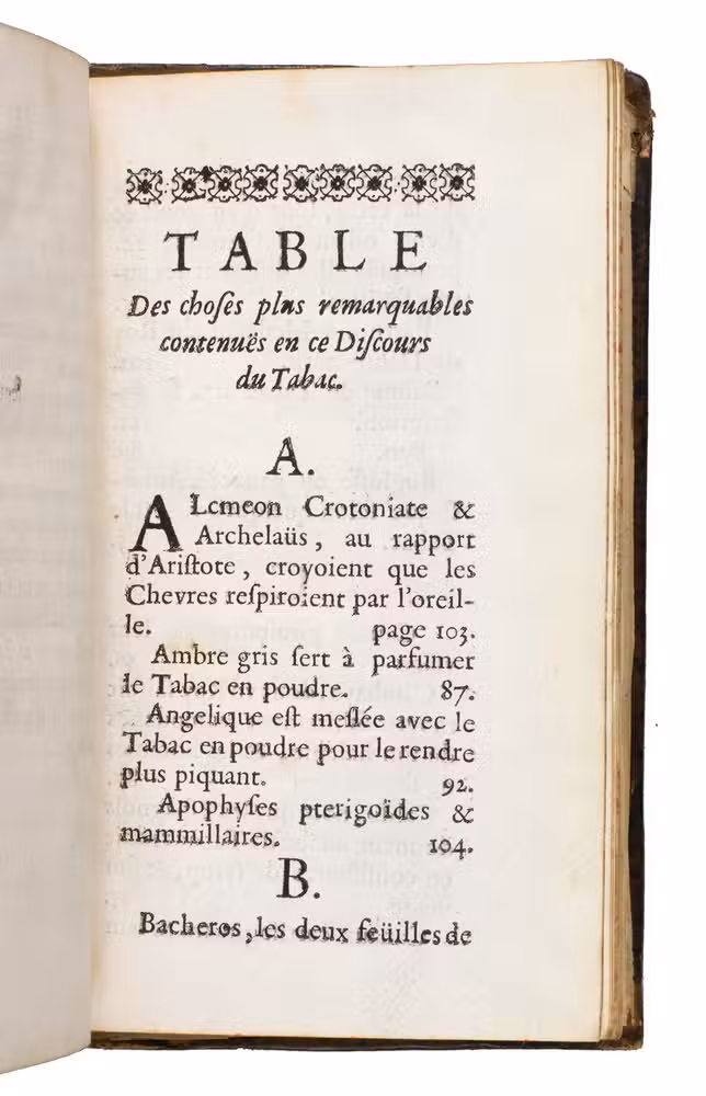 Paris, Martin le Prest, for the author, 1668. 12mo. With 3 half-page woodcut illustrations of tobacco plants in the text and several woodcut borders, initials and headpieces. Contemporary gold-tooled mottled calf. [30], 125, [1 blank], [14], [2 blank] pp.