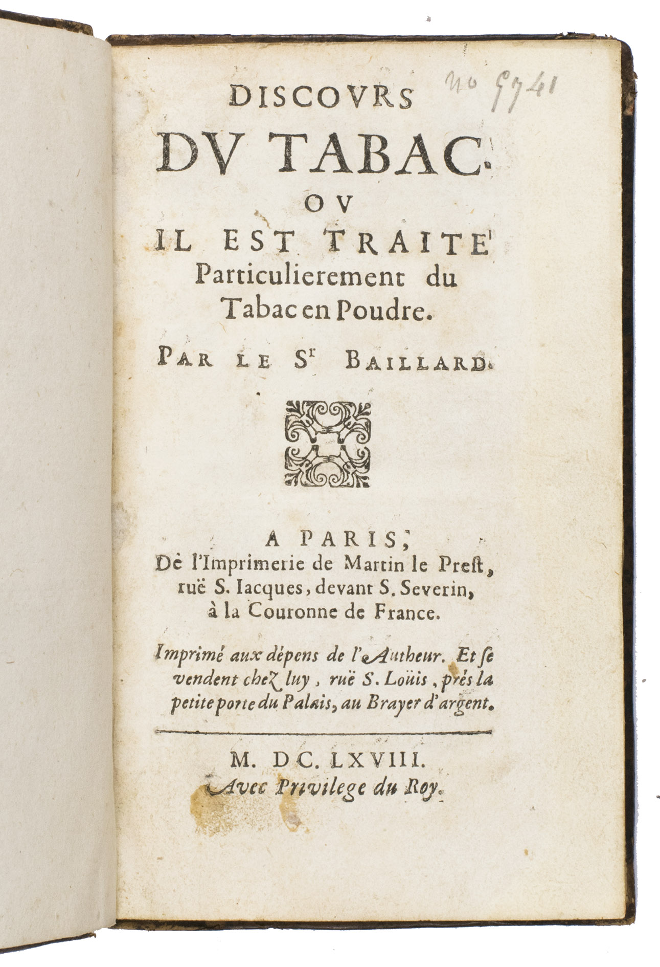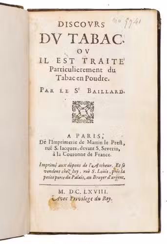 Extremely rare first edition of a popular textbook on snuff and also the first work of its kind by Jean Royer de Prade (1640-1685). We have only been able to trace one copy in institutions and four in sales records. The present copy comes from the library of Maurice Edmond Sailland (1872-1956), also known as Curnonsky and the Prince of Gastronomy, who was one of the most celebrated French writer on gastronomy in the 20th century.