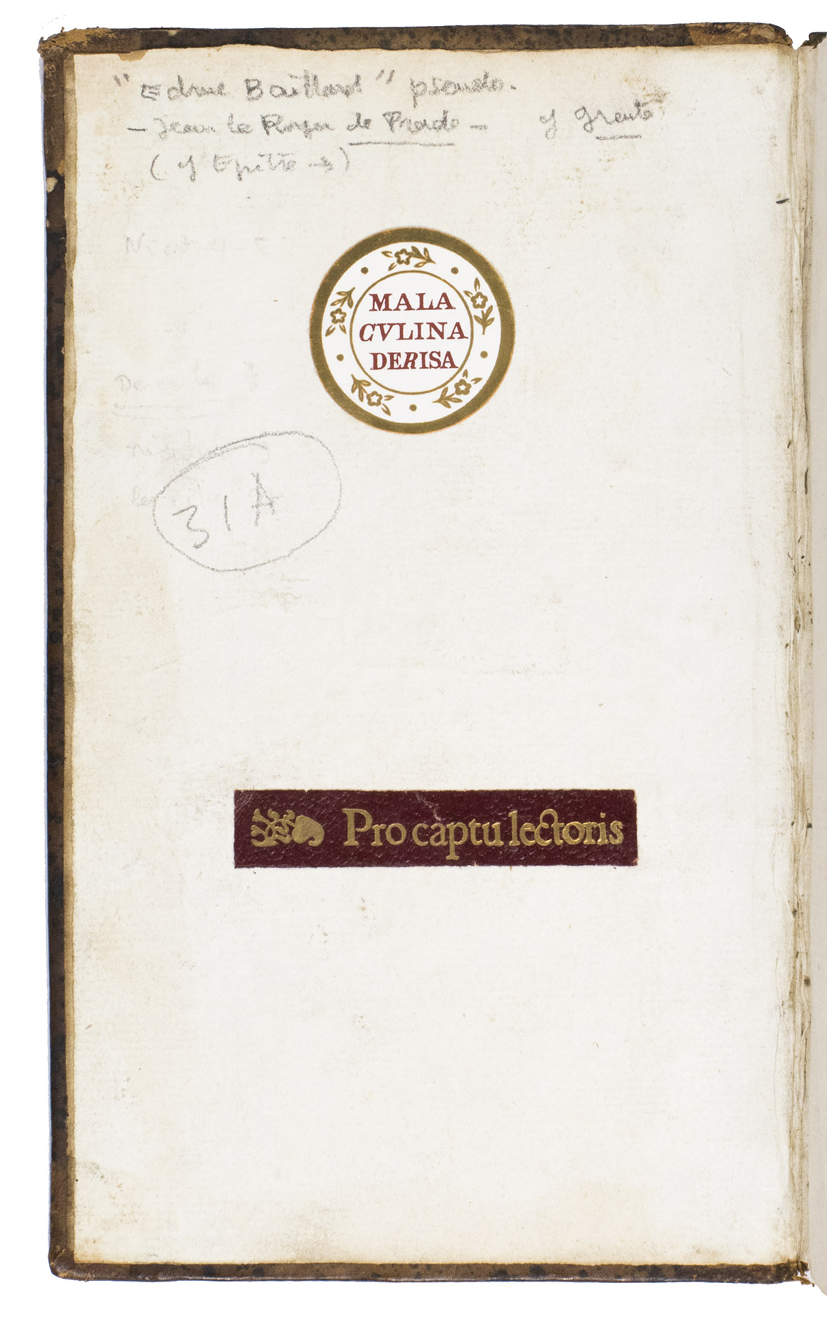 With the round bookplate of Maurice Edmond Sailland (Curnonsky, 1872-1956), and the leather bookplate of Michel de Bry (1890-1970) mounted on the front pastedown. The corners of the boards are scuffed, the boards are somewhat rubbed, the joints are weakened, but the structural integrity of the work is still intact. A water stain in the fore edge margin of the leaves, not affecting any text. Otherwise in good condition. Arents II 300; Krivatsy 9251; Sabin 2758; Quérard, Littéraires dévoilées 452 b; USTC 6131683 (1 copy); not in Chadenat; Church; JCB.