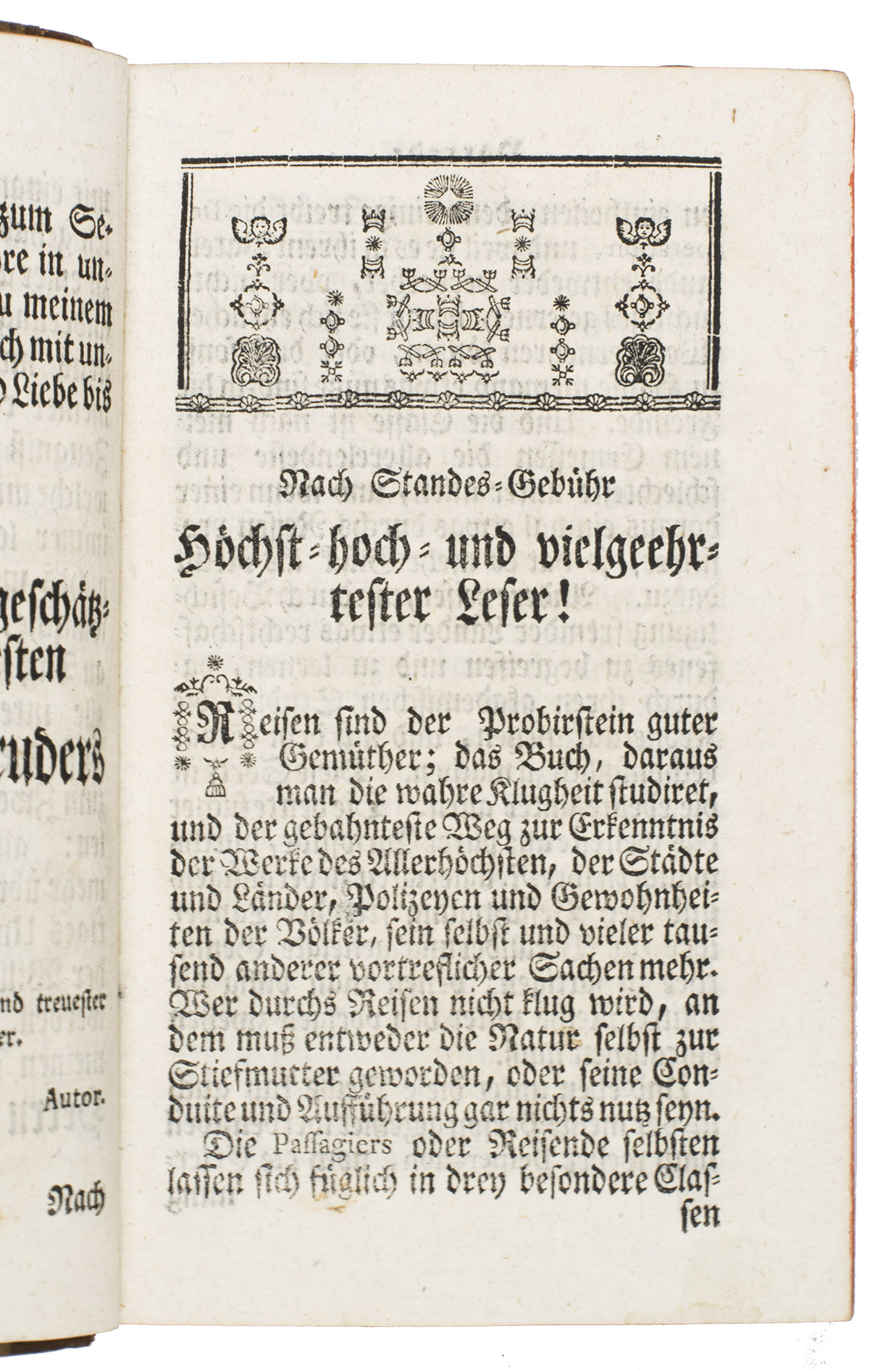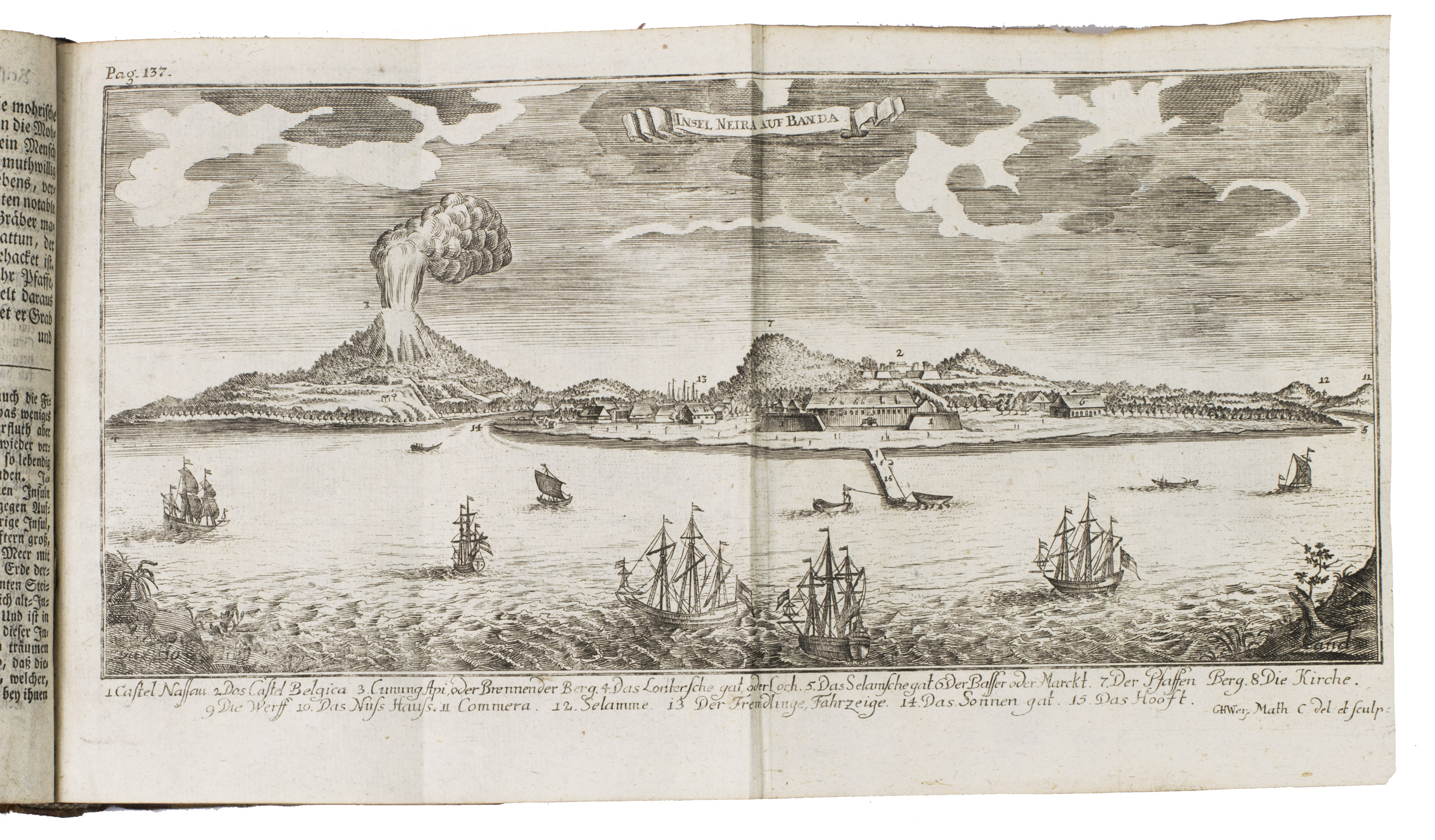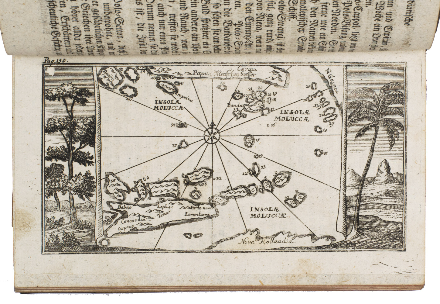 Rare work on the journey of a German officer of the Dutch East India Company (VOC) to the East Indies, with a map of the hitherto undescribed Barat Daya Islands (the "South West" Islands) and the Banda Islands, showing New Guinea and "Nova Hollandia" or Australia on the edges of the map. The work contains fascinating descriptions of not only the East Indies, but also the locations the author passed through on his way there, including towns in Germany, the Netherlands and South Africa. Although at least four editions of this work are known, they are all quite rare. The present edition is not mentioned in any of the relevant reference works and is only avaliable in a few libraries, according to WorldCat. We have also only been able to find one other copy in sales records of the past hundred years.