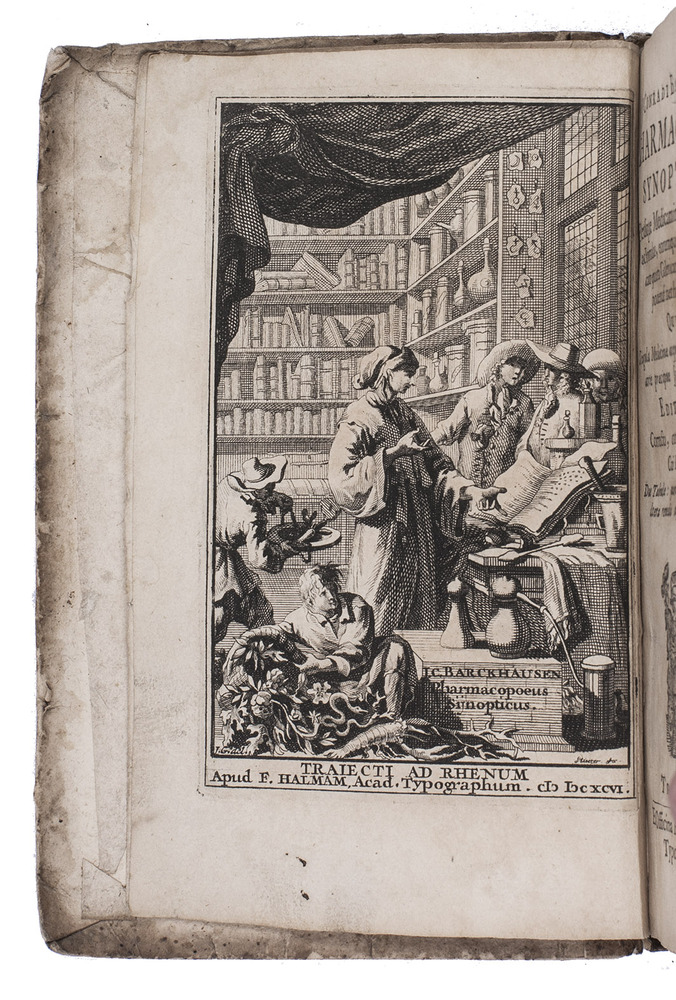 Utrecht, François Halma, 1696. 8vo. With engraved frontispiece showing the interior of an apothecary shop by Sluiter after J.G., Halmas woodcut device, head- and tailpieces and initials. Contemporary paper over thin boards. [16], 250, [6] pp.