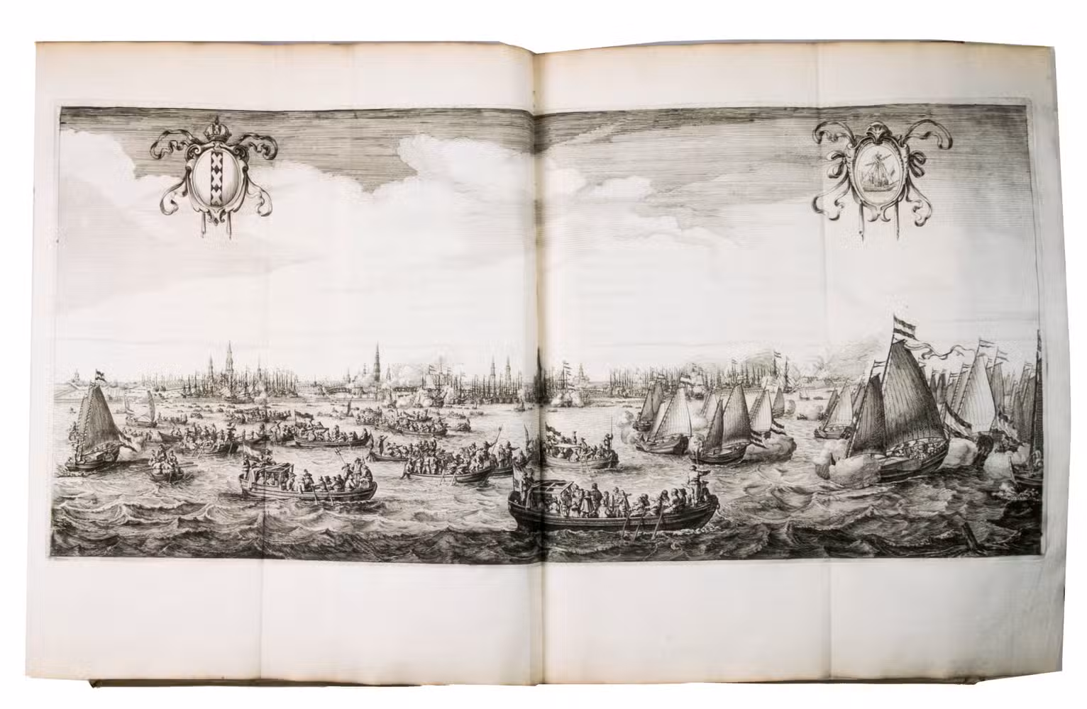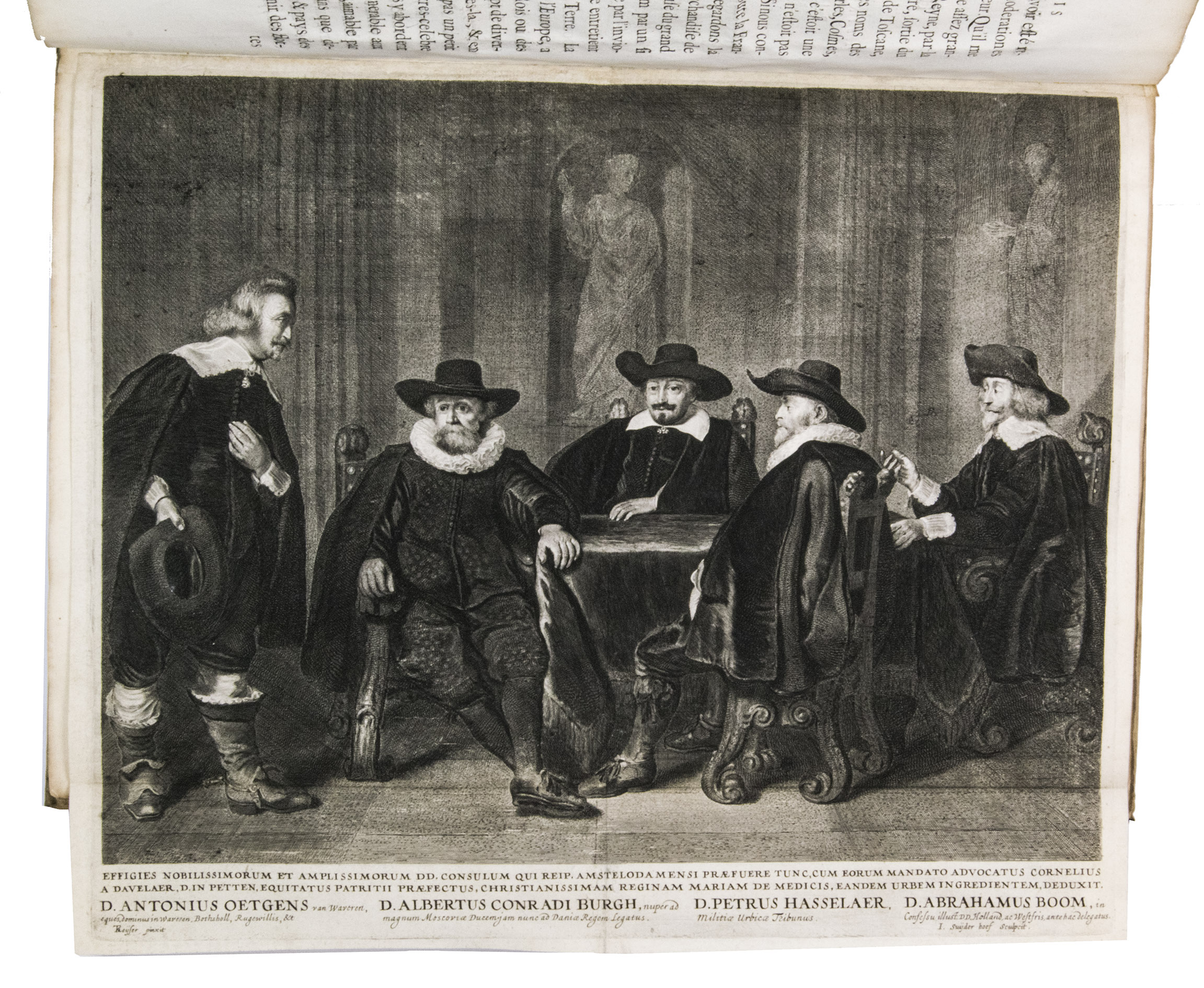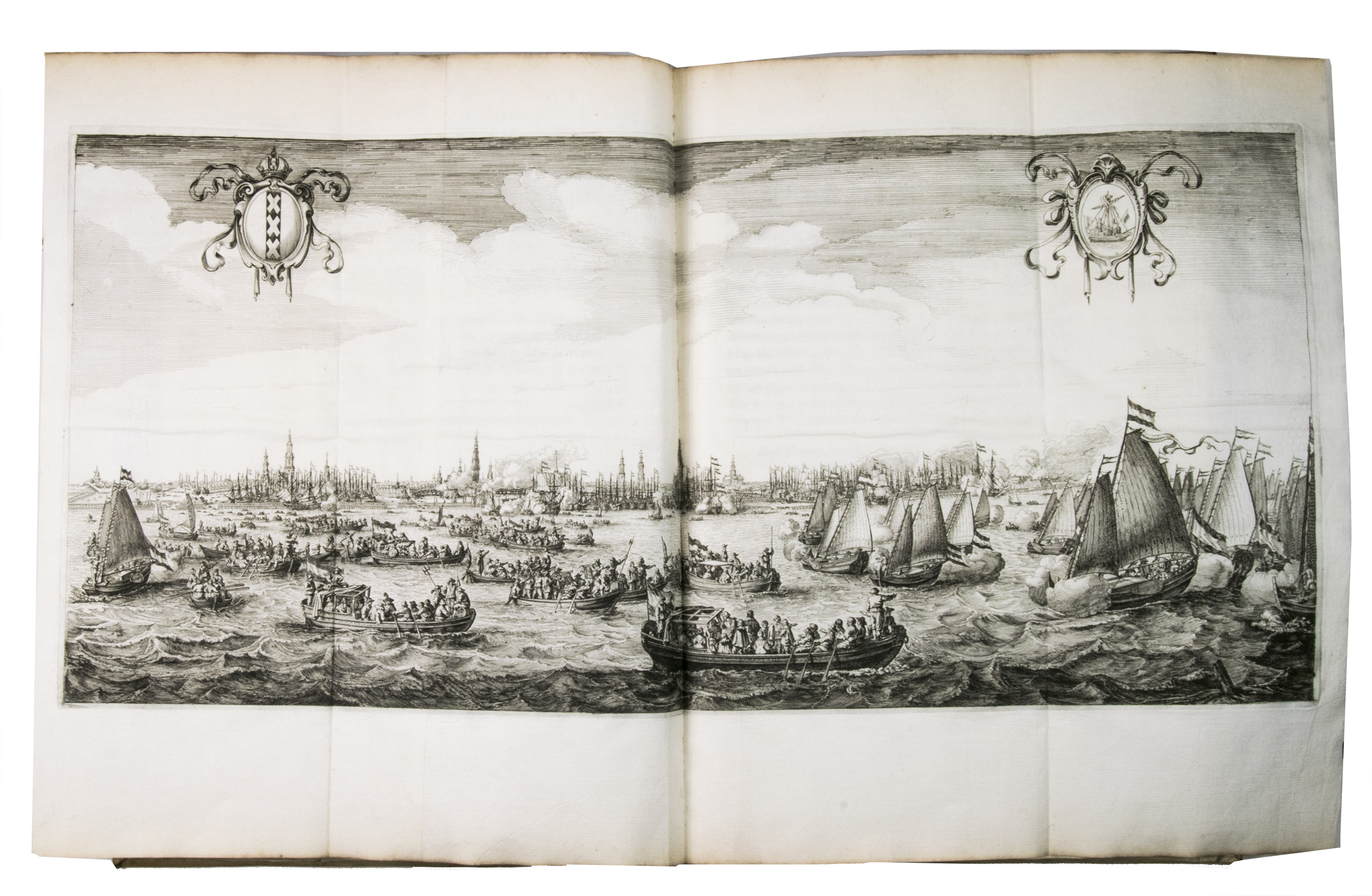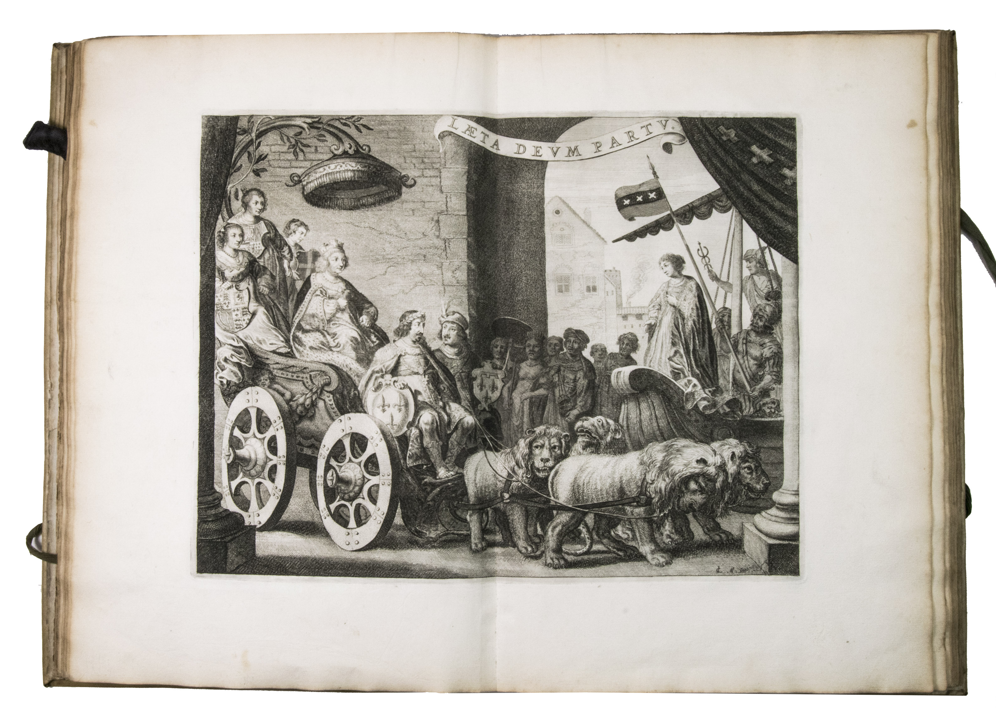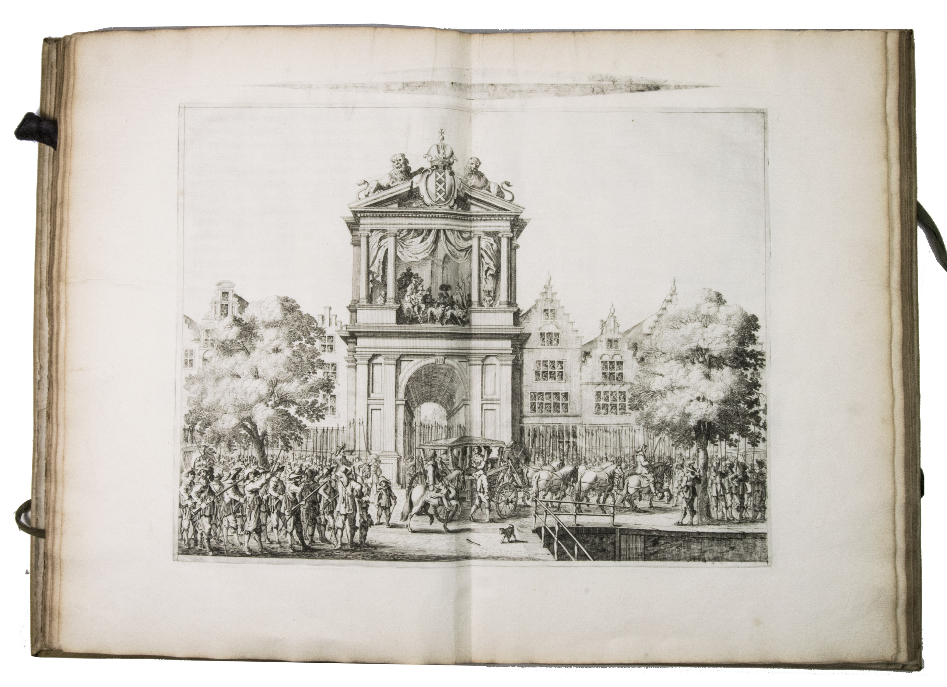 The beautiful plates were drawn and engraved by different artists. Nine were engraved after Claes Moeyaert (1592-1655), who designed the triumphal arch built for De' Medici's entry, as well as the dramatic tableaux based on her life that were shown to her. These 9 engravings depict these tableaux. The portrait of Marie de' Medici, is drawn after a painting by Gerard van Honthorst (1592-1656). The remaining 7 plates, engraved by Salomon Savery (1594-1666), represent the festival in exceptional detail. The folding plate, for example, shows the hundreds of boats and ships in the IJ, with the city in the background. The other topographic plates show the old city hall (burned down in 1652) and weigh house (demolished in 1808) on the Dam, and the triumphal arches built for the occasion (1 on an artificial island). The very rare plate of the four burgomasters was engraved by I. Suyderhoef and is only present in a few copies.