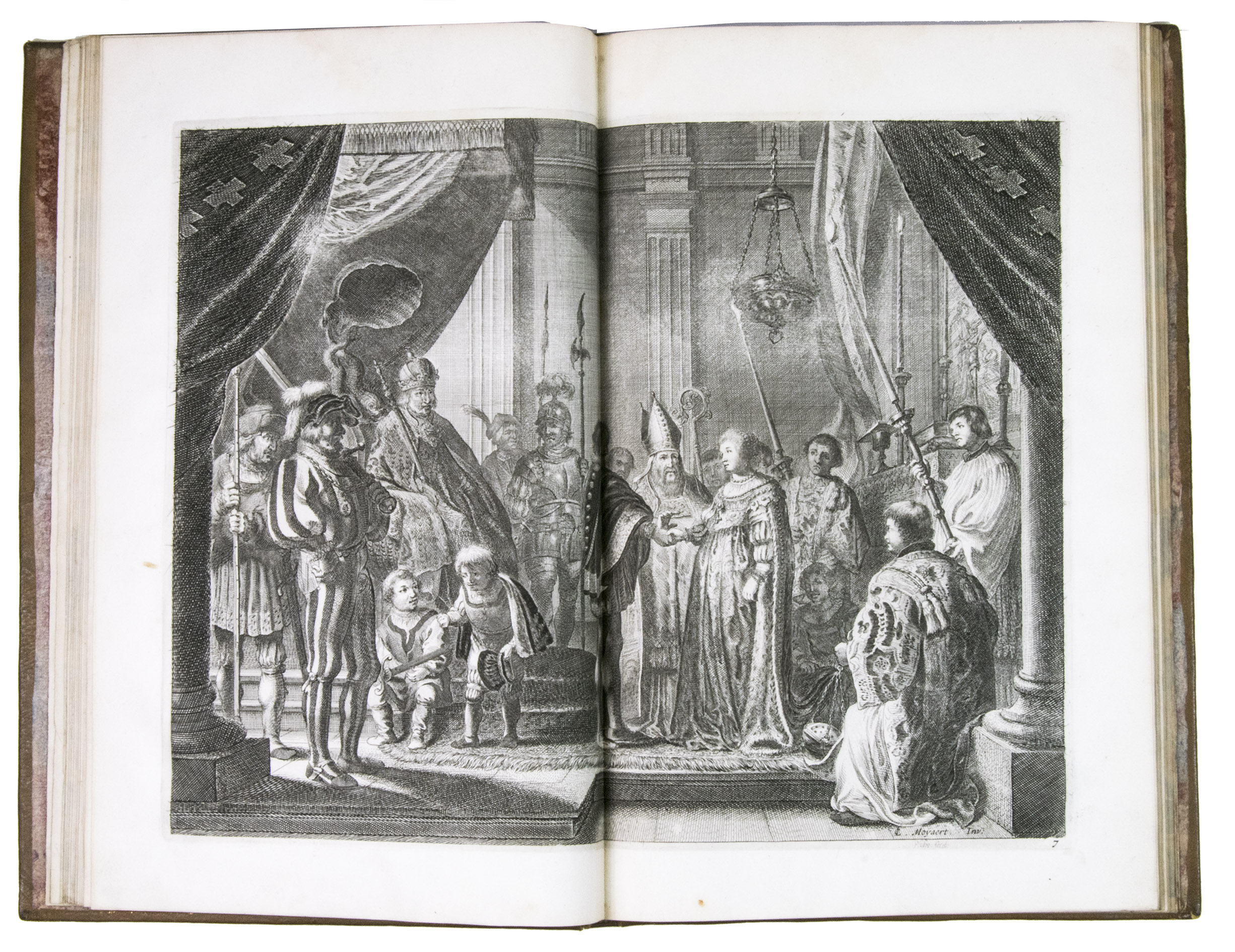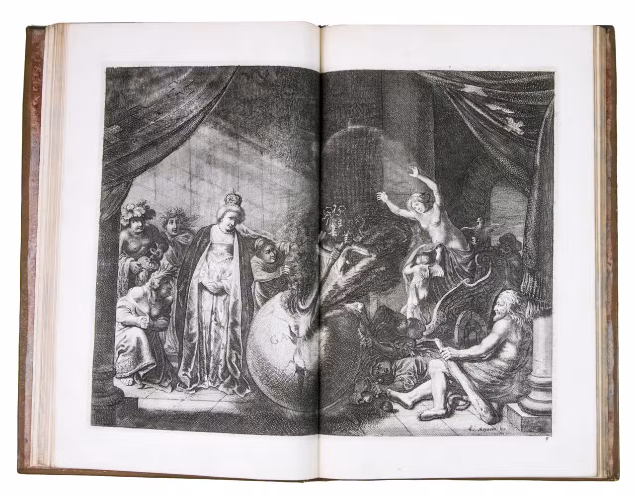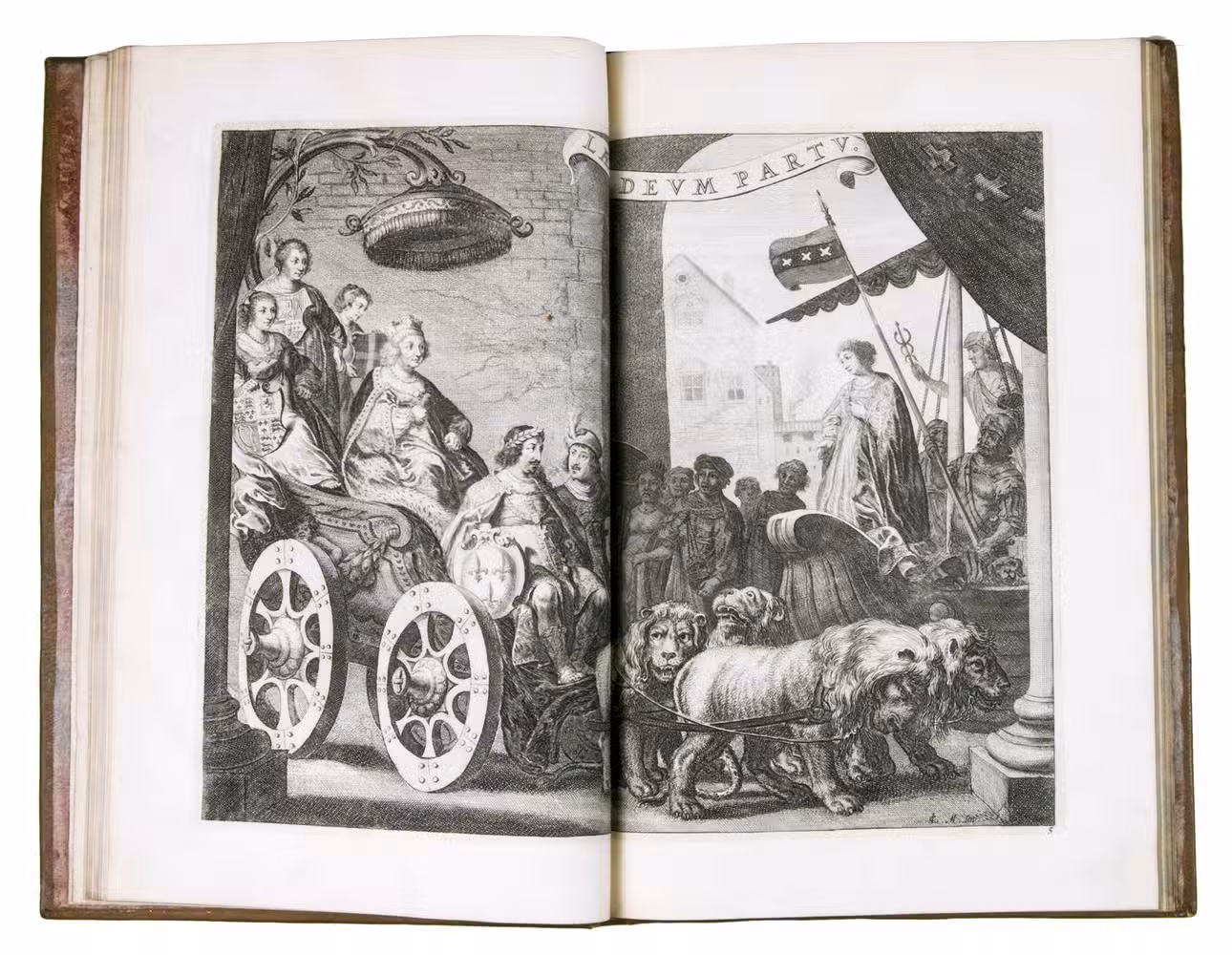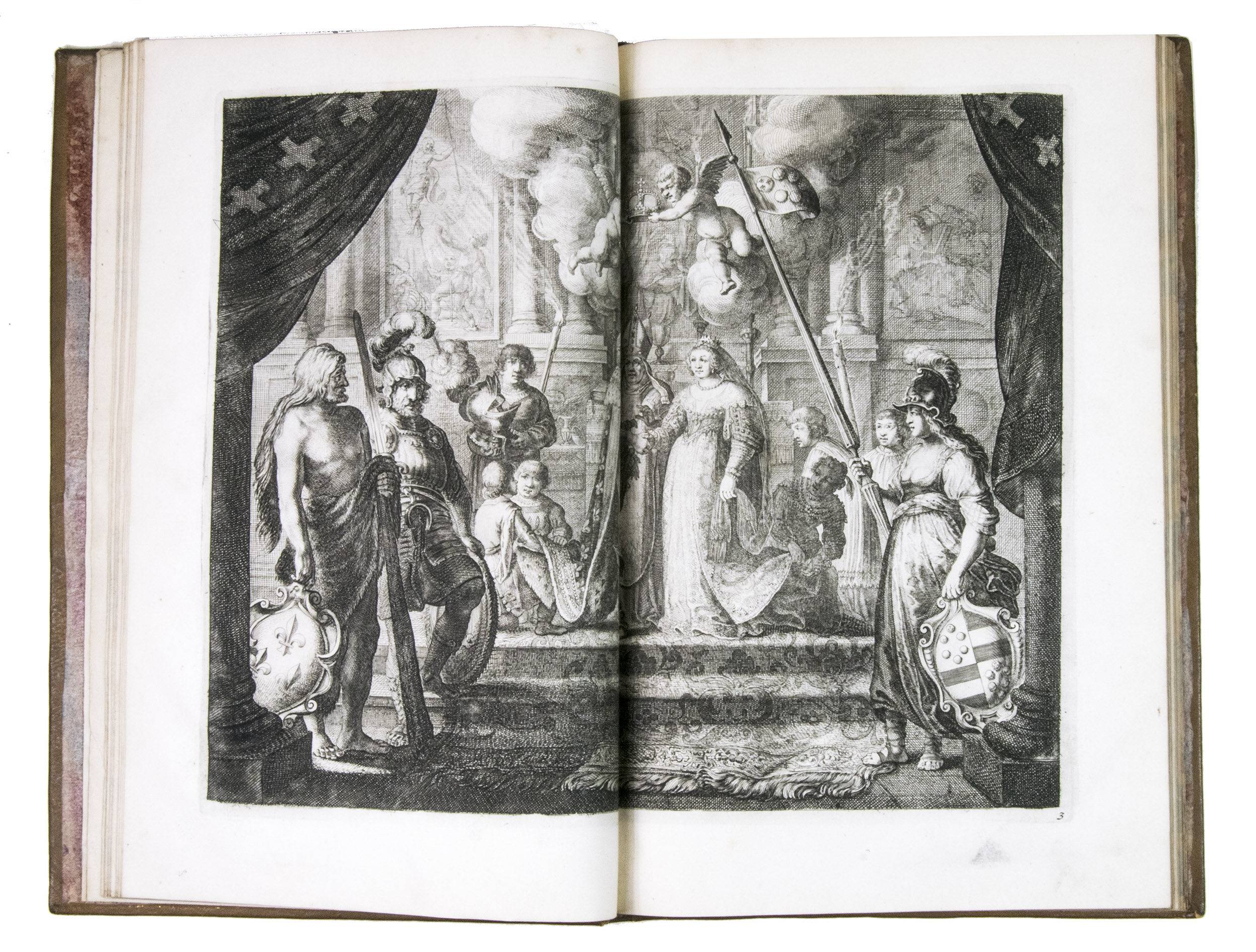 With an owner's inscription on the back of the front flyleaf ("call to pert: HB. Marck. 1850"). The corners of the boards are very lightly scuffed, the boards are lightly bumped and rubbed, with a small hole on the hinge on the back. The 17th-century marbled end papers have been repaired in the gutter with 19th-century marbled paper, the title page is somewhat browned and has been reinforced in the inner margin, a small water stain in the lower outer corner throughout, without affecting the text or plates. Otherwise in very good condition. Landwehr, Splendid ceremonies 109; Hollstein XIV, Nolpe 86-94; Hollstein XXIV, Saverij 144 a-h; Lipperheide 2665; Muller, Nederlandse historieplaten 1793 & supplement 1793; Snoep, Praal en propaganda, pp. 39-76; STCN 85007293X (11 copies); Vinet 489.