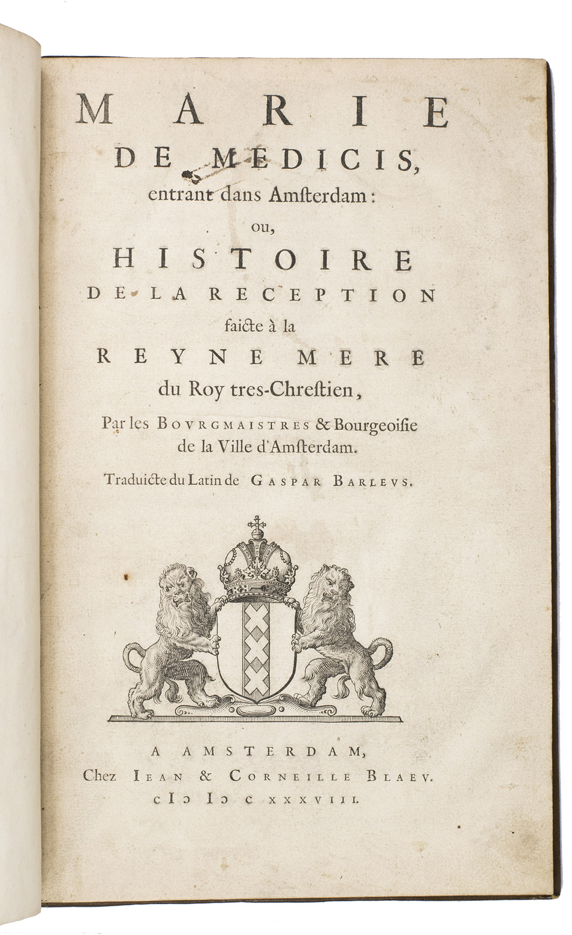 First edition in French of this superb Dutch festival book, celebrating the arrival of Marie de' Medici (1575-1642), queen-mother of France, in Amsterdam. Published simultaneously in French and Latin, it is the first official description of a royal entry in the Northern Netherlands. Marie de' Medici's ceremonial entrance was an important moment in the history of Amsterdam. Although her presence was a politically sensitive issue, she was received with great honour. The present work, complete with all 17 engravings, is a beautiful visual and textual homage to this event.