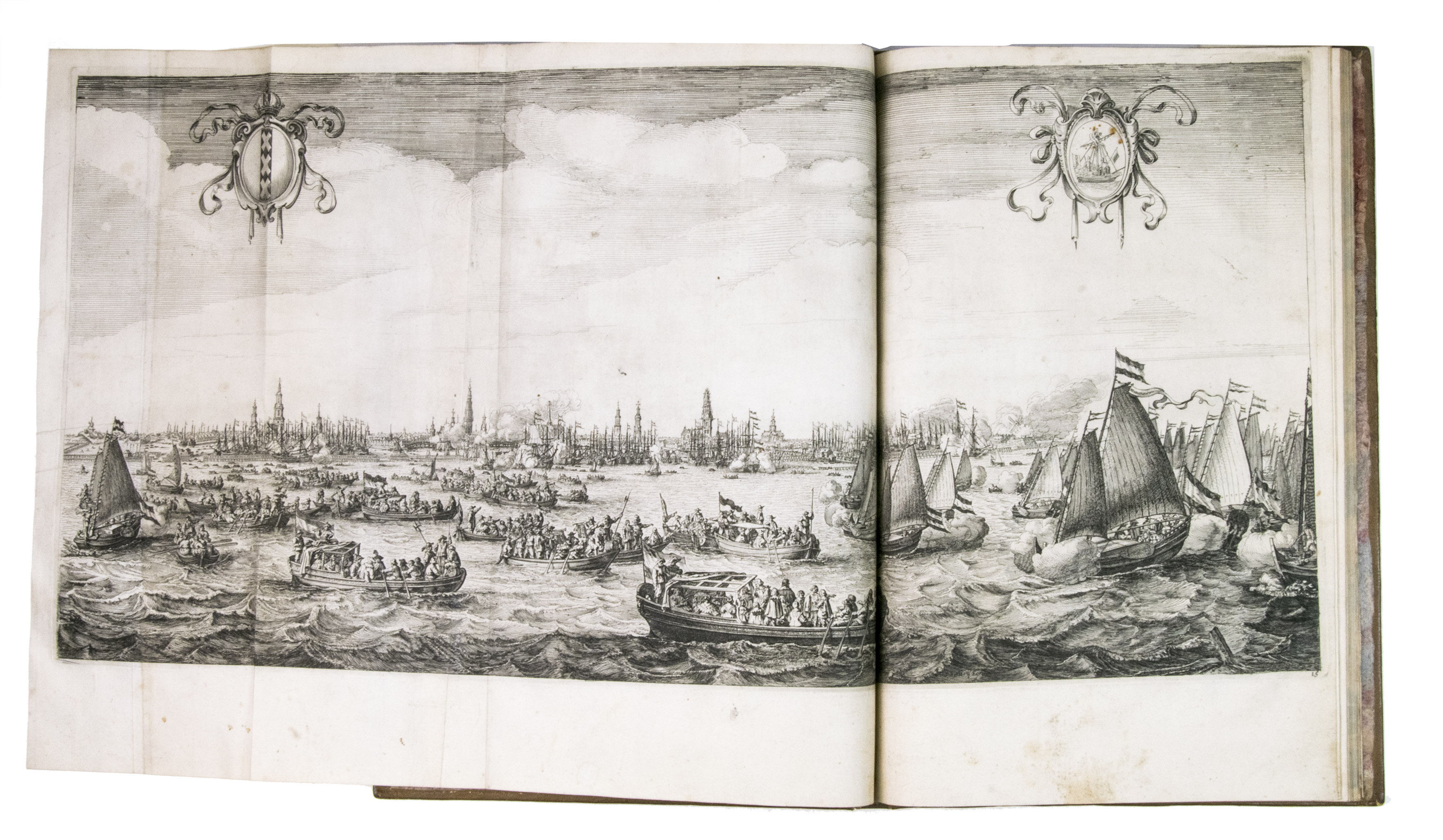 The beautiful plates were drawn and engraved by different artists. They are known to have had either two or three different states, depending on the plate. In the present copy, all plates are in their final state as they are numbered, which the plates of the earlier states are not. Nine were engraved after Claes Moeyaert (1592-1655), who designed the triumphal arch built for De' Medici's entry, as well as the dramatic tableaux based on her life that were shown to her. These 9 engravings depict these tableaux. The frontispiece, a portrait of Marie de' Medici, is drawn after a painting by Gerard van Honthorst (1592-1656). The remaining 7 plates, engraved by Salomon Savery (1594-1666), represent the festival in exceptional detail. The folding plate, for example, shows the hundreds of boats and ships in the IJ, with the city in the background. The other topographic plates show the old city hall (burned down in 1652) and weigh house (demolished in 1808) on the Dam, and the triumphal arches built for the occasion (1 on an artificial island). All show the enthusiastic crowds gathered to celebrate Marie's arrival.