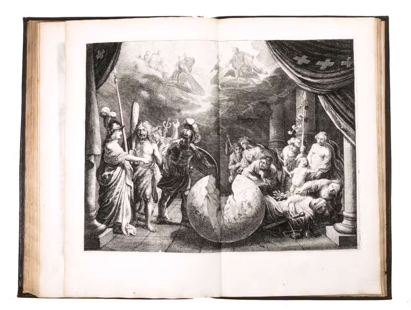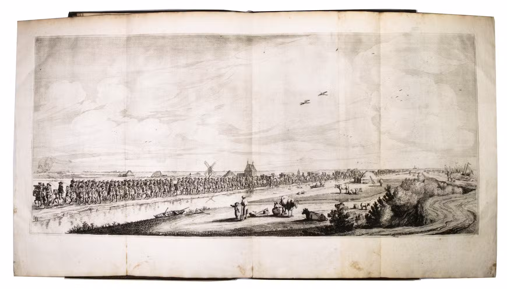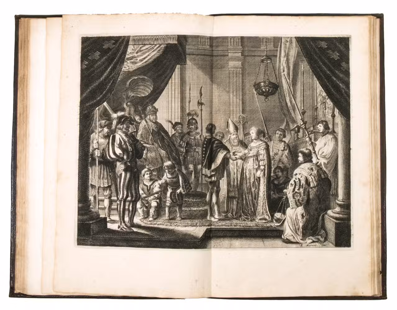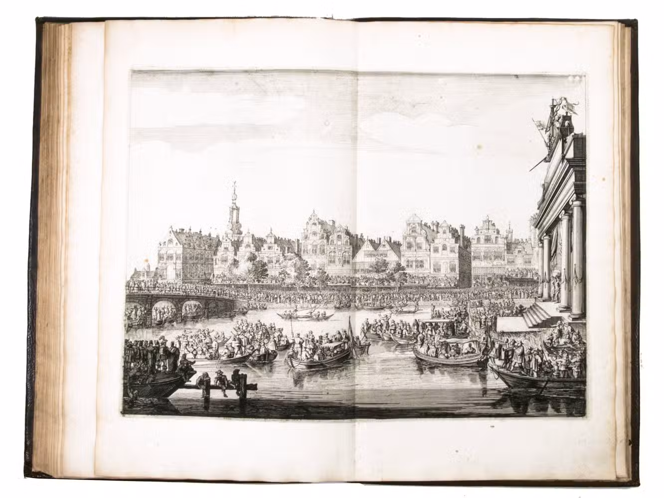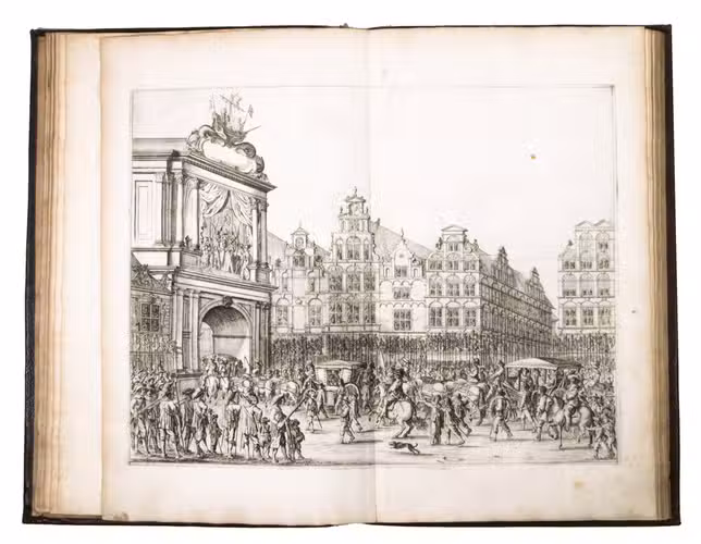 The edges and corners of the boards are scuffed, the boards and spine are rubbed, the board are slightly dust soiled. The work is slightly foxed, with some leaves affected more than others. Otherwise in good condition. Berlin Kat. 2949; Hollstein XIV, 86-94, and XXIV, 144 a-h (the plates); Muller, Historieprenten, 1793; L'Art Ancien, cat. 26, nr. 398; Landwehr, Splendid ceremonies, 108; Lipperheide 2665; Snoep, Praal en Propaganda, pp. 39-76; STCN 850281733; Verzameling Amsterdam W.J.R. Dreesman, p. 476; USTC 1030730; Vinet 489; cf. Collections A.J. Nijland troisième partie 443-7.