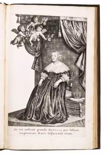 Marie de' Medici was the wife of King Henry IV (1553-1610). After he was murdered, she became the regent of France until her son, Louis XIII (1601-1643), came of age in 1614. However, she refused to resign and continued as regent until she was removed by a coup in 1617. She initially reconciled with her son, but lost his trust when she became part of a political conspiracy, and was forced to go into exile in 1631. She arrived in the Northern Netherlands in 1638, where her visit was seen as official recognition of the Dutch Republic (1579-1795). Because of this, she was welcomed in Amsterdam with spectacular displays, water pageants, a procession, and a series of dramatic tableaux in tribute to her. However, her presence caused political difficulties with France and she was encouraged to leave after a few months. She sailed to England in October 1638, and died a few years later in Cologne.