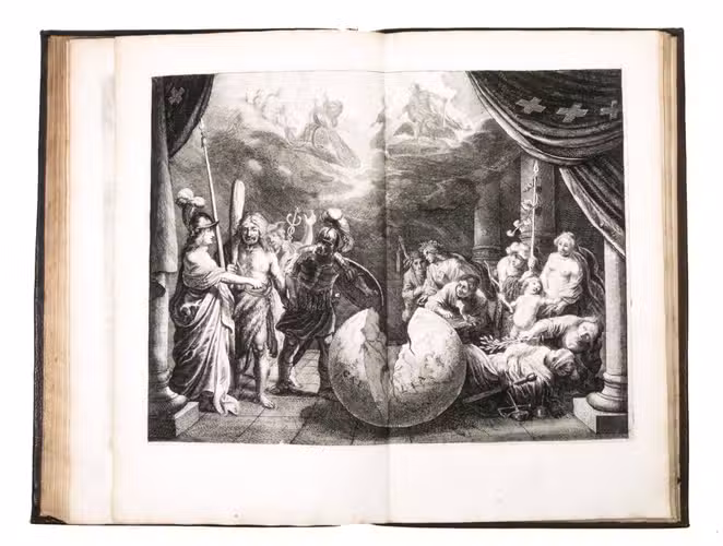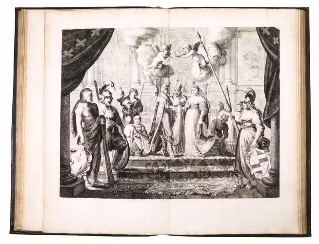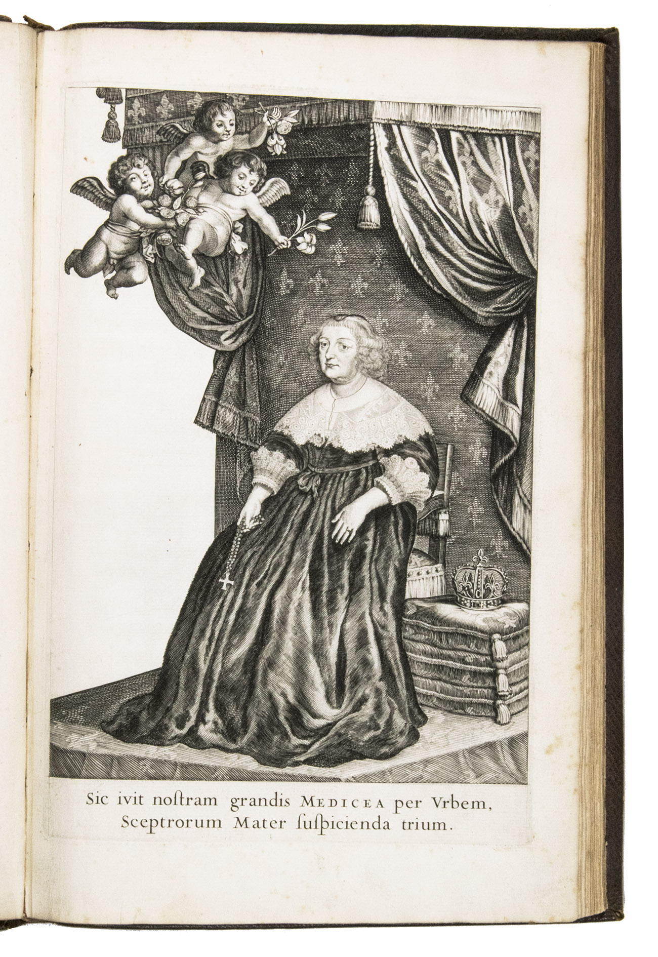 The work is especially known for its impressive plates, which are known to have had either two or three different states, depending on the plate. In the present copy, all plates are in their first state. This is easily recognisable by the lack of numbers and inscriptions at the very bottom of the plates, as well as by other details, such as the white background on the frontispiece portrait of Marie de' Medici, which shows a view of Amsterdam in later states, and the headless dog in the foreground of the final plate. Copies with plates in the first state are the most rare, as the plates were numbered to assist in managing the greater number of copies being produced. They are also usually larger than those with plates in later states, as is the case here.