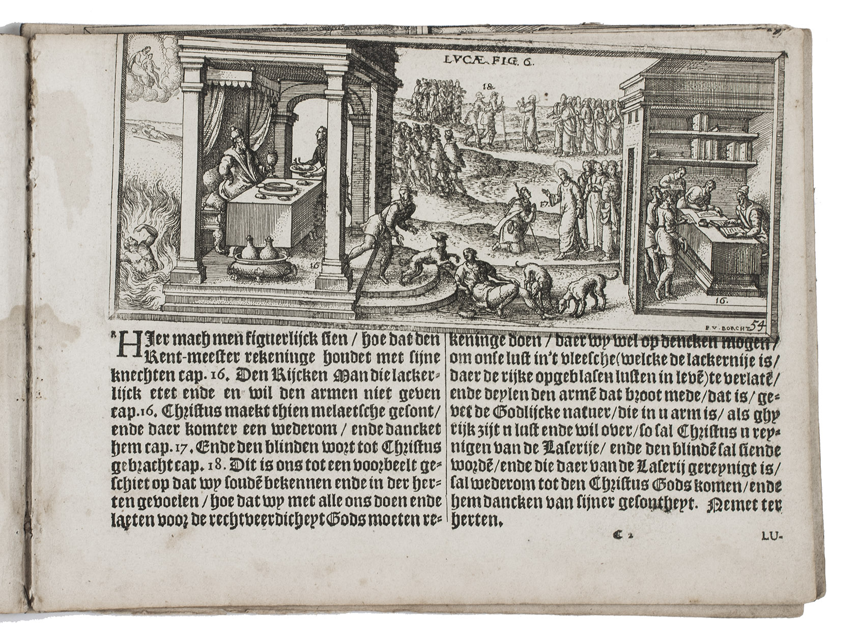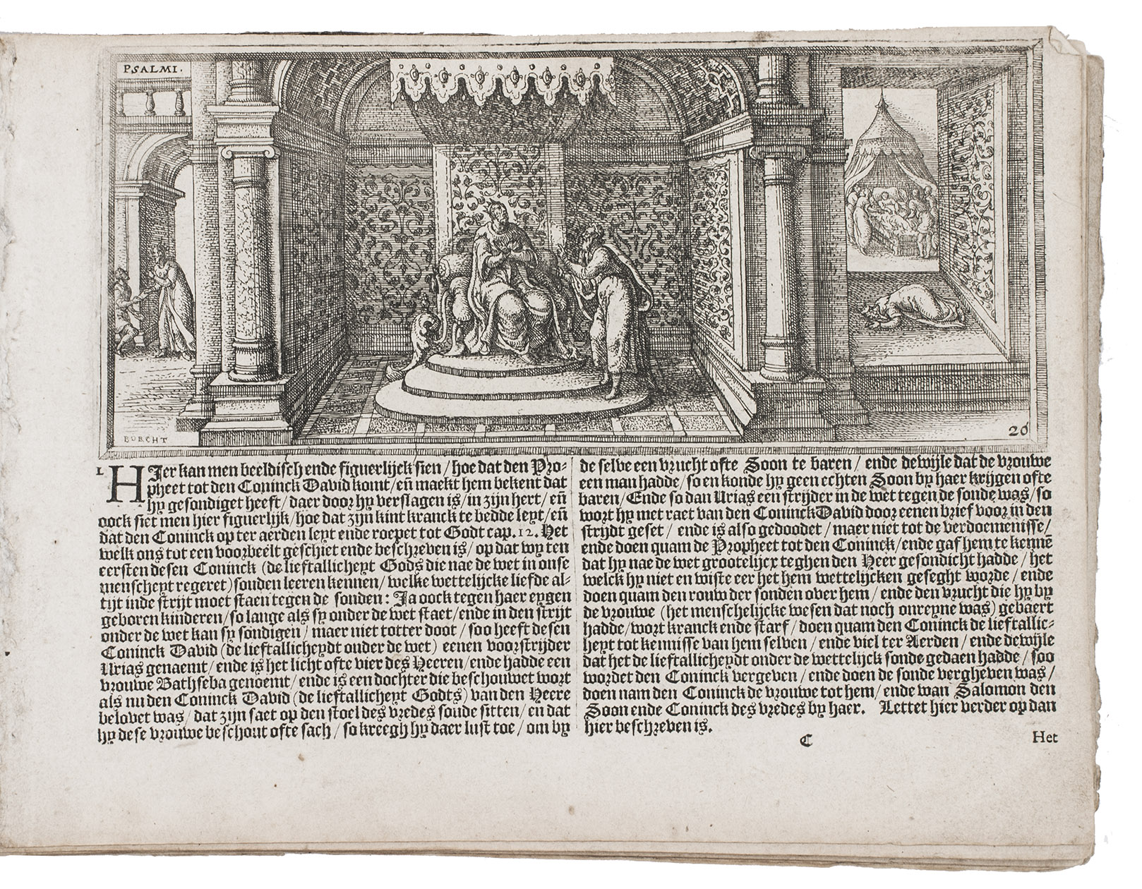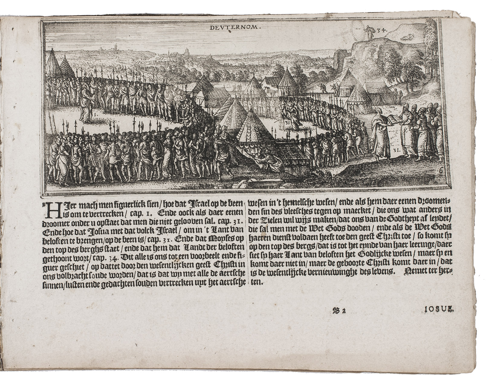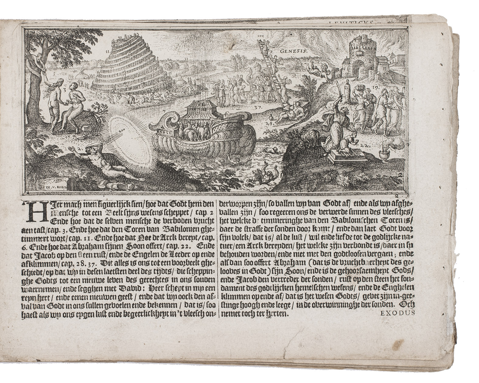 Very rare 1662 edition (first issue), in the original Dutch, of an important and influential interpretation of the stories of the Old and New Testament, in the popular form of (originally) 119 engraved illustrations by Pieter van der Borcht (1535-1608), from Mechelen, and explanatory text by the anti-denominational Dutch mystic Hendrik Jansen (van) Barrefelt, also known as "Hiël" (ca. 1530-1594?).