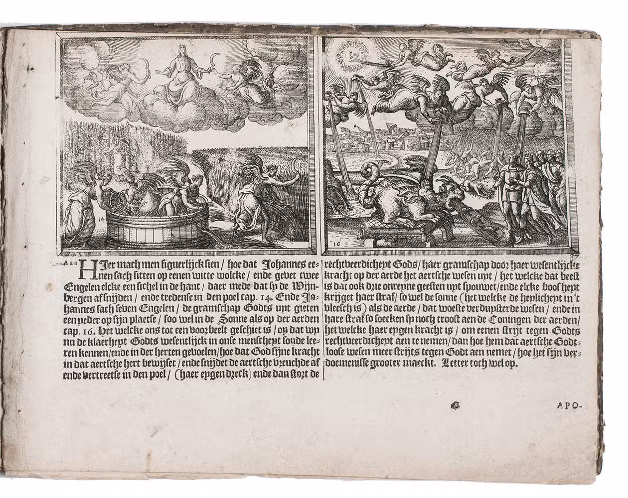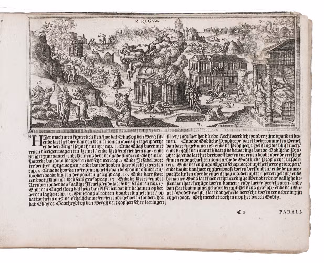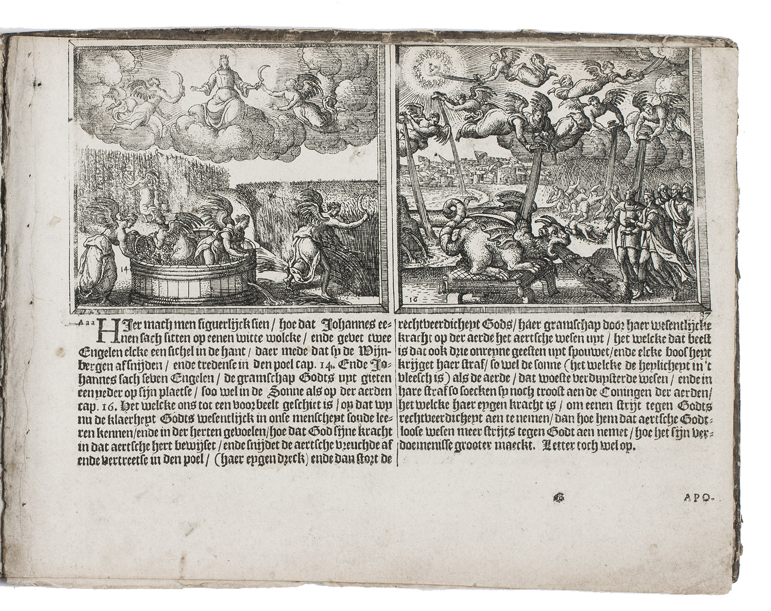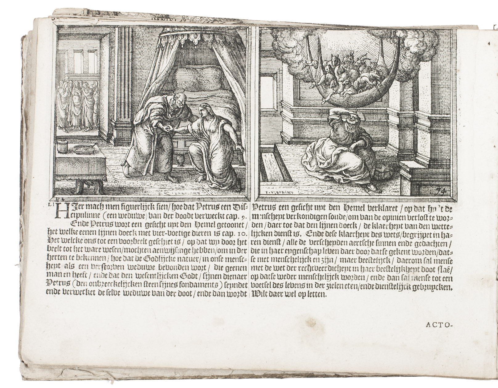 Very rare 1662 edition (first issue), in the original Dutch, of an important and influential interpretation of the stories of the Old and New Testament, in the popular form of (originally) 119 engraved illustrations by Pieter van der Borcht (1535-1608), from Mechelen, and explanatory text by the anti-denominational Dutch mystic Hendrik Jansen (van) Barrefelt, also known as "Hiël" (ca. 1530-1594?).