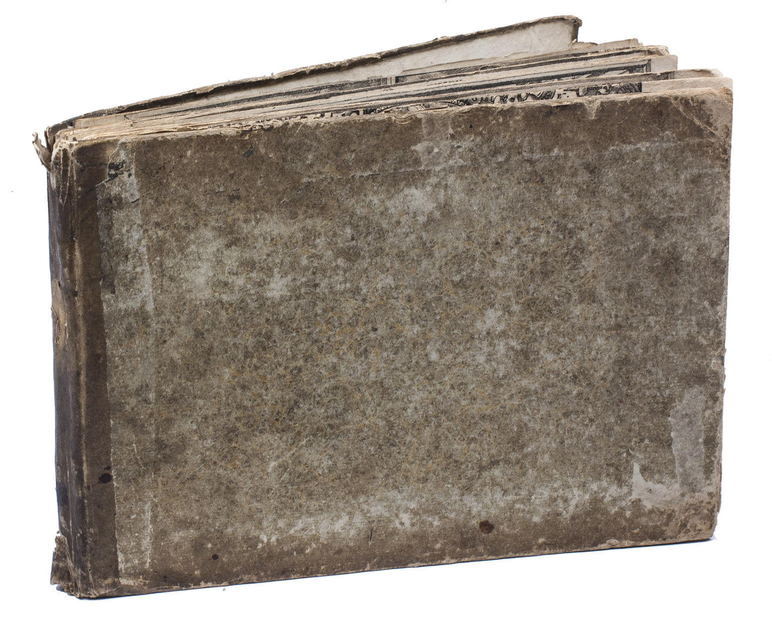 Amsterdam, Gerrit Jansz., 1662. Oblong 4to (19 x 6 cm). With a general title-page plus a separate title-page for the New Testament, each with the same new woodcut rendition of the device Michiel Colijn used in his 1613 editions, 97 (of 119) engraved and etched Bible scenes, 1 large woodcut headpiece and 1 woodcut decorated initial. Set in textura types with incidental roman and italic. Early 19th-century half vellum, sewn on 2 tapes, marbled sides, with the remains of a gold-tooled spine-label that originally read "BIBELSCHE|FIGUEREN|1662". 44 [lacking 15-16, 41-44]; 52 [lacking 41-48] pp.