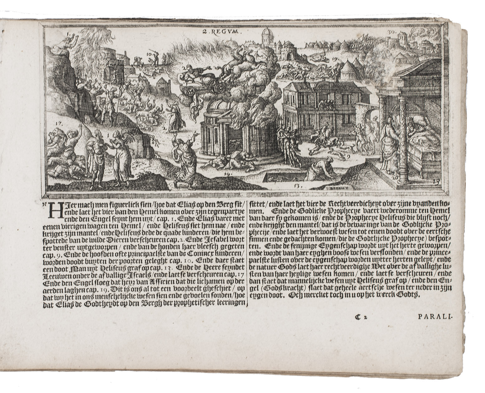 Lacking 7 leaves with 14 engravings, and heavily trimmed at the head. Fortunately the text of Barrefelt's commentaries is unaffected and the pictorial images of Van der Borcht's engravings almost unaffected. Several leaves are detached and there are several other defects. Since only one or possibly no complete copy of this issue is known to survive and only one complete copy of the later issue of this edition, one must be grateful that the present copy has survived with all preliminary leaves and with about 85% of the engravings and commentaries. A. Hamilton, "From Familism to Pietism: the fortunes of Pieter van der Borchts biblical illustrations and Hiëls commentaries ...", in: Quaerendo XI (1981), pp. 271-301, at pp. 294-295; KVK & WorldCat (3 copies, at least 2 incomp.); New Hollstein ... Pieter van der Borcht, p. 133, 5 (same 3 copies, at least 2 incompl.) & plates 335-422; STCN (2 of the same 3 copies, both incompl.; cf. 1671 reissue, 1 compl. & 1 incompl.); Poortman, Bijbel en prent II, p. 39, c1 (see also pp. 23-24); cf. R. Dekoninck, "Entre réforme et contre-réforme: le Imagines et figurae bibliorum de Pieter van der Borcht et Hendrik Jansen van Barrefelt ...", in: Quaerendo XIX (1999), pp. 96-131; P. Visser, "Jan Philipsz Schabaelje and Pieter van der Borchts etchings ...", in Quaerendo XVIII (1988), pp. 35-76, esp. pp. 67-69.