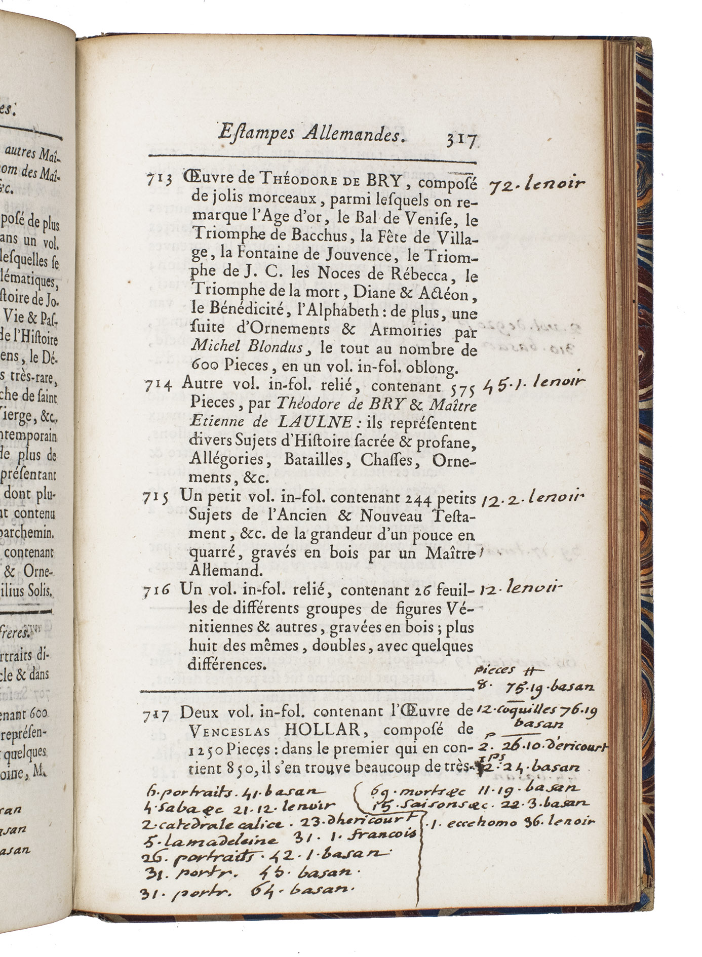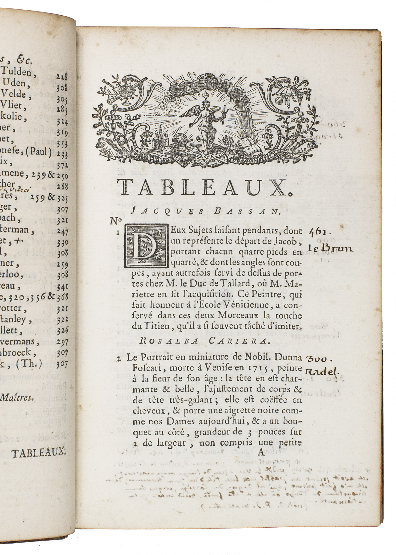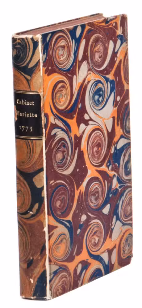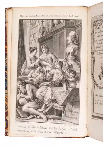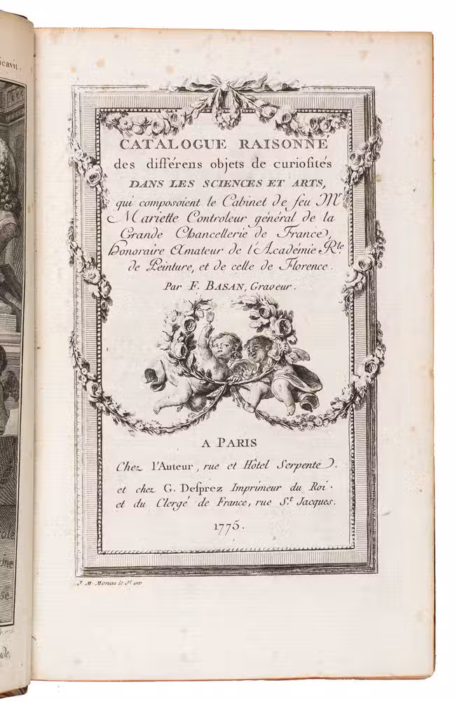 The renowned auction catalogue of Pierre-Jean Mariette's celebrated art cabinet. The catalogue was compiled by Pierre-François Basan and it serves as an extensive overview with illustrations of Mariette's collections. An indispensable reference for scholars of 18th-century collecting, the catalogue not only reflects Mariettes encyclopaedic knowledge and discerning taste but also provides provenance details of many artworks and books that later entered prominent European collections.
