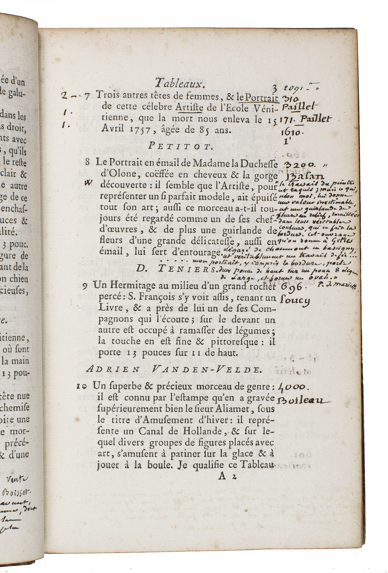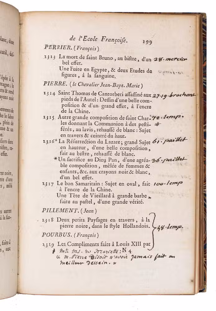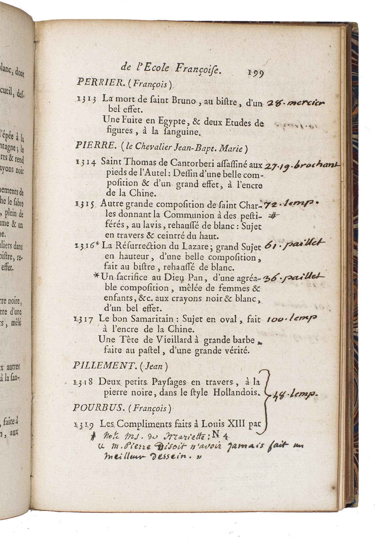The renowned auction catalogue of Pierre-Jean Mariette's celebrated art cabinet. The catalogue was compiled by Pierre-François Basan and it serves as an extensive overview with illustrations of Mariette's collections. An indispensable reference for scholars of 18th-century collecting, the catalogue not only reflects Mariettes encyclopaedic knowledge and discerning taste but also provides provenance details of many artworks and books that later entered prominent European collections.