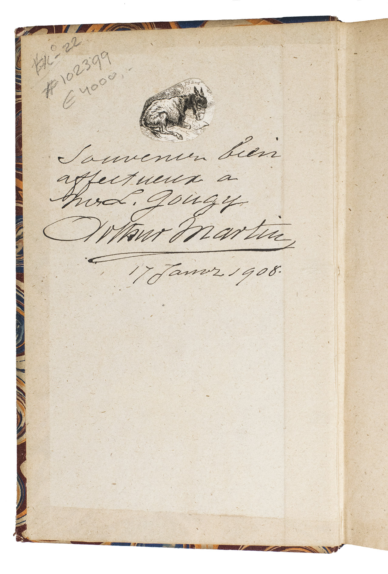 With manuscript annotations in brown ink throughout, detailing names of buyers, auction prices, and additional information about the items listed. Also with a dated manuscript inscription on the front pastedown ("Souvenier bien affectueur a Mr. L. Gougy ... Martin 17 Janvier 1908") written in black ink below a small engraved illustration of a donkey. The boards are slightly rubbed, occasional minor foxing. Otherwise in good condition. Brunet III,1430; Cohen de Ricci 115; Cicognara 4462.