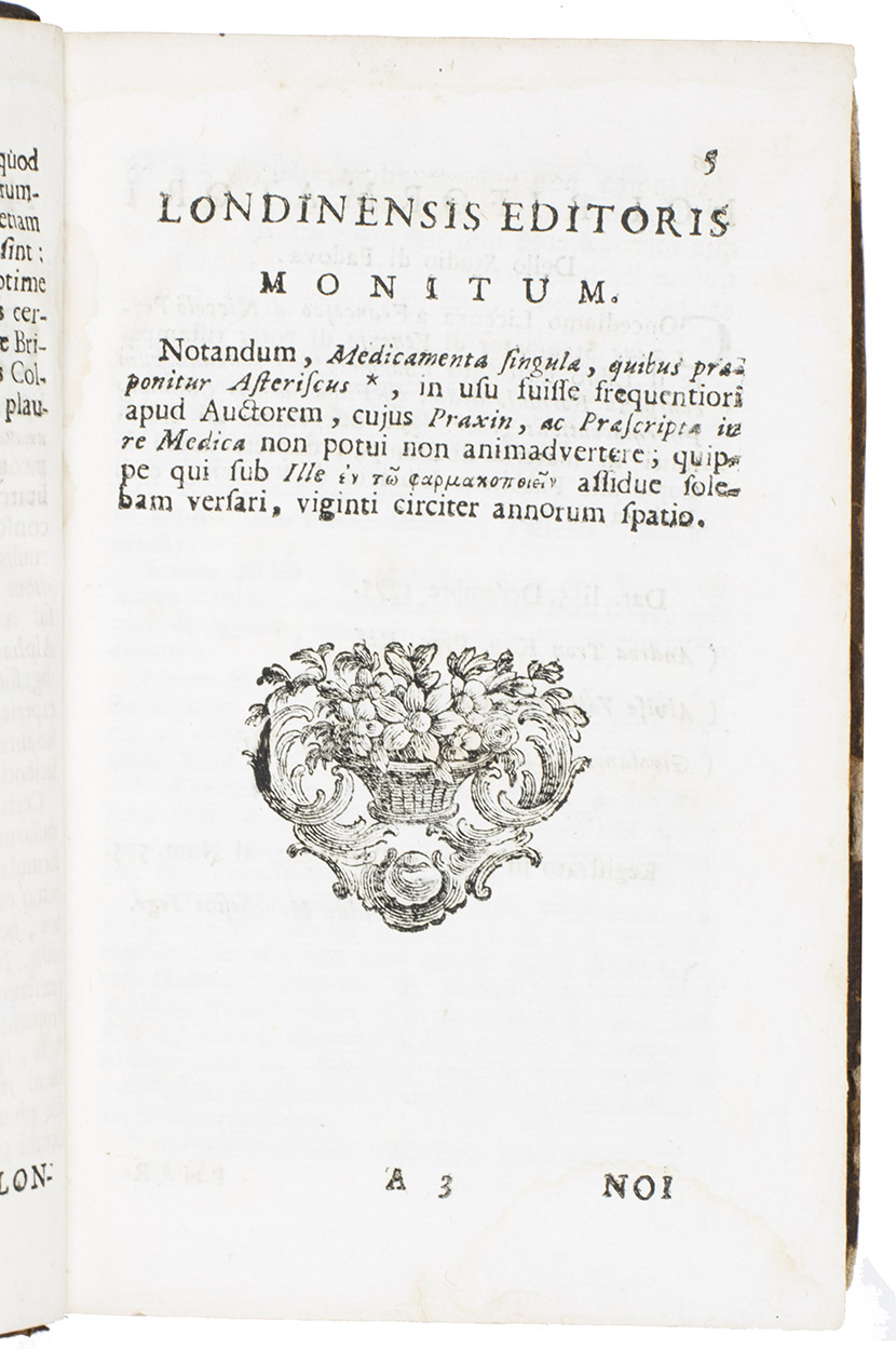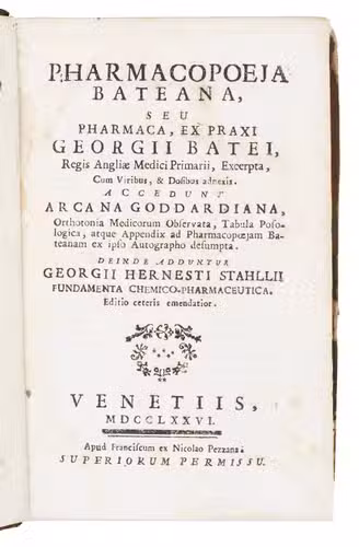 Ad. 1. Later Venetian edition of the Latin Pharmacopoeia Bateana, an internationally authoritative collection of pharmacological recipes and prescriptions compiled posthumously by James Shipton from the papers of the British physician George Bate (1608-1668), originally published in 1688.