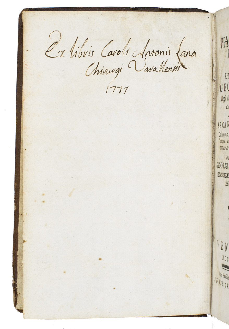 With an owner's inscription dated 1777 from "Caroli Antonii Chirurgi Varallensis" on the verso of the first flyleaf. Wellcome II, p. 113.