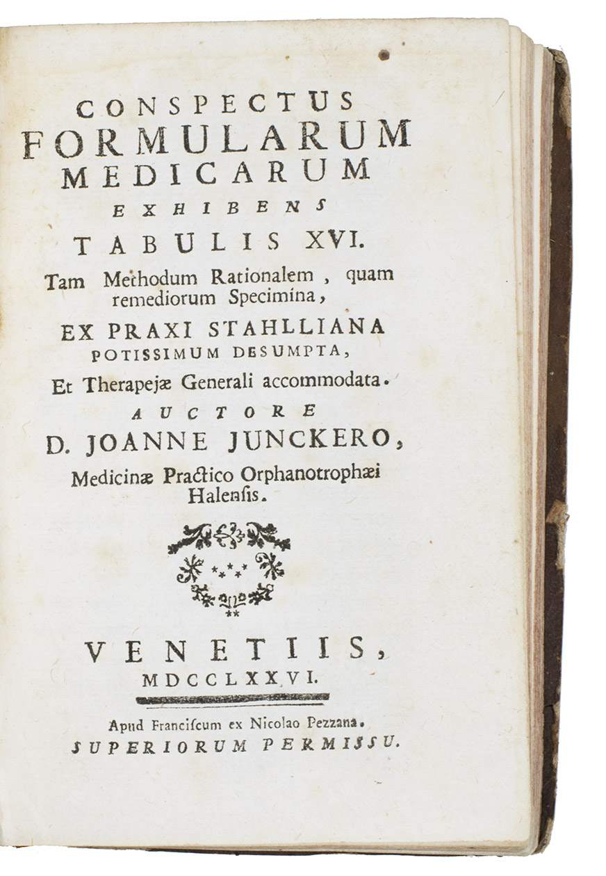 (2) Joannes JUNCKER. Conspectus formularum medicarum exhibens tabulis XVI. Tam methodum rationalem, quam remediorum specimina, ex praxi Stahlliana potissimum desumpta, et therapeiae generali accommodata.