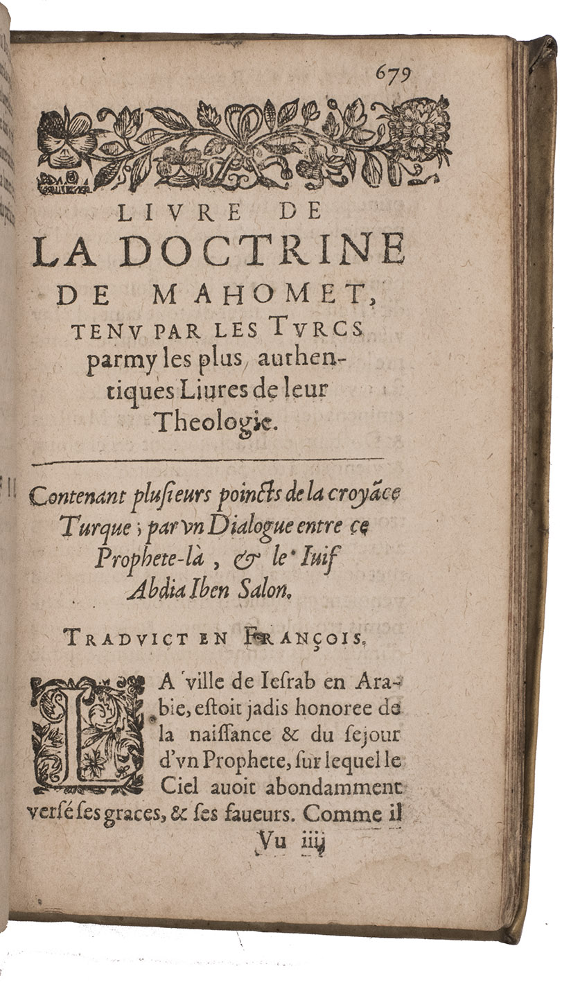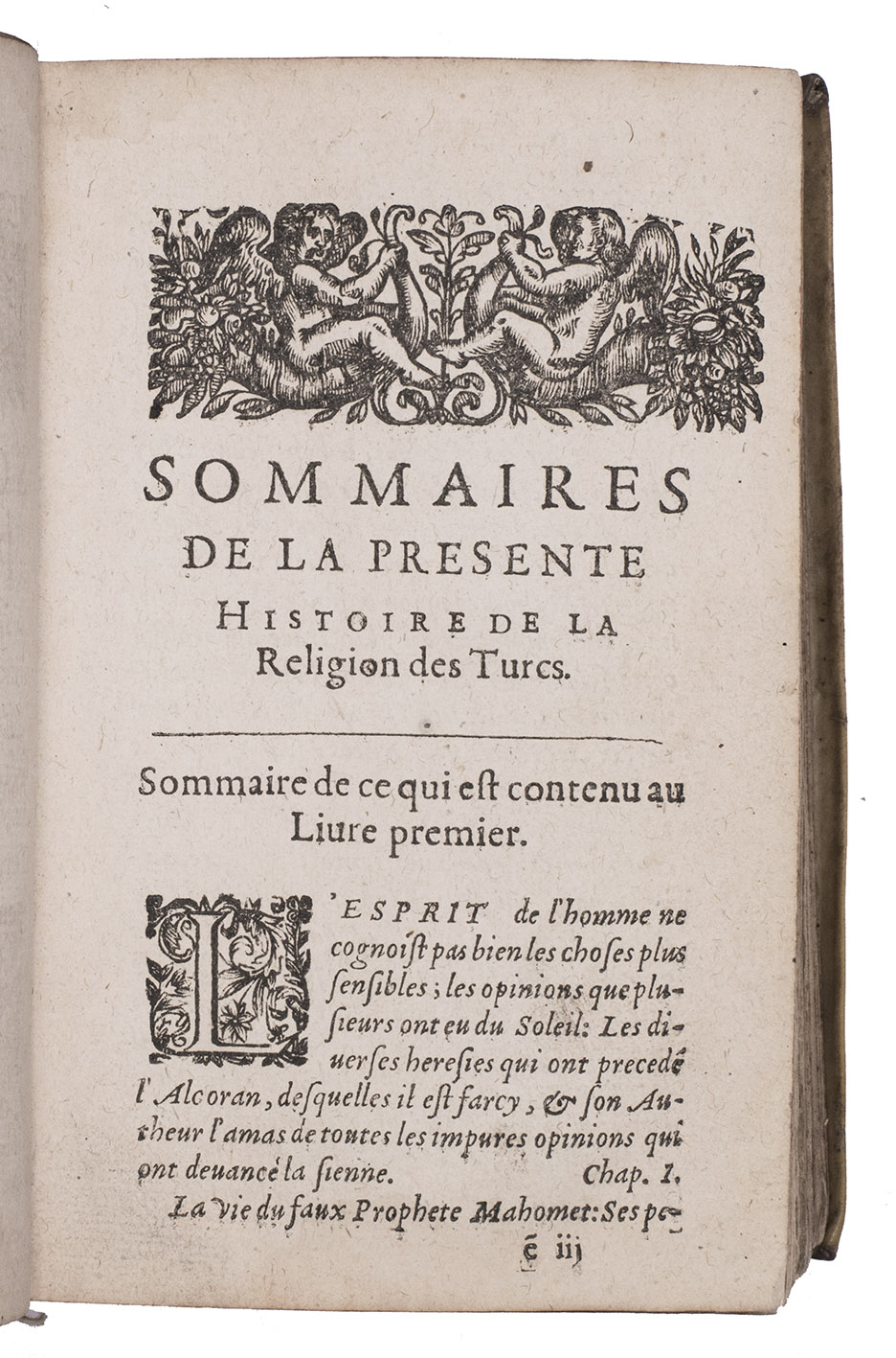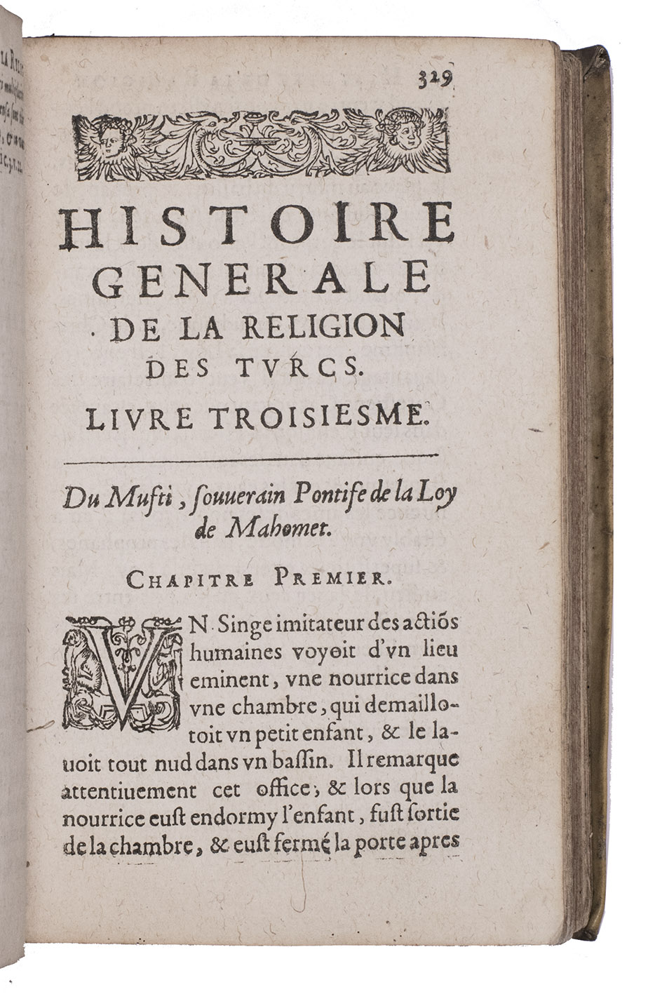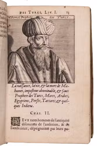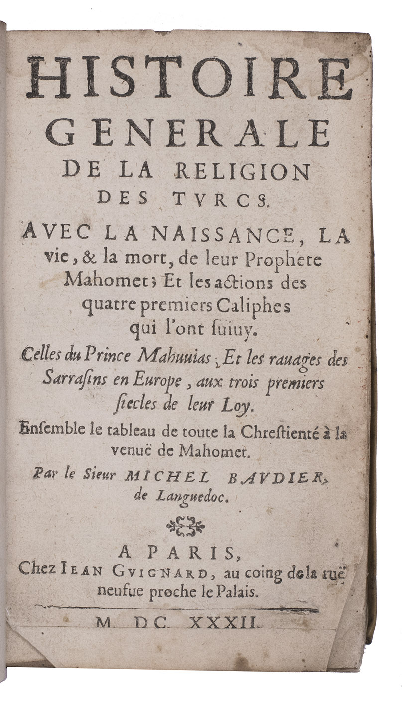 Second edition of "the most complete treatment of Islam up to its time in France" (Atabey). Written by Micheal Baudier (ca. 1589-1645), historiographer to the Court of France. The book is presented as a history of the religion of the Turks, who controlled, at that time, a large part of the Islamic world, and gives a detailed description of Islam and its prophet Muhammad.