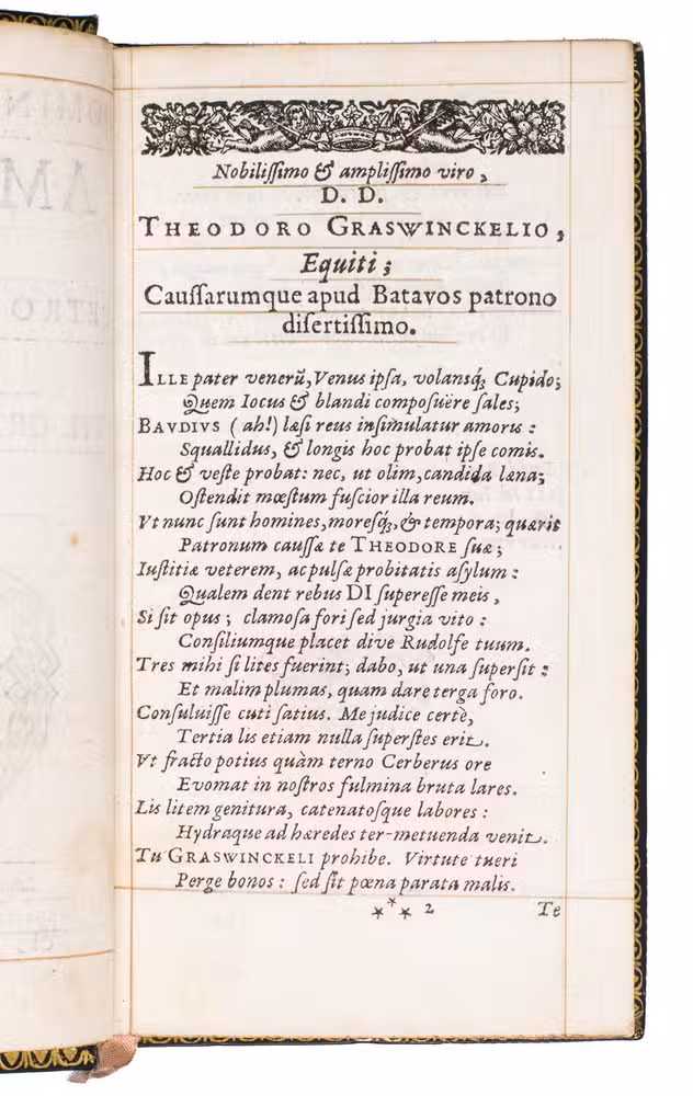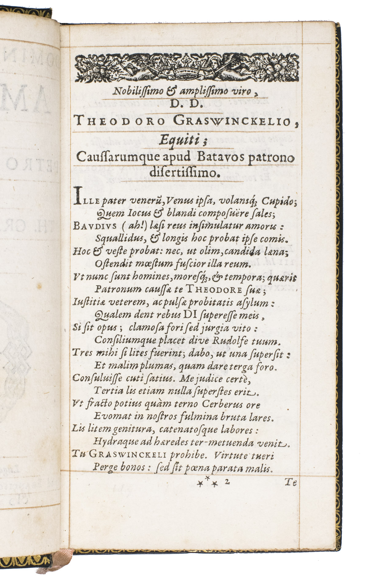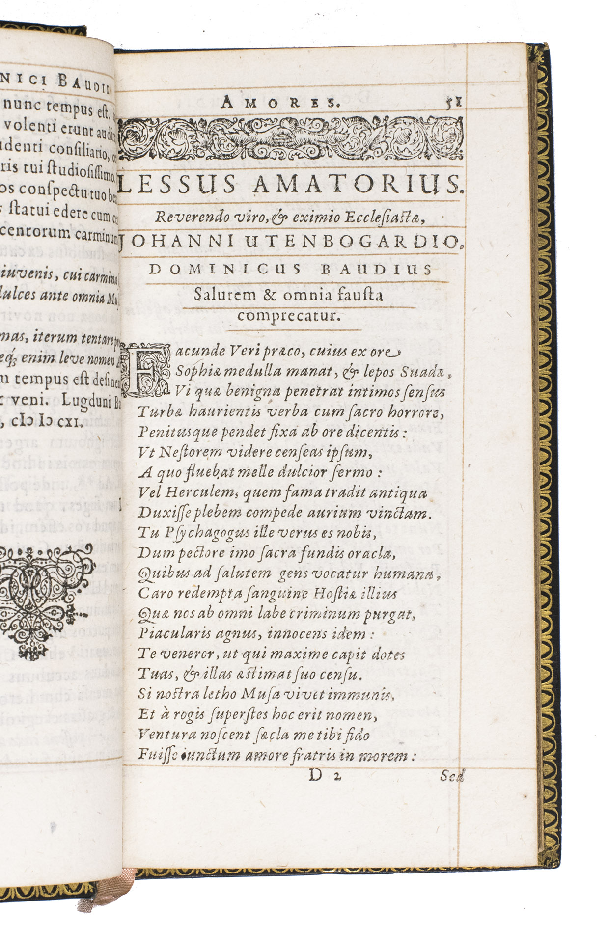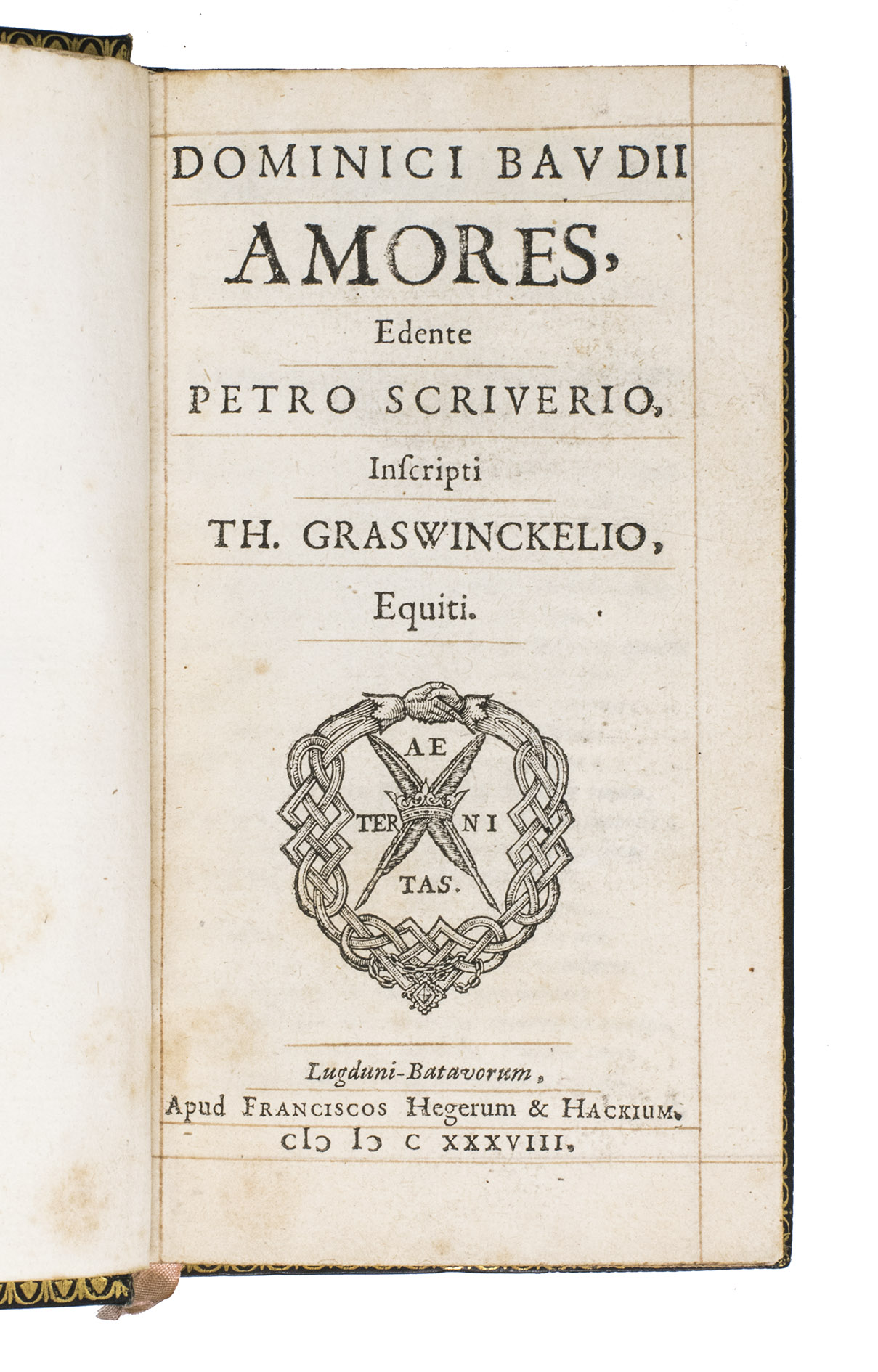 First and only edition of an amorous compilation of Latin poems and other texts, including letters, orations, disputations, text editions with notes, and commentaries. The texts, all on the subjects of love and marriage, were written by various authors, such Daniel Heinsius, Janus Dousa, Desiderius Erasmus, Thomas More, Petrus Scriverius, Scaliger, Cl. Salmasius, L. Capilupi, Ausonius and others. However, the editor of this collection, the well-known humanist and scholar Petrus Scriverius (1576-1660) brought Baudius to the fore as the main author.