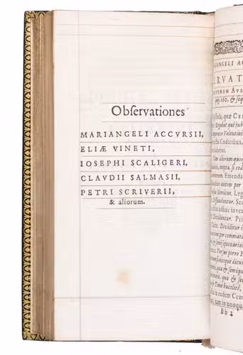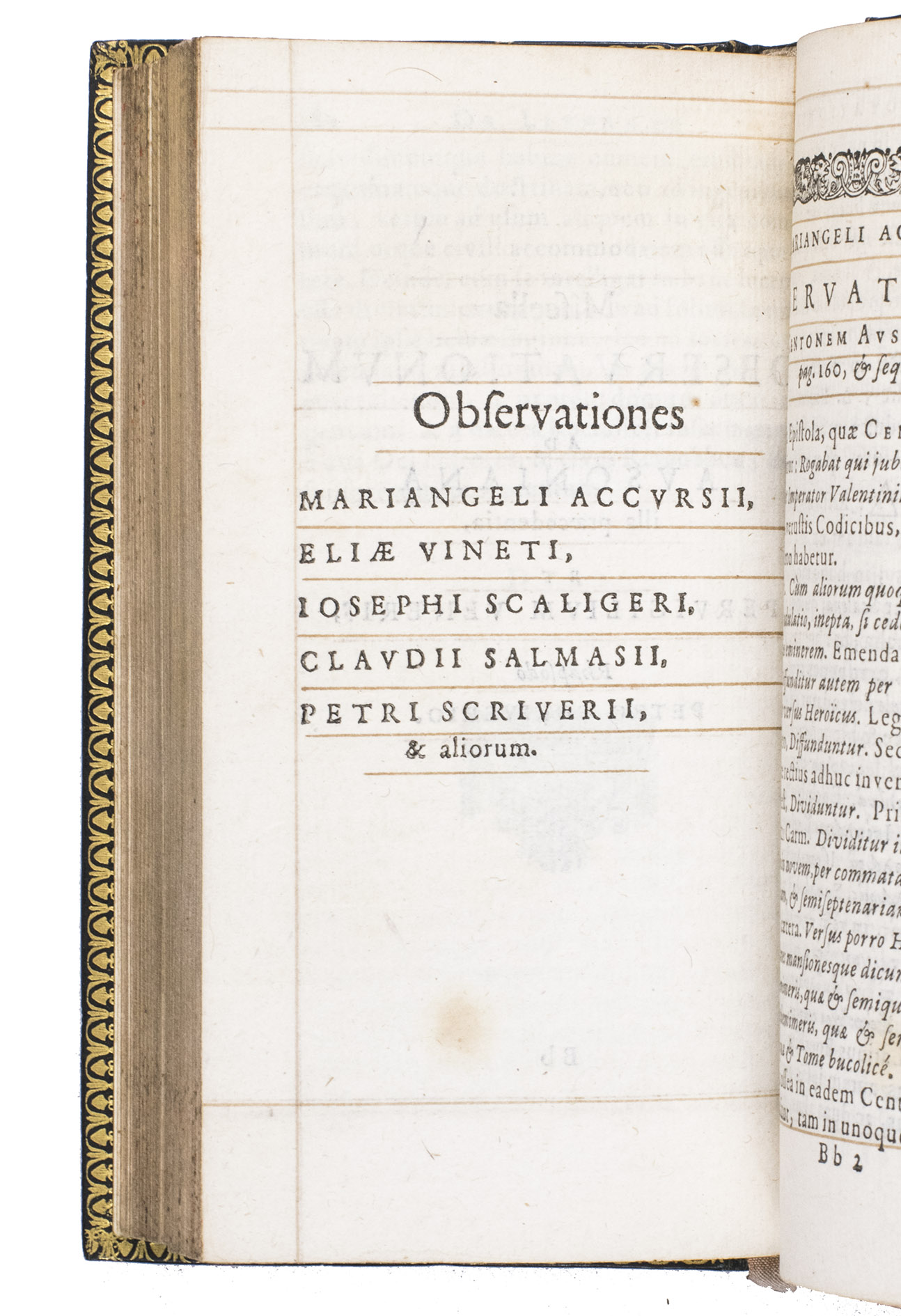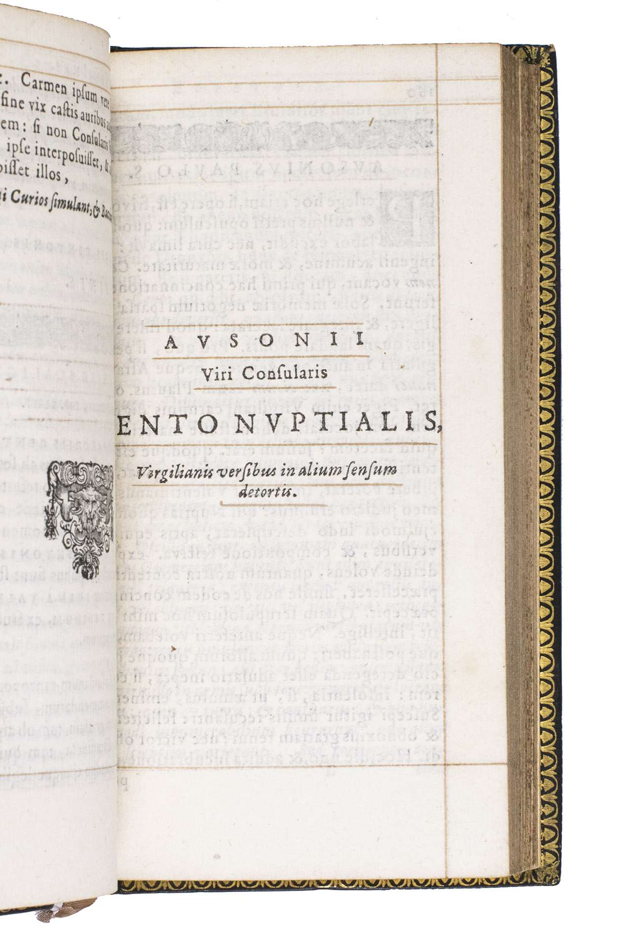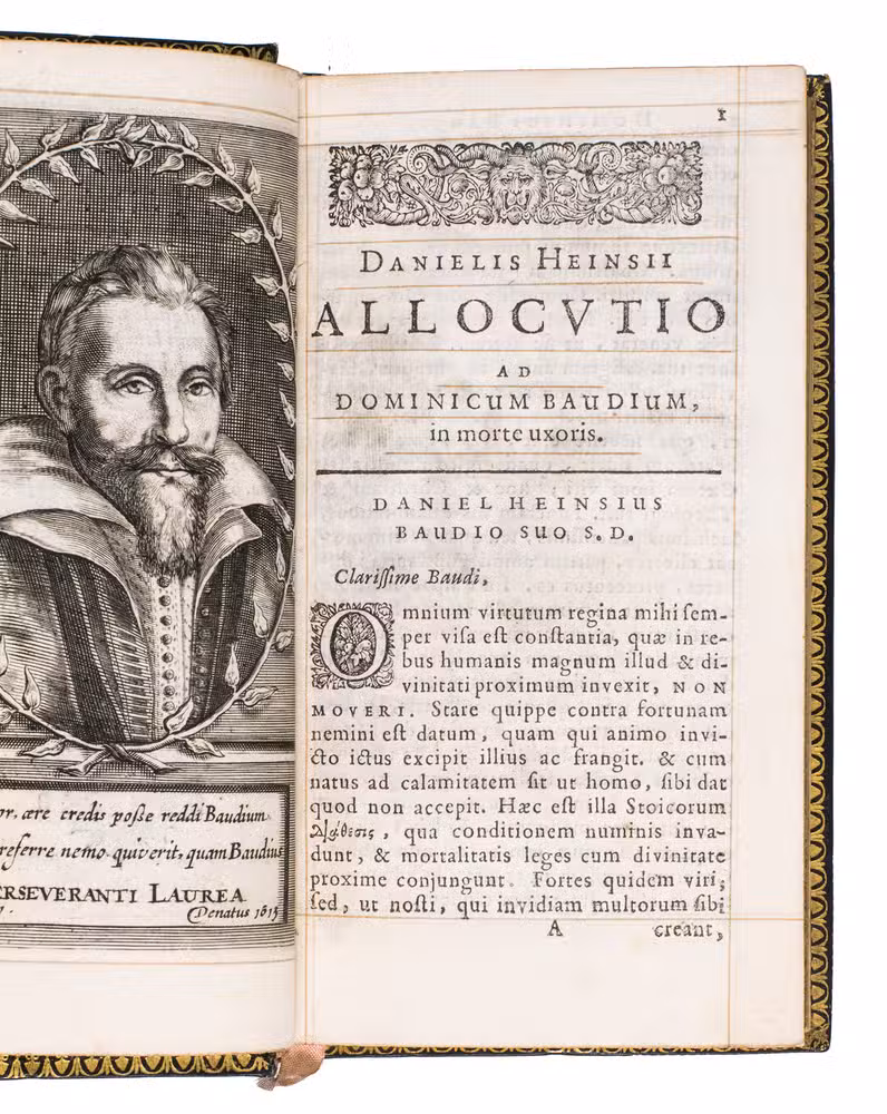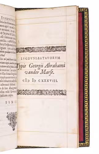 Leiden, Joris Abrahamsz vander Marse for Franciscus Hegerus & Hackius, 1638. 12mo. With a woodcut vignette on the title page, several decorated woodcut initials, and woodcut head- and tailpieces, each page has been ruled by hand in reddish brown ink. 19th-century gold-tooled dark blue-green morocco. [12], 518, [1], [1 blank] pp.