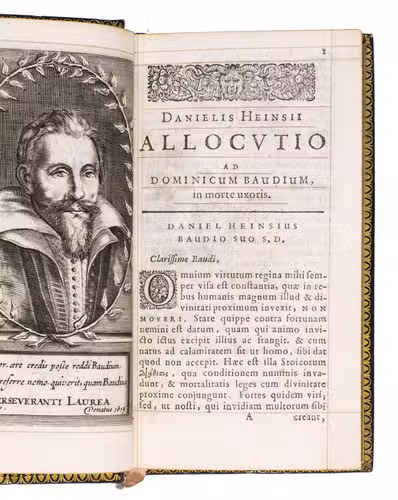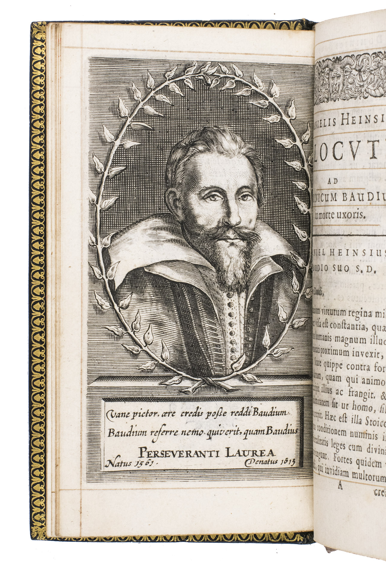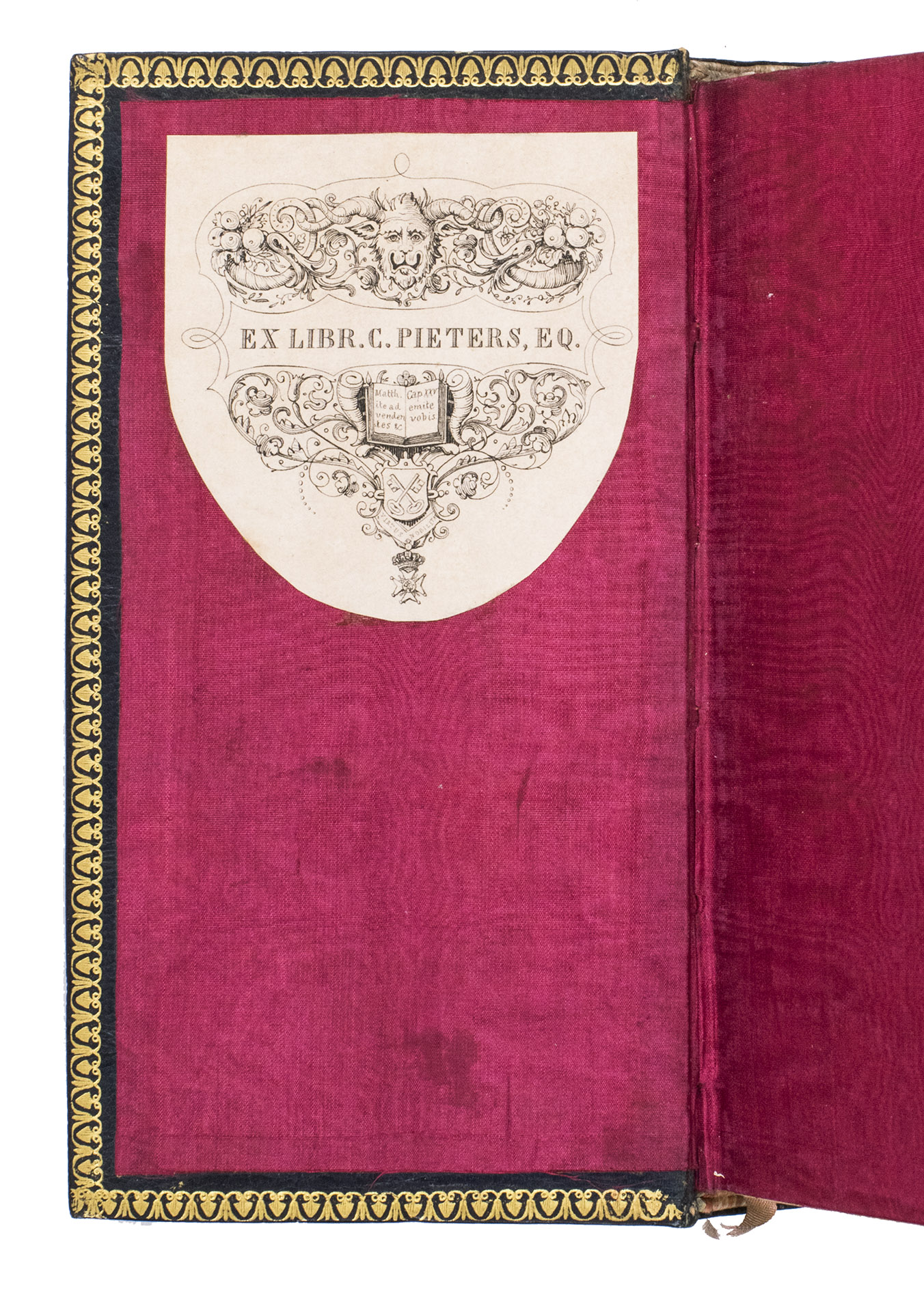 With the bookplate of C. Peeters, the well-known bibliographer and author of the Annales des Elzevier, mounted on the front pastedown. The binding is in excellent condition. The title-page is lightly browned and soiled, occasional mild foxing on some of the leaves. Otherwise in good condition. Gay, I, p. 103; Haag, II, p. 27 ("très recherché"); Nodier, p. 5; Pieters, p. 237, no. 1; STCN 833592548 (5 copies); USTC 1028538 (5 copies); Willems, no. 961 (variant 1); cf. Grootens, Dom. Baudius. Een levensschets (1942); M. Roscam Abbing & P. Tuynman, Petrus Scriverius Harlemensis (2018), p. 266 (1638A).