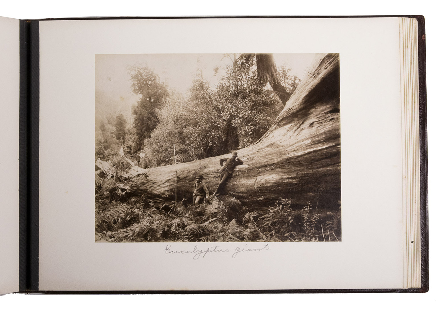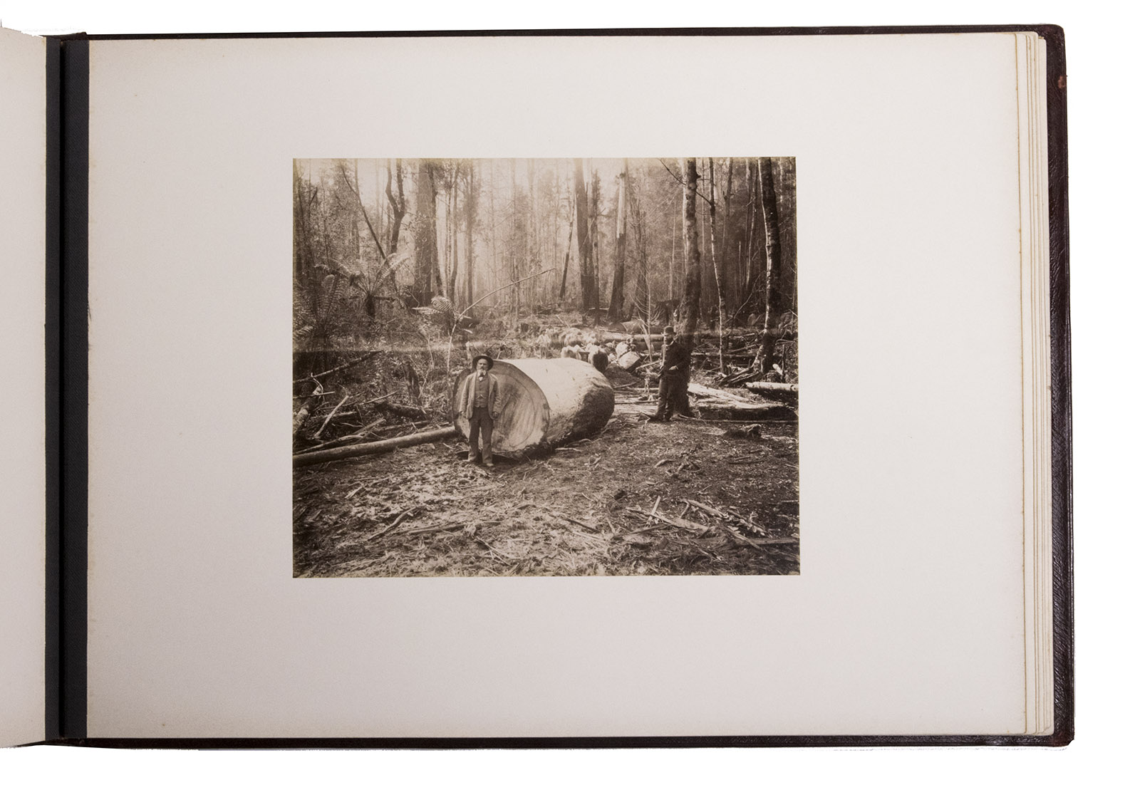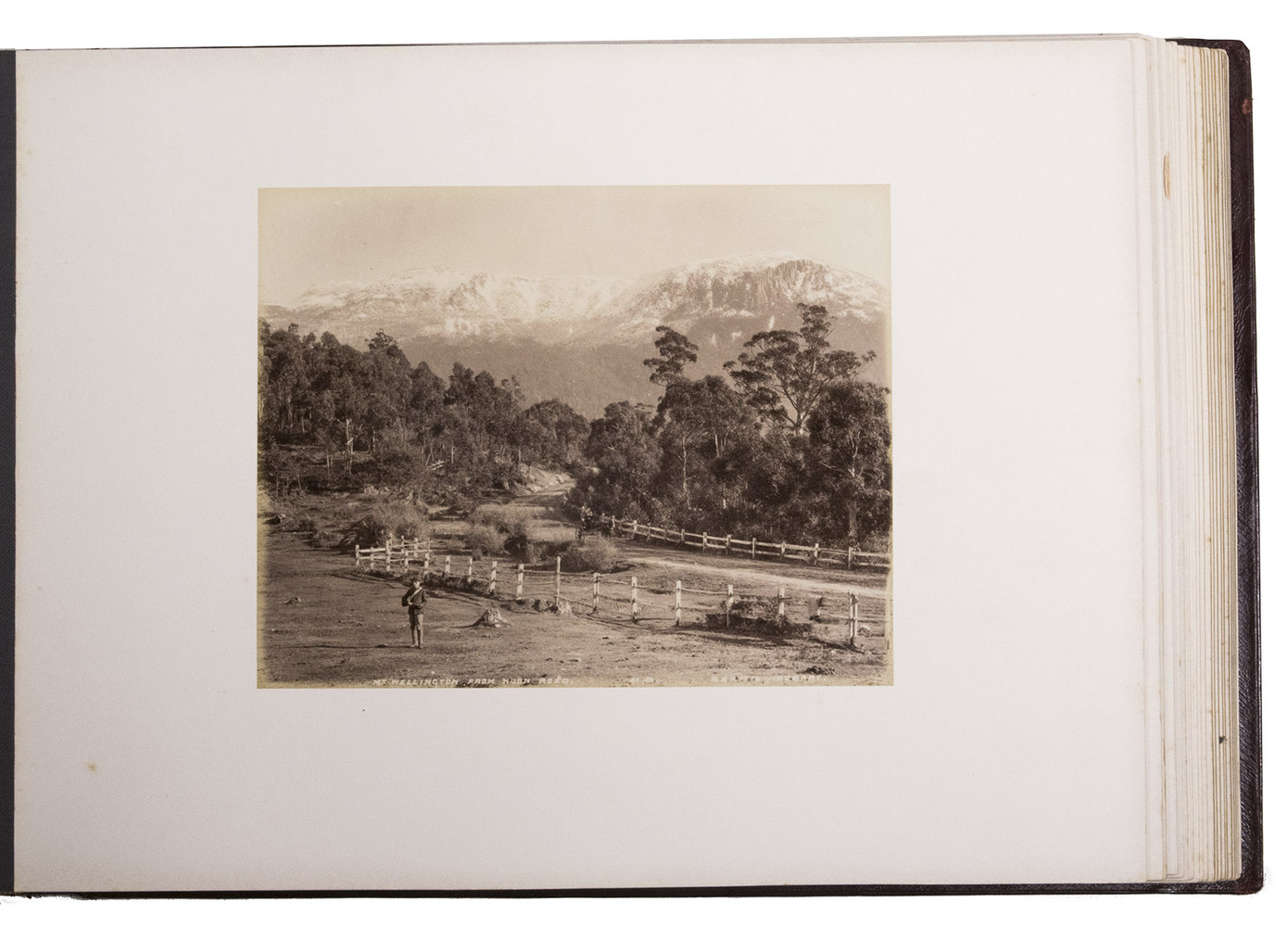 Beautifully bound album with a magnificent collection of 32 original photographs of Tasmania, made by John Watt Beattie (1859-1930) at the end of the 19th century. Beattie arrived in Tasmania in 1879 as an amateur dry-plate photographer of scenic views. He began to work with the Anson Brothers in 1882. In 1892, Beattie bought out the Anson Brothers' very large collection of large format studio portraits and negatives. The photographs include 10 views of Hobart and surroundings (including a view from the bay, a photograph of an original sketch by an eye-witness: "The first days of Hobart, Collins Camp, Sullivan's Cove, Feb. 1804", Elizabeth Street, Cathedral, Bellerive), Mount Wellington with hunter, Mount Ida, Lake St. Clair (3), Mount Byron & Cuvier, giant eucalyptus giant, cedar trees on way to Great Lake, Mount King William, from track to Arrowsmith, Track to Fern Tree Bower, forest views, Mount Olympus from Laura Creek, King Williams Pines, Lake Marion, Garrs Tree Hill track, Hartz Mountains, etc.