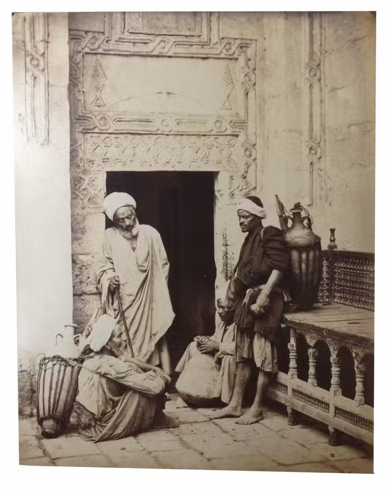 Large and beautiful photographs by Bechard: excellent vintage prints, mostly in superior condition. They represent the popular Egyptian and Nubian types, frequently in close-ups. Nissan N. Perez states that this part of the work of a photographer specializing in views of sites and monuments "has escaped general attention" (cf. Focus East, p. 123, reproducing the photograph of water carriers resting). Includes: a scribe; a sheikh reading the Qur'an, merchants and grocers, a group of ulemas (religious scholars) reading the Qur'an, an Arab drawing water, whirling dervishes, Arab peasants (a fellah carrying water), a sheikh going to the mosque, a game of Mangala, water carriers, mat manufacturers, Sheikh Sadad, a descendant of Mohammed, a falconer, washerwomen, an Arabic singer, a young fellah, a Darabouka player, labourers, a public fountain, a beggar, Arabs at prayer, Arabic coffee, etc.