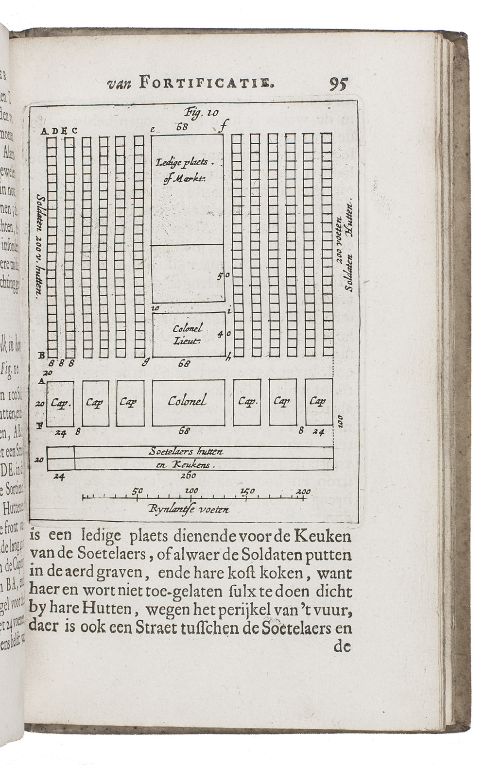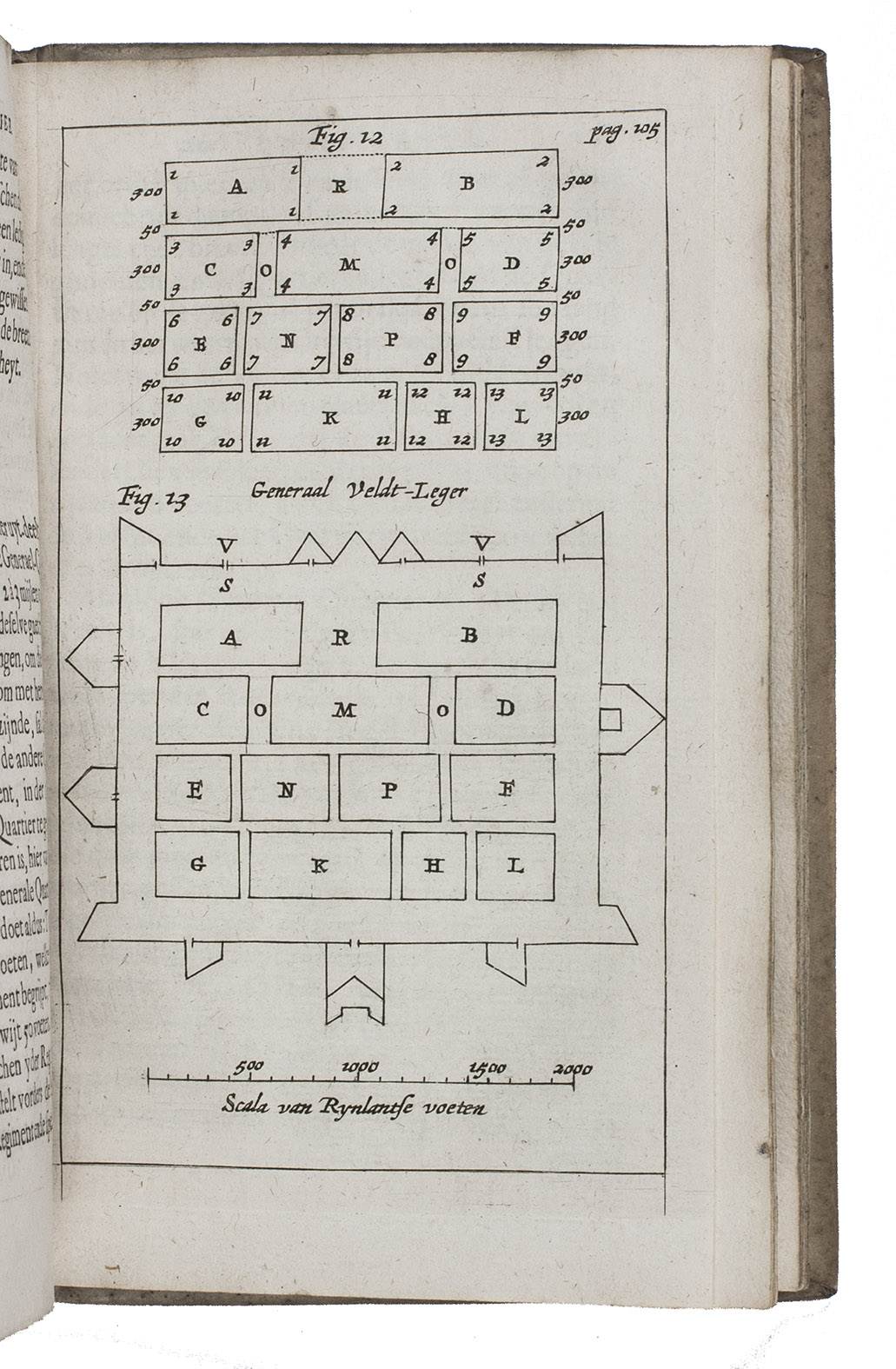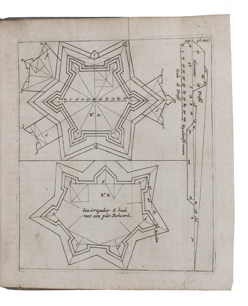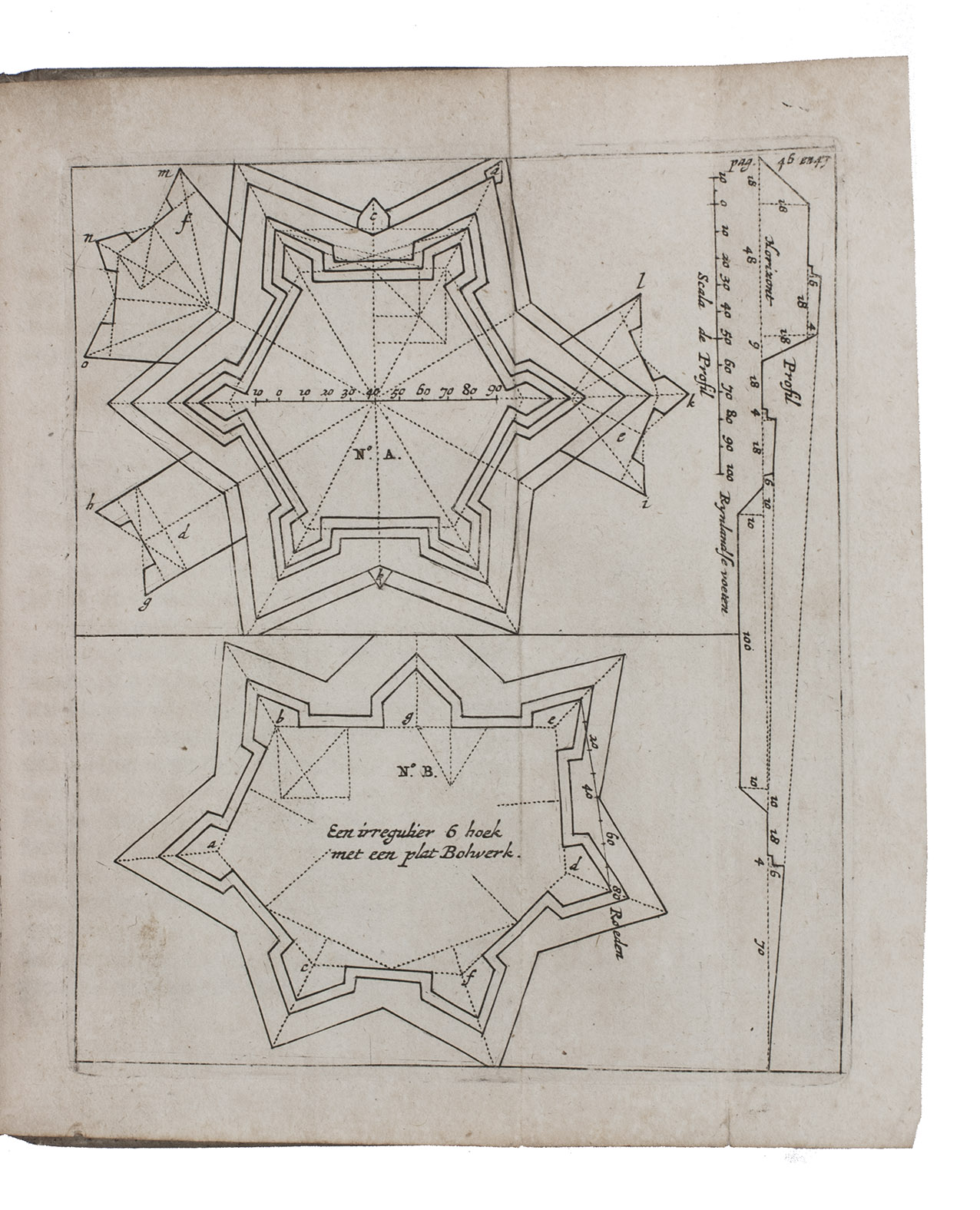 Rare Dutch translation of a work on fortification giving a very detailed description of the mathematical problems encountered in designing and building fortifications. It was originally published in German in 1664 by the German military engineer Peter Becker. The translation is dedicated to Prince William Hendrik of Nassau.
