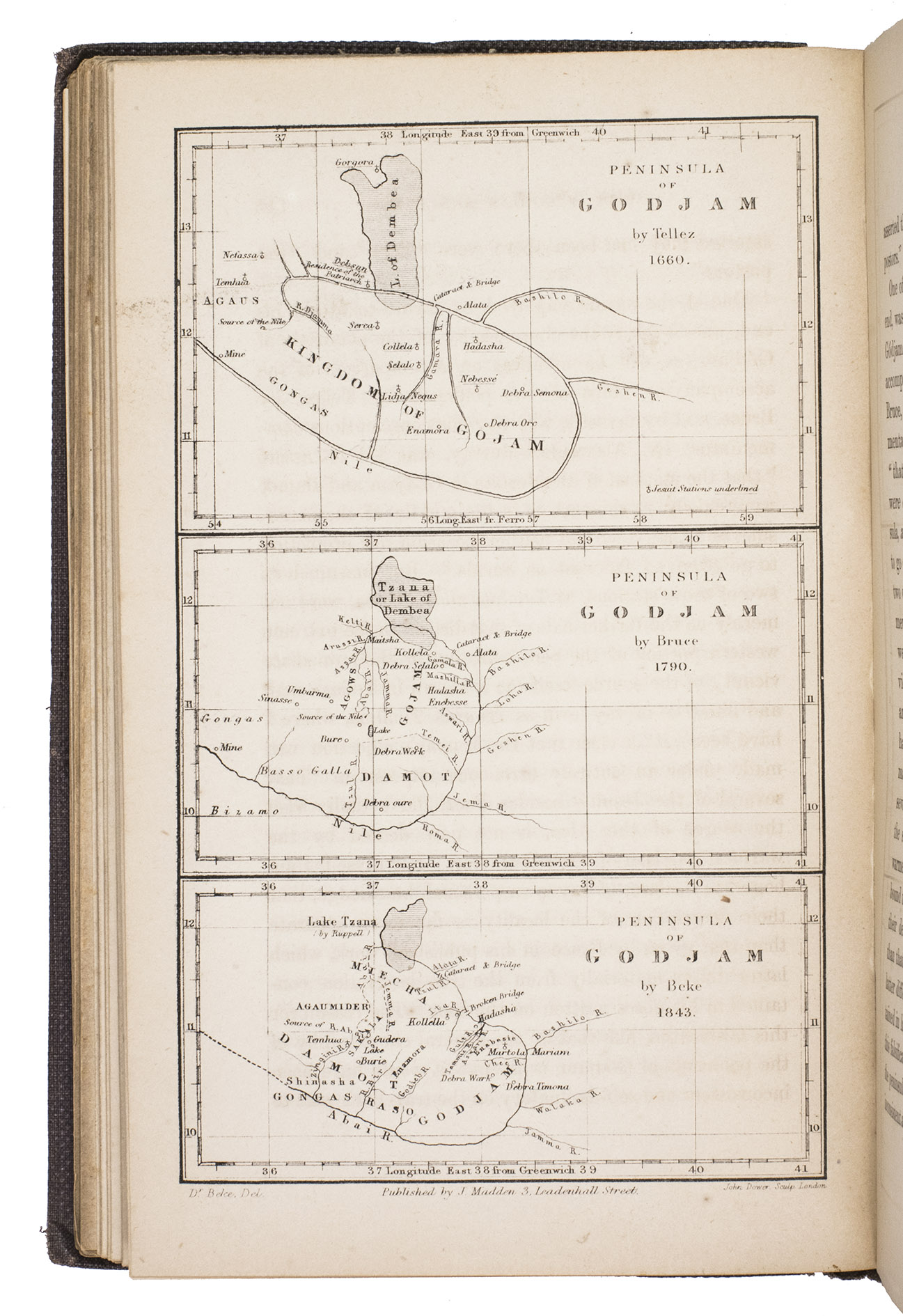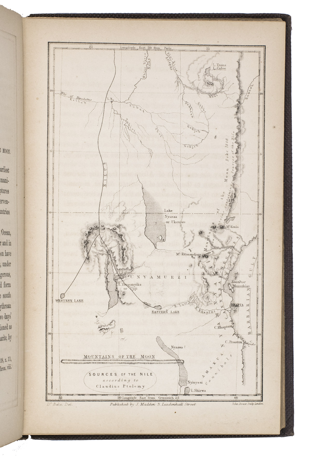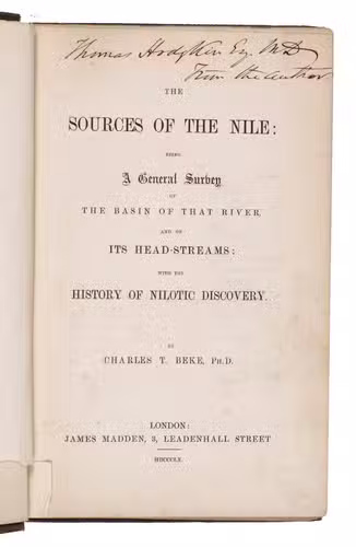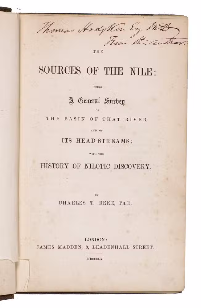 Dedication copy of the first edition of a survey on the geography of the Nile and it's sources. Charles Tilstone Beke (1800-1874) was an English traveller and geographer, best-known for his explorations and studies of the Nile. The present work includes his pioneering essay On the Nile and its Tributaries and contains much new material concerning the latest discoveries in the region, including the data of the expeditions by John Hanning Speke (1827-1864) and Sir Richard Francis Burton (1821-1890). The present copy was given by the author to Thomas Hodgkin, MD (1798-1866), the famous physician, pathologist, and reformer.