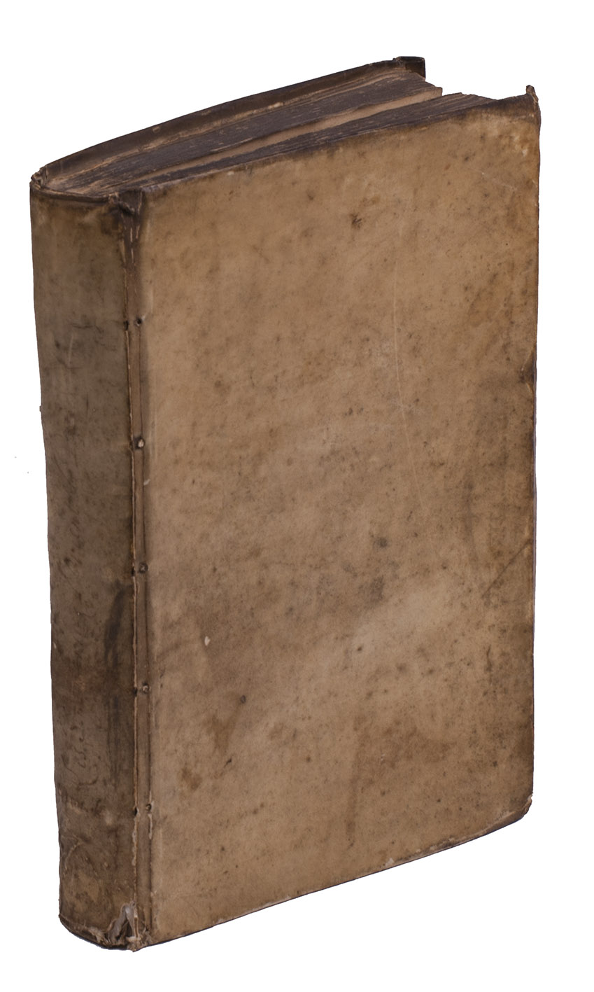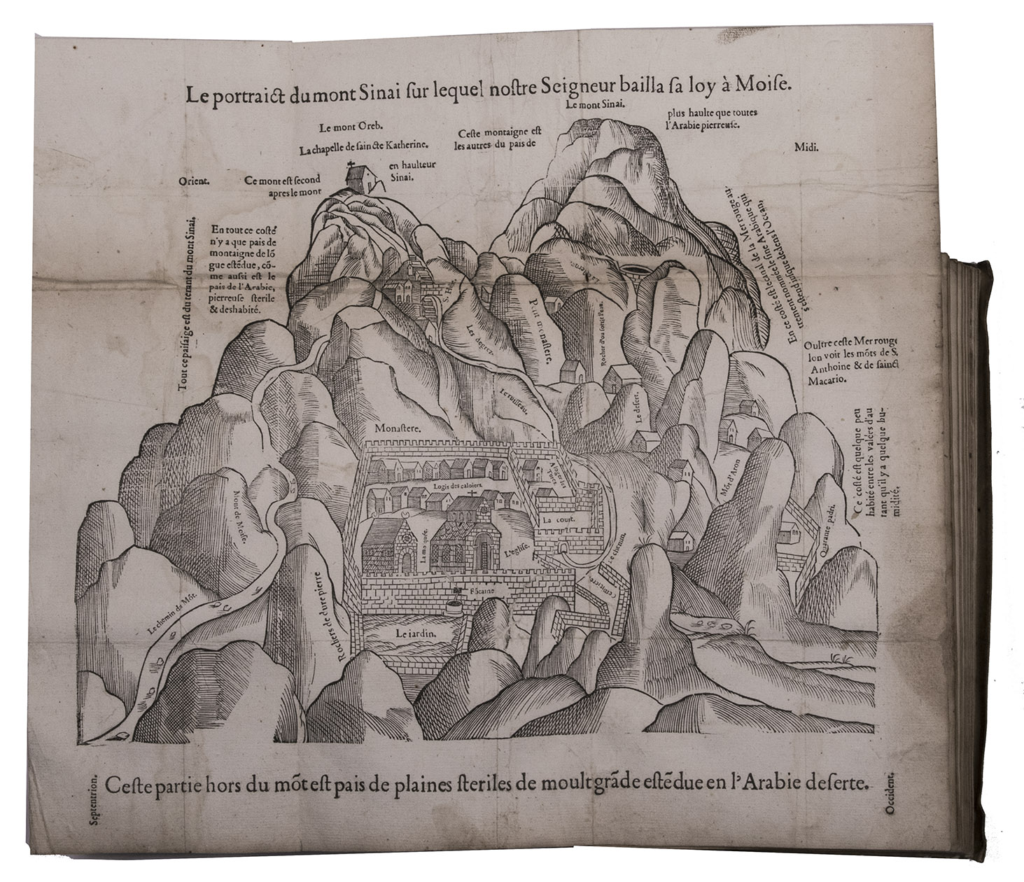 Paris, Guillaume Cavellat (colophon: printed by Benoist Prévost for Gilles Corozet, Guillaume Cavellat), 1555. 3 parts in 1 volume. 4to. With title in woodcut border with Cavellet's device and initials at the foot, each part-title with Cavellet's woodcut device, 1 folding woodcut map (31.5 x 35 cm) showing Mount Sinai, 44 woodcuts in the text (including a portrait of the author by Geoffroy Tory), and numerous fine decorated initials. Overlapping vellum (ca. 1600?). [12], 212, [1] ll.