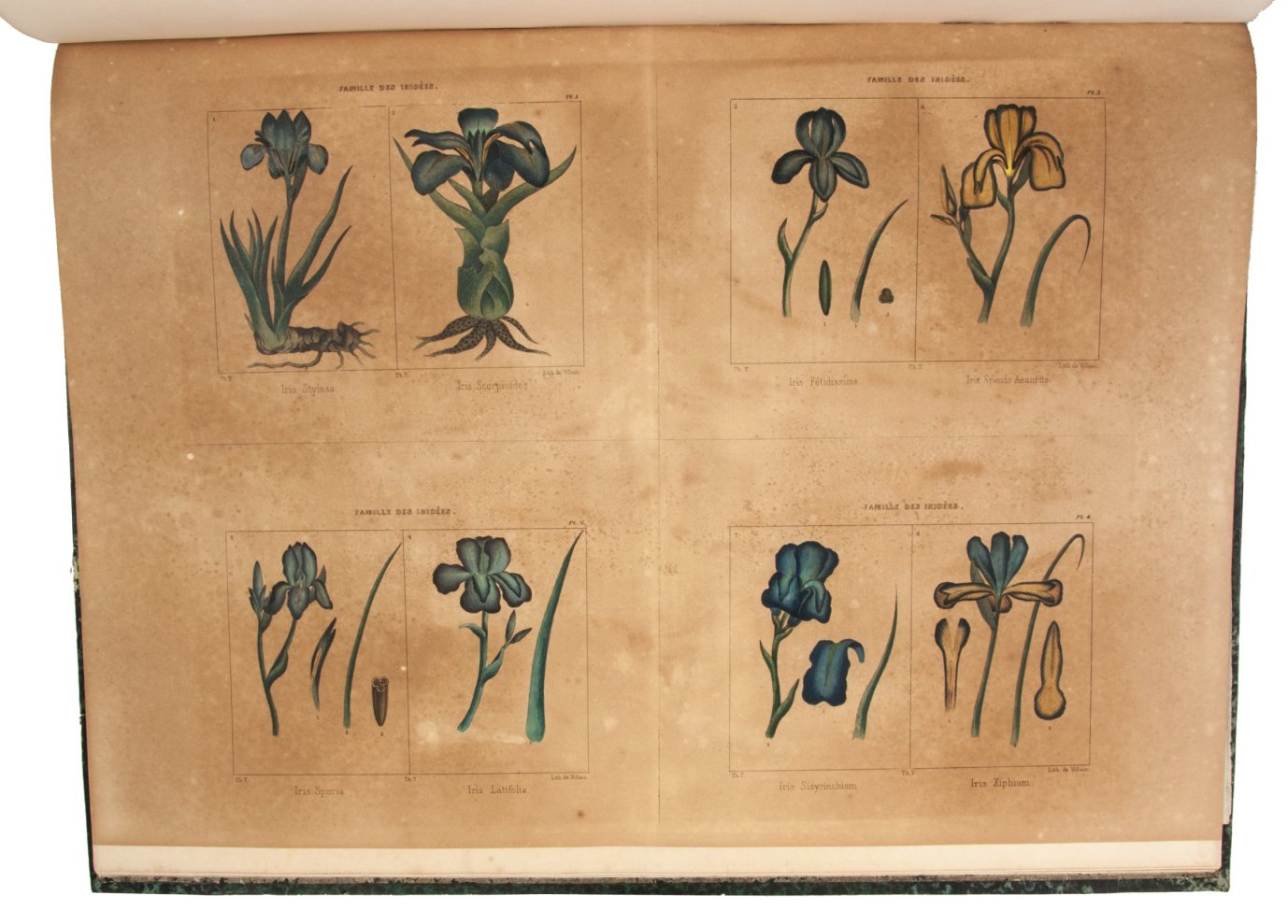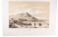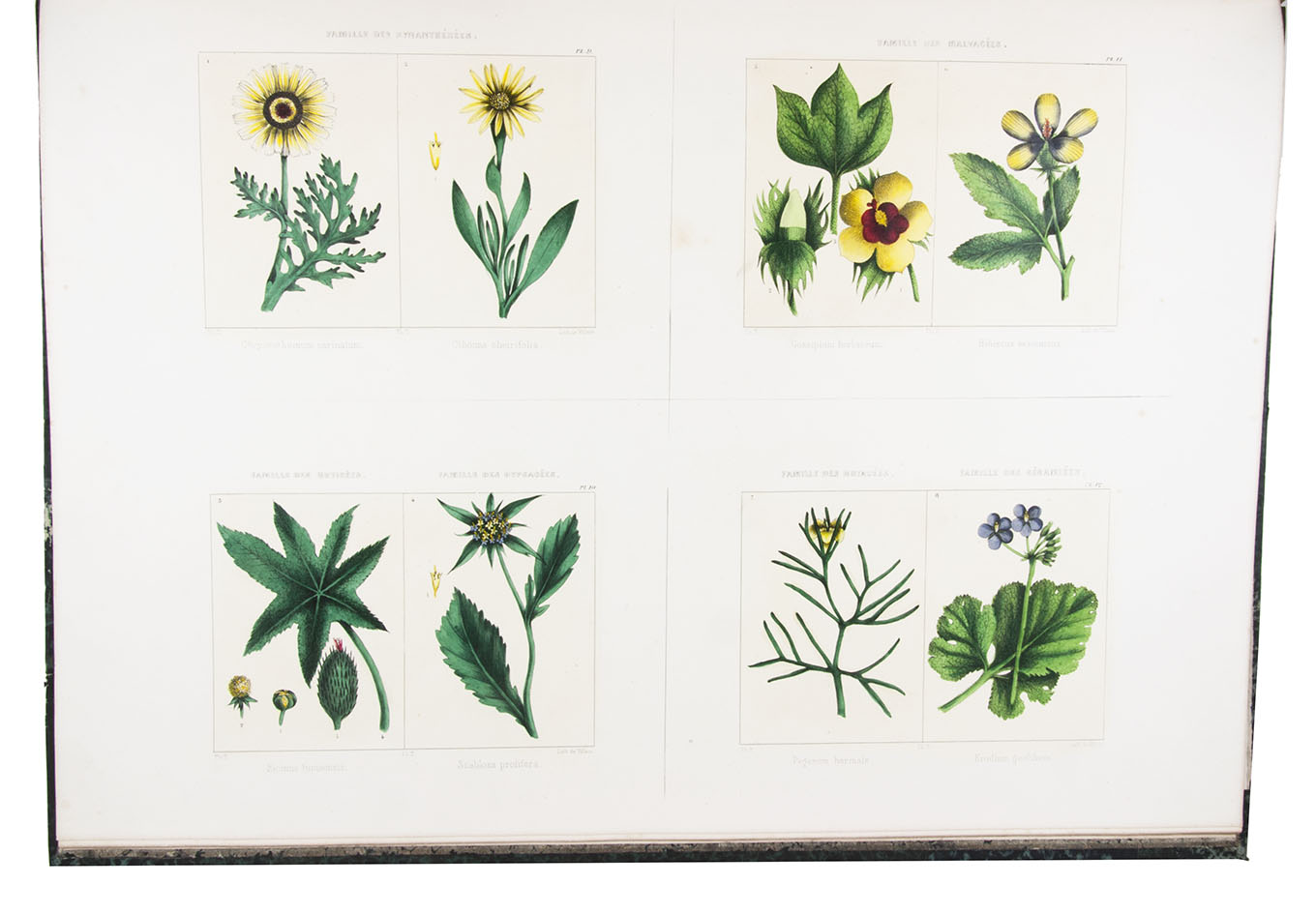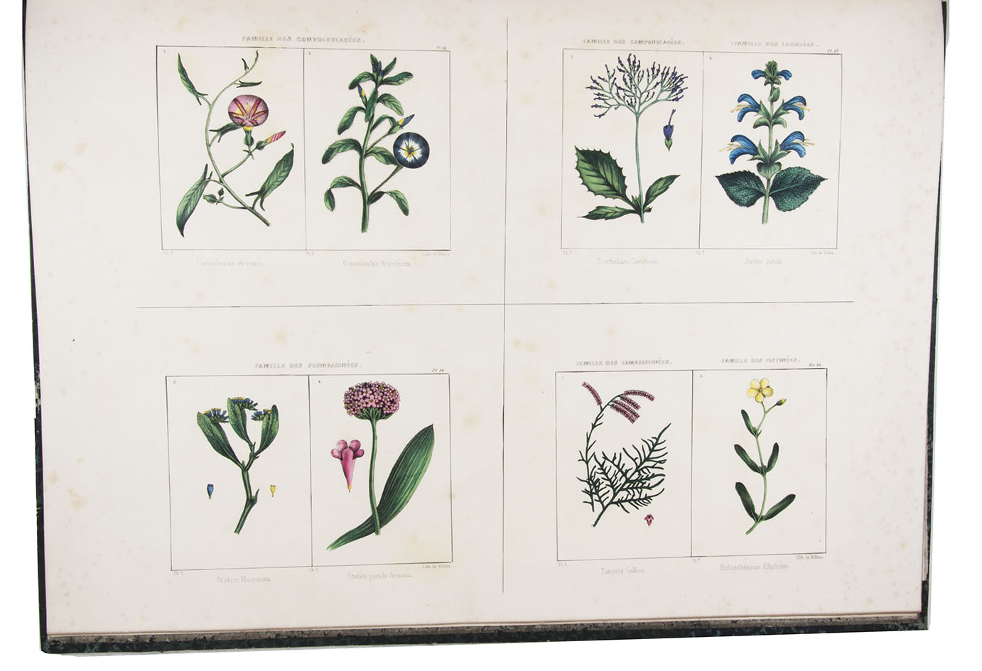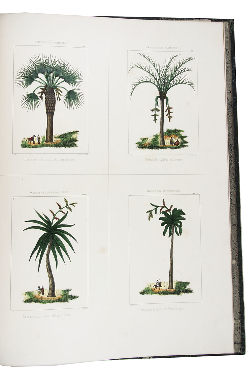 Paris, Delahaye (part-titles: printed by Dondey-Dupré), 1843. 5 parts in 3 volumes. Royal 1mo (57 x 42.5 cm). With chromo-lithographed general title-page, tinted lithographed frontispiece, 2 lithographed maps hand-coloured in outline, and 133 lithographed plates (image size up to 44.5 x 30.5 cm, nearly all non-botanical ones tinted and one with 2 chromolithographed and hand-coloured costume prints) by and after artists including Charles Bour, Eugène Flandin, Félix Emmanuel Henri Philippoteaux and Denis Auguste Marie Raffet. Also with lithographed views (and a few lithographed maps) printed in the tail margins at the ends of many chapters, and 45 white-on-black wood-engravings of coins (each with obverse and reverse) in the text. The 72 botanical illustrations on the last 10 lithographed plates are coloured by hand and highlighted with gum arabic. The non-botanical plates have the publisher's embossed stamp in the foot margin. Contemporary, uniform dark green half goatskin morocco with a gold-tooled spine. XIV, [3], [1 blank], 80; [3], [1 blank], 68; [3], [1 blank], 42; [3], [1 blank], 21, [1 blank], 18, 16, [1], [1 blank] pp. including the chromolithographed title-page.