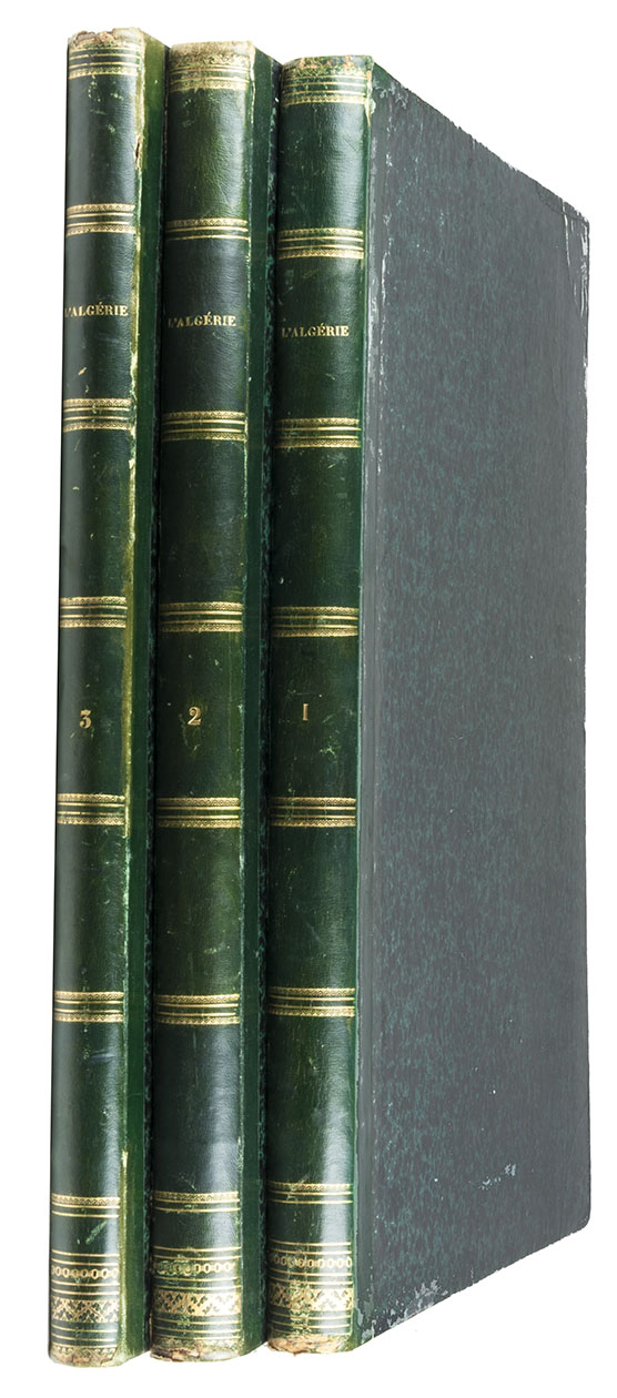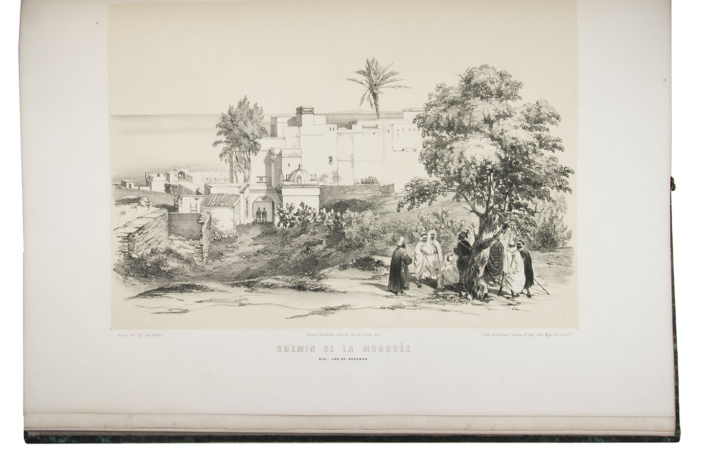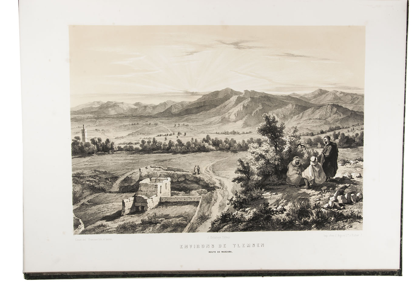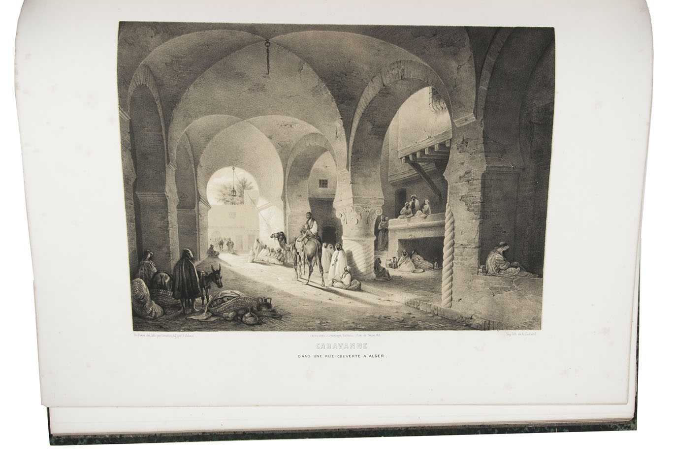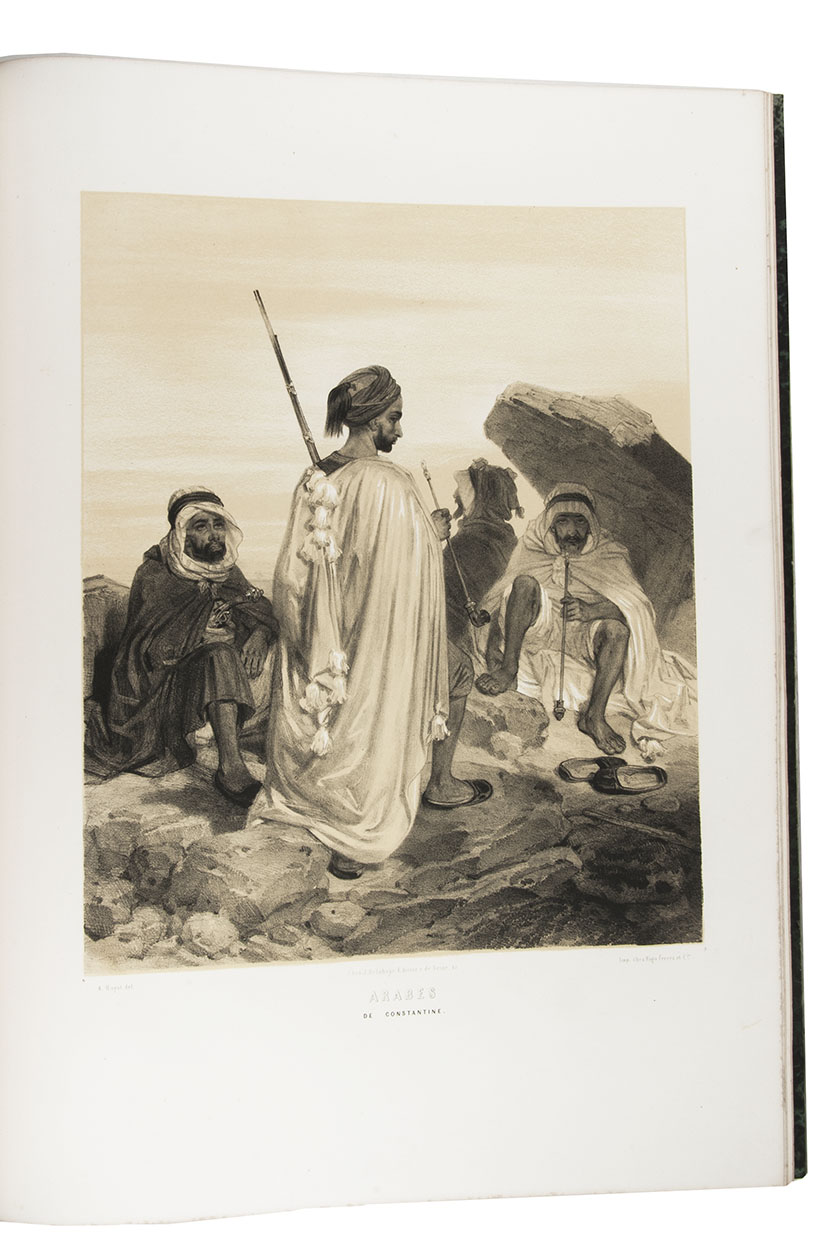 First and only edition of a rare and extensive work on Algeria, with hundreds of stunning and very skilfully executed illustrations, the text by the conservator of the library in the Museum of Algiers, Louis Adrien Berbrugger (1801-1869). Parts 1 to 4 cover the four Algerian provinces: Alger, Oran, Bone and Constantine, while part 5 is subdivided into ethnic groups (Jews, Turks, Moors, Berbers and some of the nomadic peoples), coins and flora, with the plants arranged according to Jussieu's system. The 133 beautifully executed lithographed plates also show city views, landscapes, portraits, costumes, scenes from daily life with people from a wide variety of professions and various layers of society, etc. They give a lively and realistic portrait of a country in which many different peoples and cultures coexist. They also show Algeria part way through its gradual conquest by France in the years 1830 to 1848, capturing and preserving images of both the survivals from hundreds of years as an Ottoman state and the early interactions with European society.