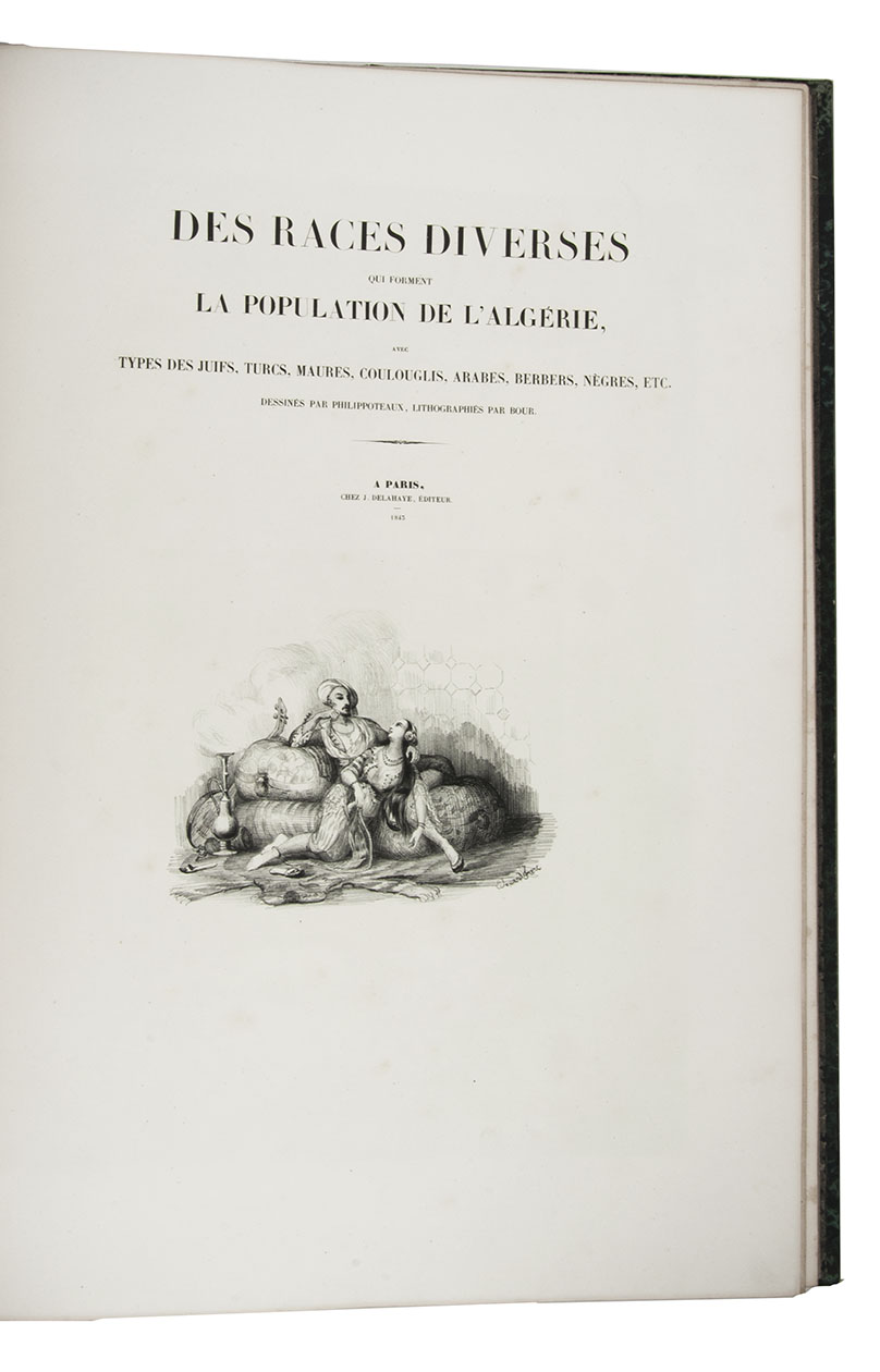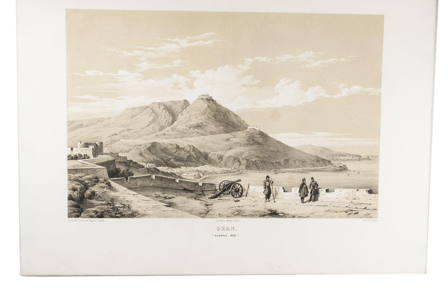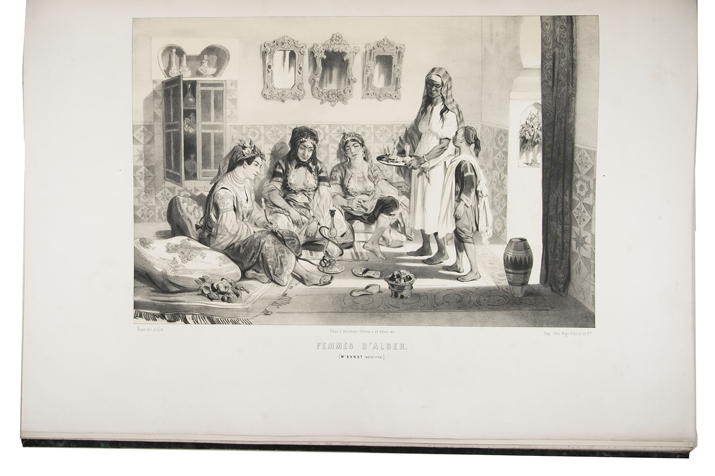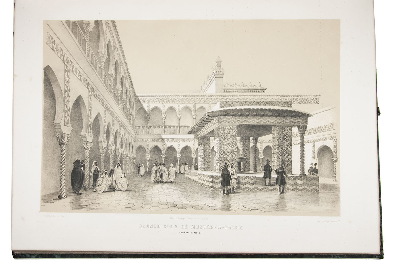 First and only edition of a rare and extensive work on Algeria, with hundreds of stunning and very skilfully executed illustrations, the text by the conservator of the library in the Museum of Algiers, Louis Adrien Berbrugger (1801-1869). Parts 1 to 4 cover the four Algerian provinces: Alger, Oran, Bone and Constantine, while part 5 is subdivided into ethnic groups (Jews, Turks, Moors, Berbers and some of the nomadic peoples), coins and flora, with the plants arranged according to Jussieu's system. The 133 beautifully executed lithographed plates also show city views, landscapes, portraits, costumes, scenes from daily life with people from a wide variety of professions and various layers of society, etc. They give a lively and realistic portrait of a country in which many different peoples and cultures coexist. They also show Algeria part way through its gradual conquest by France in the years 1830 to 1848, capturing and preserving images of both the survivals from hundreds of years as an Ottoman state and the early interactions with European society.