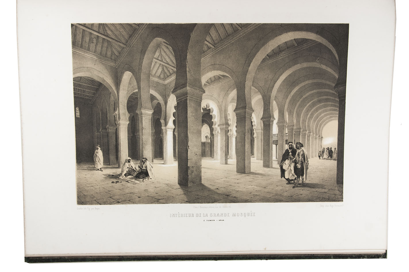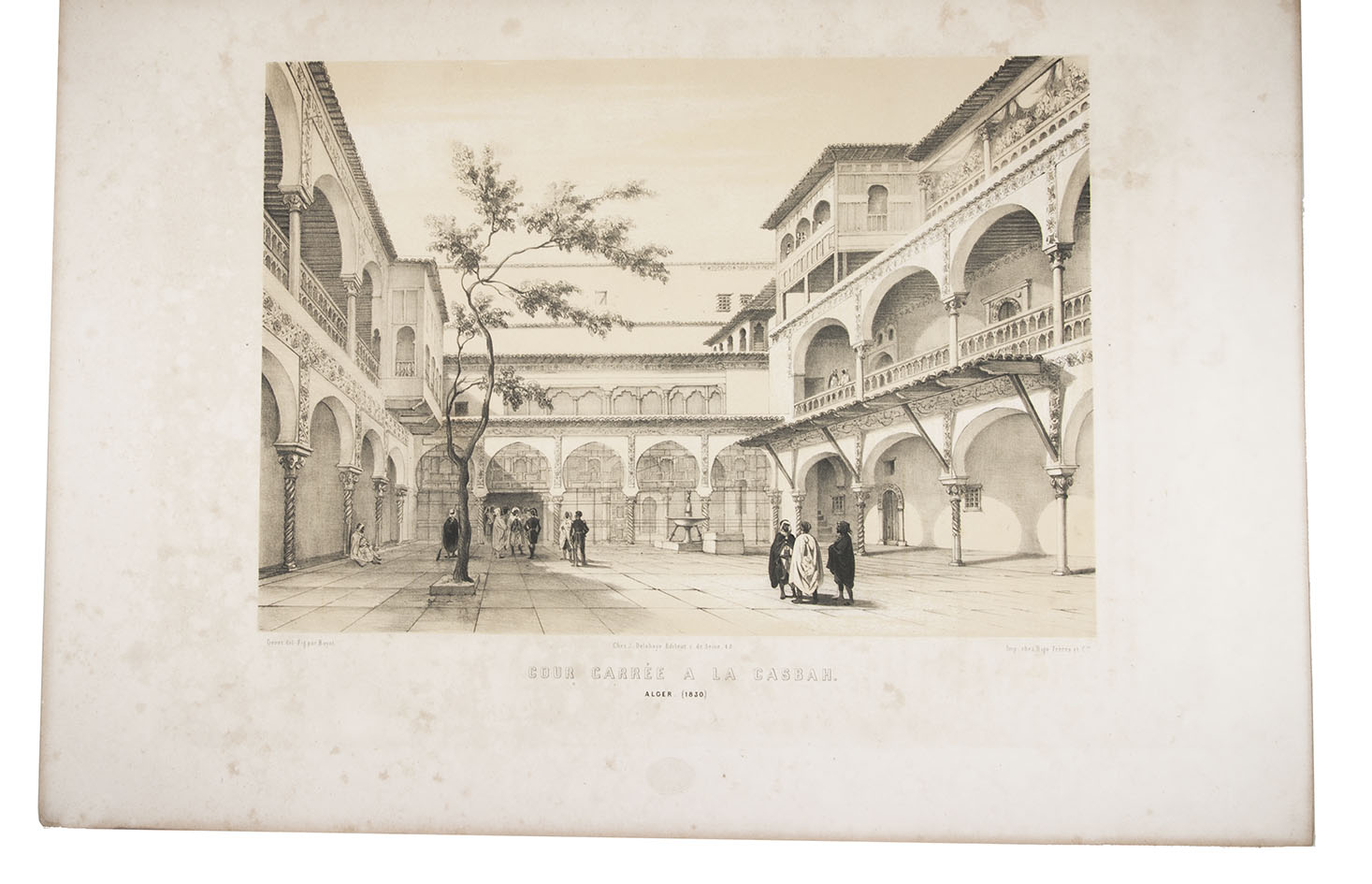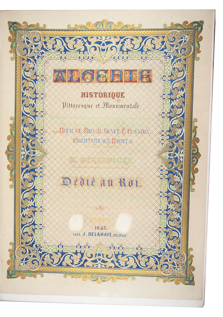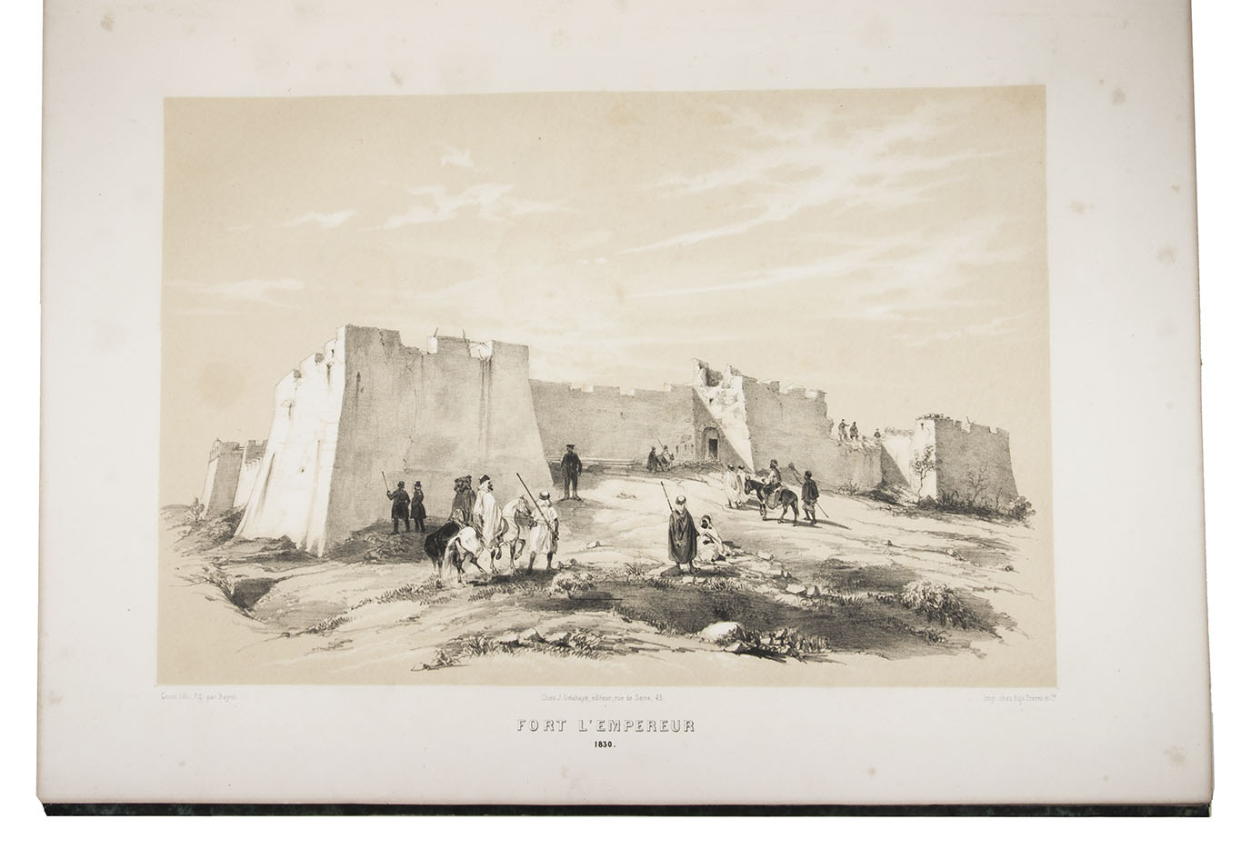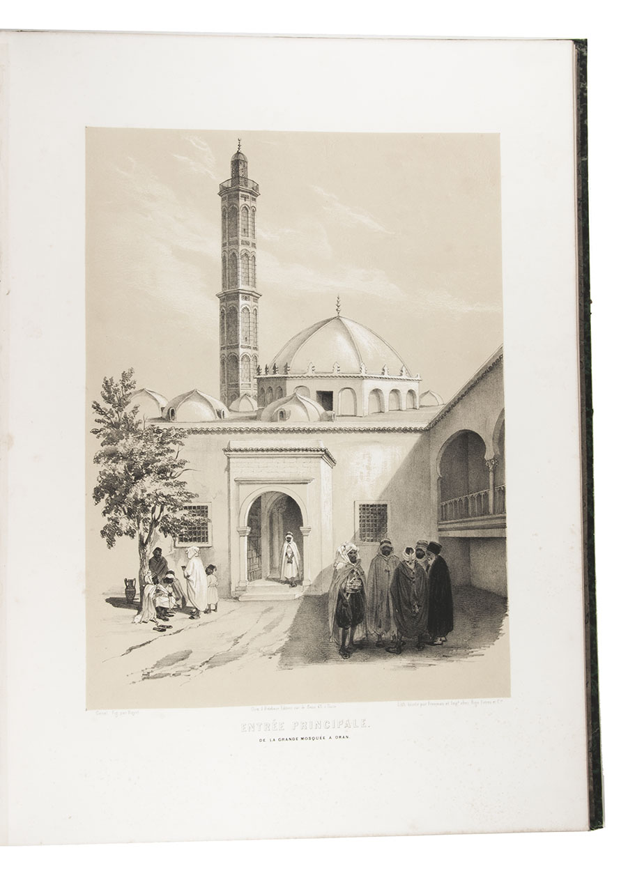 First and only edition of a rare and extensive work on Algeria, with hundreds of stunning and very skilfully executed illustrations, the text by the conservator of the library in the Museum of Algiers, Louis Adrien Berbrugger (1801-1869). Parts 1 to 4 cover the four Algerian provinces: Alger, Oran, Bone and Constantine, while part 5 is subdivided into ethnic groups (Jews, Turks, Moors, Berbers and some of the nomadic peoples), coins and flora, with the plants arranged according to Jussieu's system. The 133 beautifully executed lithographed plates also show city views, landscapes, portraits, costumes, scenes from daily life with people from a wide variety of professions and various layers of society, etc. They give a lively and realistic portrait of a country in which many different peoples and cultures coexist. They also show Algeria part way through its gradual conquest by France in the years 1830 to 1848, capturing and preserving images of both the survivals from hundreds of years as an Ottoman state and the early interactions with European society.