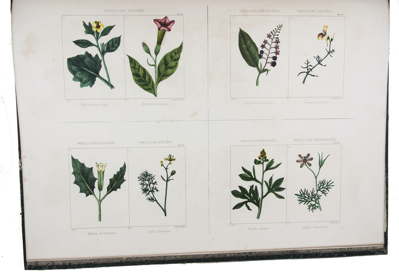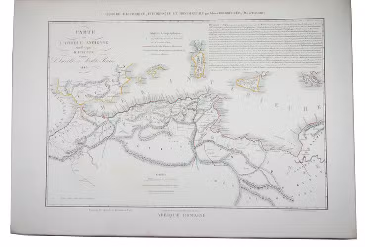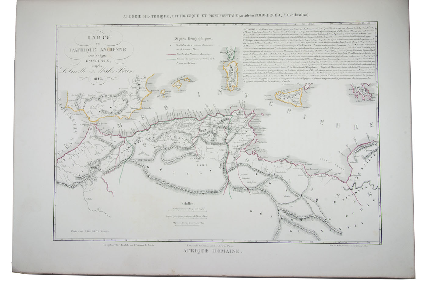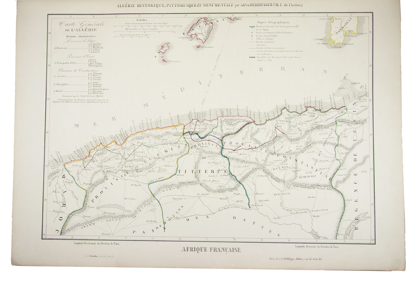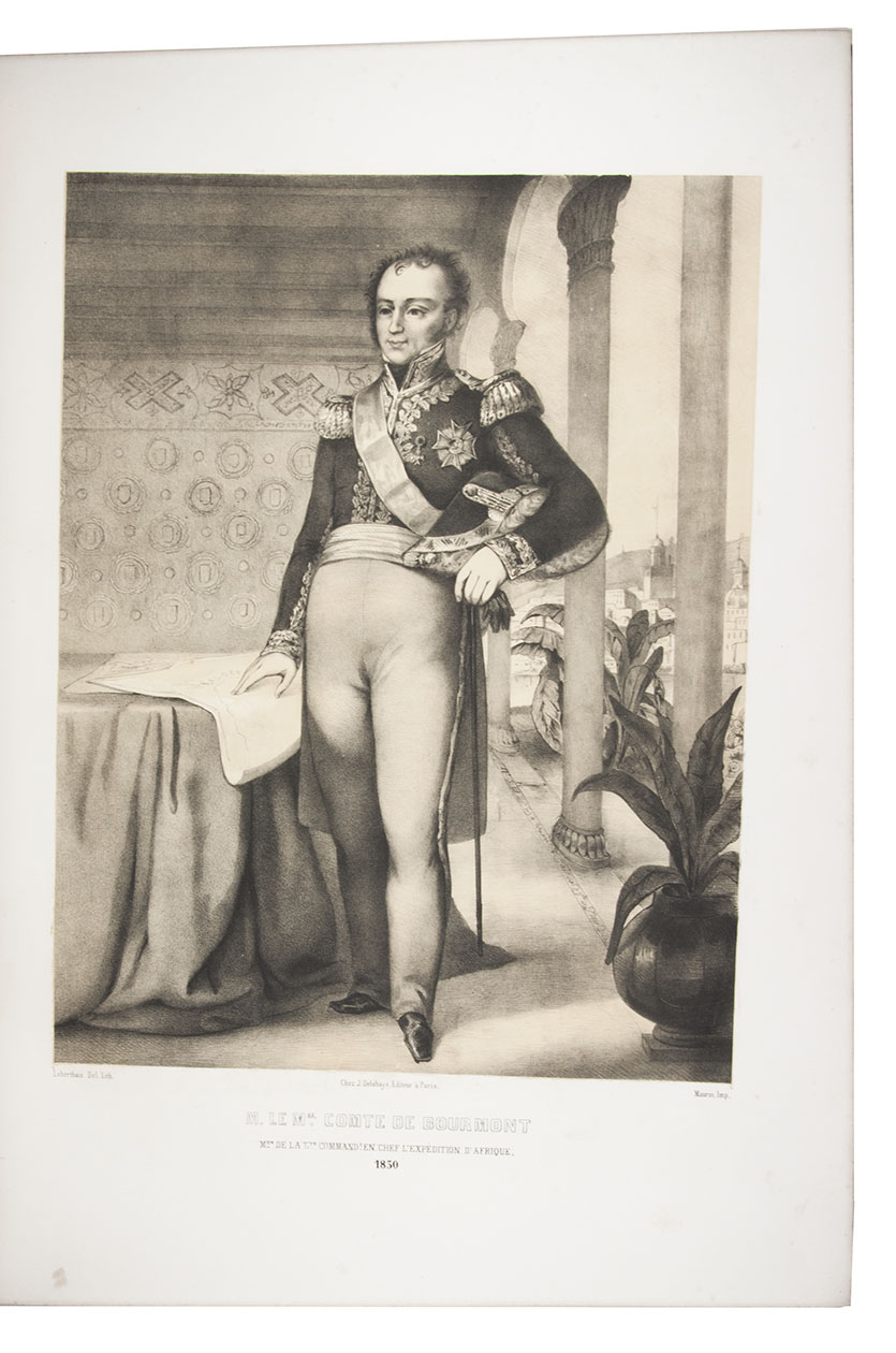 First and only edition of a rare and extensive work on Algeria, with hundreds of stunning and very skilfully executed illustrations, the text by the conservator of the library in the Museum of Algiers, Louis Adrien Berbrugger (1801-1869). Parts 1 to 4 cover the four Algerian provinces: Alger, Oran, Bone and Constantine, while part 5 is subdivided into ethnic groups (Jews, Turks, Moors, Berbers and some of the nomadic peoples), coins and flora, with the plants arranged according to Jussieu's system. The 133 beautifully executed lithographed plates also show city views, landscapes, portraits, costumes, scenes from daily life with people from a wide variety of professions and various layers of society, etc. They give a lively and realistic portrait of a country in which many different peoples and cultures coexist. They also show Algeria part way through its gradual conquest by France in the years 1830 to 1848, capturing and preserving images of both the survivals from hundreds of years as an Ottoman state and the early interactions with European society.