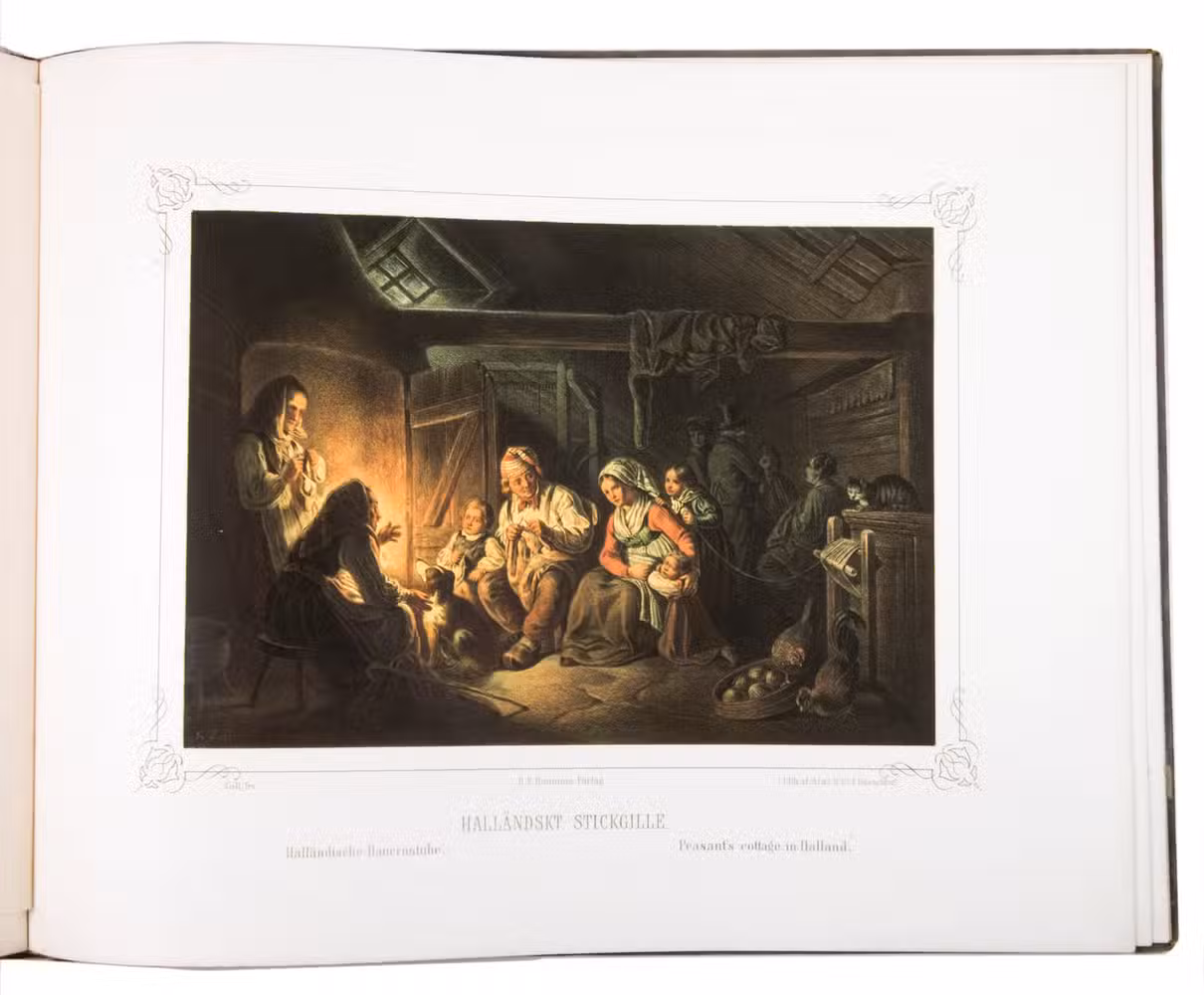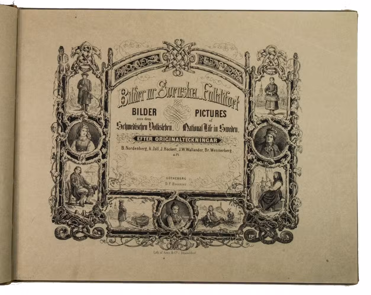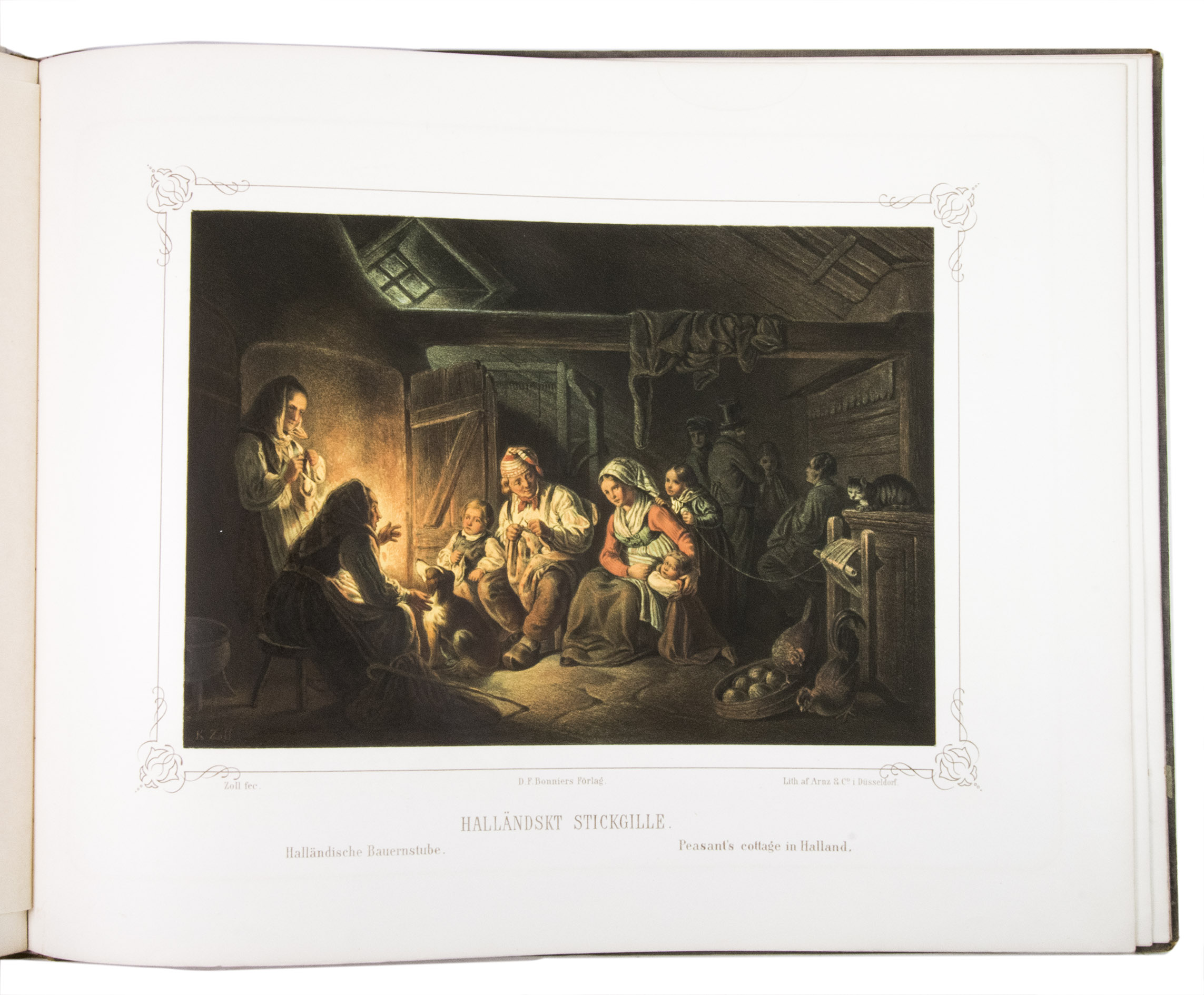 The text was written by Johan August Berg (dates unknown). The plates were lithographed by Arnz & Co. in Düsseldorf, after designs by Bengt Nordenberg (1822-1902), Killian Zoll (1818-1860), Josef Fredrik Höckert (1826-1866), Josef Wilhelm Wallander (1821-1888), and Gunnar Brynolf Wennerberg (1823-1894), who were all well-known Swedish painters specialising in genre scenes. Nordenberg, Zoll, and Wennerberg were members of the Düsseldorf school of painting, which was part of the German romantic movement.