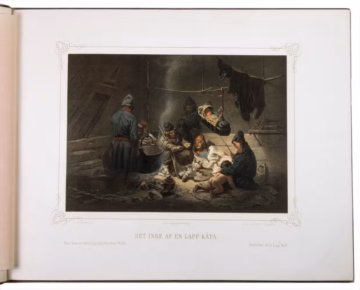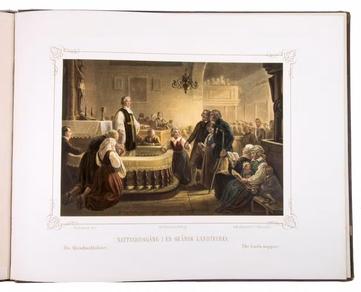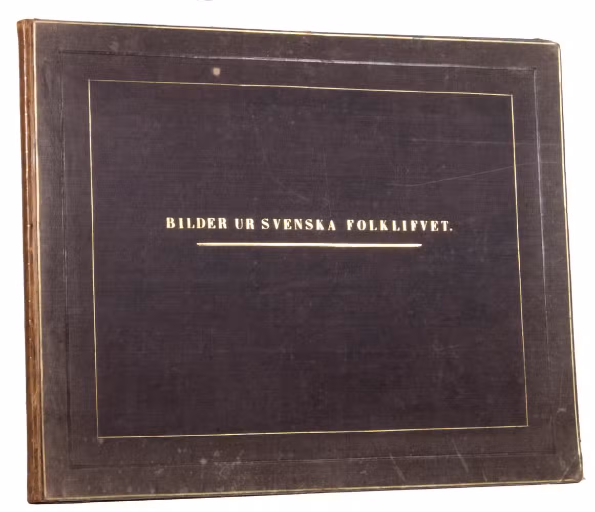 The text was written by Johan August Berg (dates unknown). The plates were lithographed by Arnz & Co. in Düsseldorf, after designs by Bengt Nordenberg (1822-1902), Killian Zoll (1818-1860), Josef Fredrik Höckert (1826-1866), Josef Wilhelm Wallander (1821-1888), and Gunnar Brynolf Wennerberg (1823-1894), who were all well-known Swedish painters specialising in genre scenes. Nordenberg, Zoll, and Wennerberg were members of the Düsseldorf school of painting, which was part of the German romantic movement.